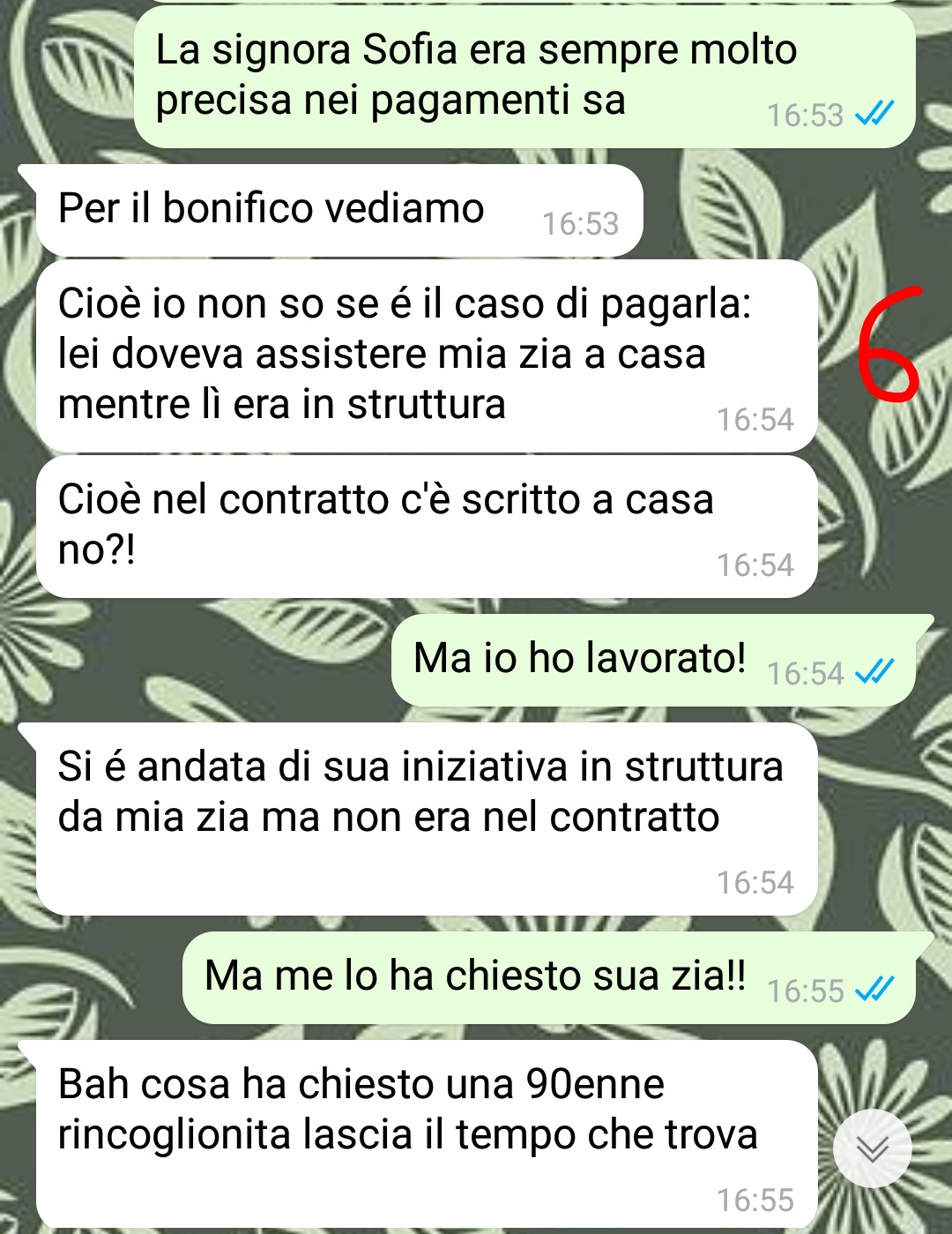 Una nostra fan, Ilda, racconta la sua esperienza come badante della signora Sofia, una donna anziana di 93 anni per cui ha lavorato per quattro anni con un contratto regolare. Nonostante il lavoro fosse impegnativo, a causa dell’età avanzata e delle condizioni di salute della signora, Ilda ricorda con affetto il tempo trascorso insieme, sottolineando il loro buon rapporto e la serenità che caratterizzava la loro convivenza. Sofia, che non aveva parenti stretti, era assistita nella gestione finanziaria da un amministratore che si occupava di pagare lo stipendio di Ilda e fornire quanto necessario per le spese. Ilda spiega che Sofia si preoccupava sempre che lei ricevesse il pagamento con puntualità, un segno di stima e affetto reciproco.