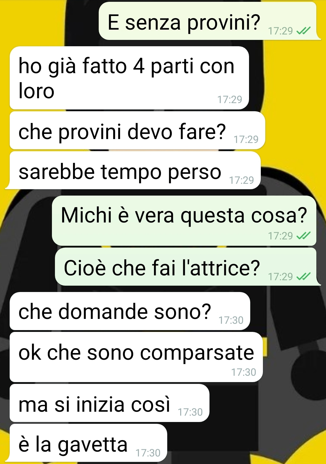 La mia fidanzata è un’attrice in rampa di lancio. Lanciatissima. Poi discutiamo in questa chat, e salta fuori che le cose sono un po’ diverse da come le racconta. Lo sapete che il piombo e l’oro differiscono di solo 3 protoni? Io si, è il mio mestiere. E come uno stupido ho creduto fino ad ora a quello che mi ha raccontato Michela, la mia fidanzata. Mi ha venduto piombo per oro. E la cosa grave è che lei non vede la differenza. Ma la colpa è della sua amica Veronica, che un giorno l’ha convinta ad accompagnarla a fare da comparsa in un filmetto di serie B. Da allora ha mollato l’università per darsi al cinema. Due mesi di intensi lavoro che le hanno fruttato 4 ingaggi. Oggi la 5 chiamata. Ma ho voluto vederci chiaro. Che stando a lei è ormai lanciatissima a diventare una star. Ci vuole solo un po’ di tempo. La realtà che gli ho tirato fuori è ben diversa, decisamente meno rosea. Anzi decisamente di piombo… ma lei non sembra capirlo. Come la riporto alla cruda realtà?