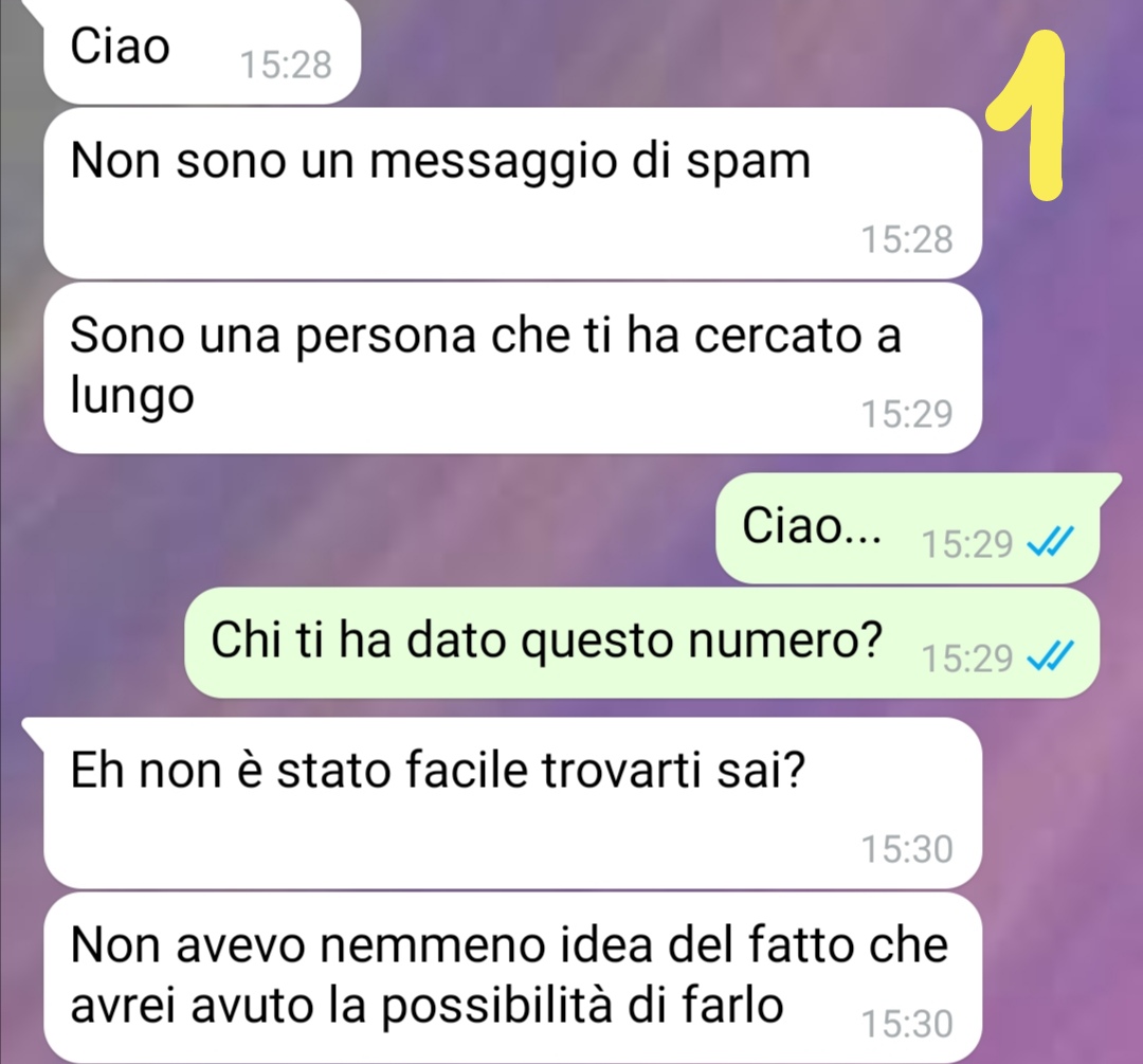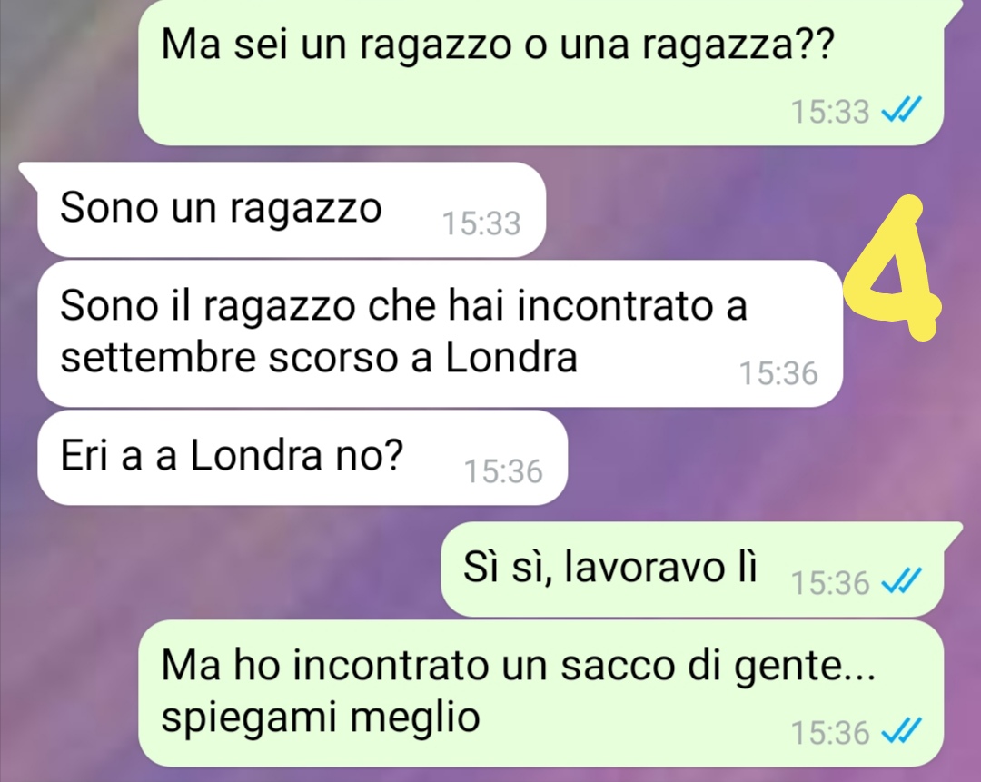 Io questa cosa non potevo proprio tenerla per me. Davvero. Avevo bisogno di condividerla e dato che la maggior parte si è svolta su una chat WhatsApp, ho pensato che voi foste la pagina perfetta, Premetto che sto passando un periodo molto brutto. Non esattamente io ma la mia famiglia, mio padre in particolare. Purtroppo. Fino a qualche mese fa le cose andavano alla grande. Mi ero trasferita a Londra per un corso di studi e nel frattempo lavoravo in un locale per non pesare sulla mia famiglia. Poi ricevo una chiamata, un pomeriggio, e improvvisamente tutto comincia a cambiare. Devo rientrare urgentemente in Italia. E mi dispiace molto lasciare Londra, un po’ perché là io avevo trovato la mia dimensione e la mia libertà anche, se vogliamo. E di cose me ne erano successe tante, alcune davvero fuori dall’ordinario. Ed è proprio da una di quelle cosa fuori dall’ordinario che in realtà ha origine tutto. Soprattutto la chat che vi mando. Oddio, spero che ci abbiate capito qualcosa. Ma credo che leggendo la chat capirete senza dubbio meglio!