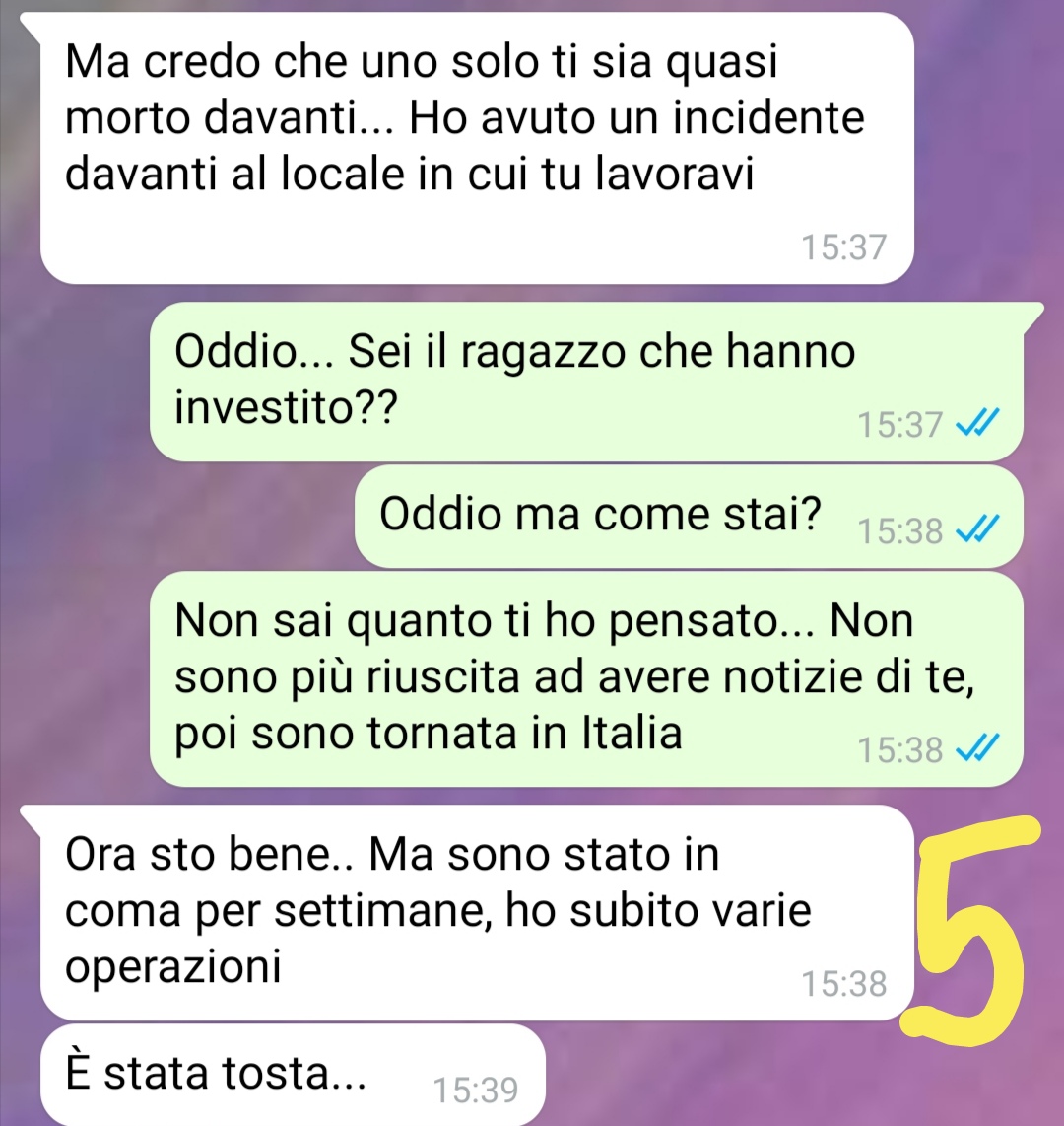 Una nostra fan ha voluto condividere una storia molto personale, nata in un periodo complicato della sua vita, e raccontata in gran parte attraverso una conversazione su WhatsApp che, come spiega lei stessa, non poteva tenere solo per sé. L’amica racconta che fino a qualche mese fa tutto sembrava andare bene: si era trasferita a Londra per frequentare un corso di studi e, nel frattempo, lavorava in un locale per mantenersi da sola e non gravare economicamente sulla sua famiglia.