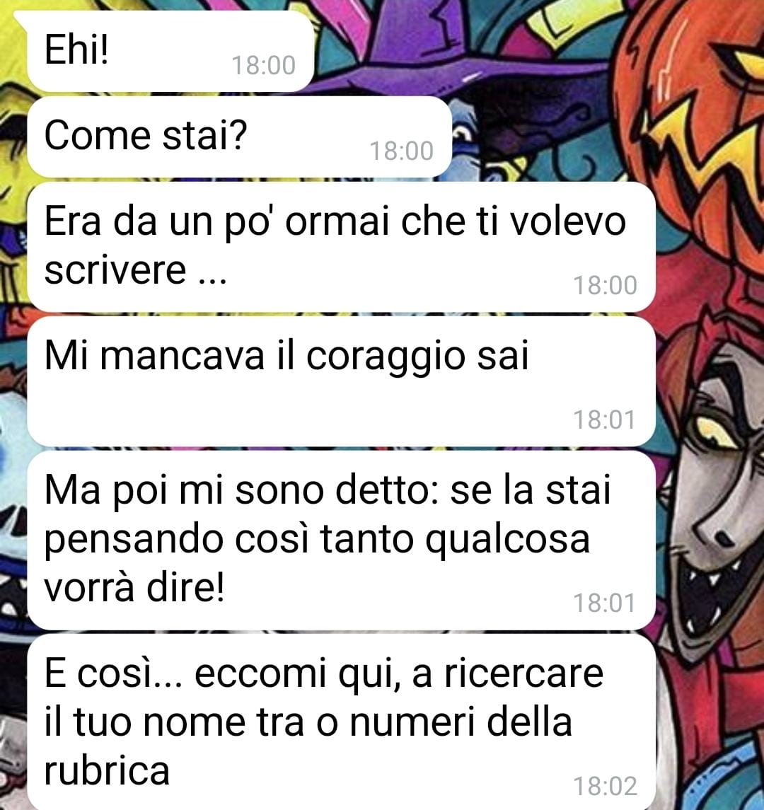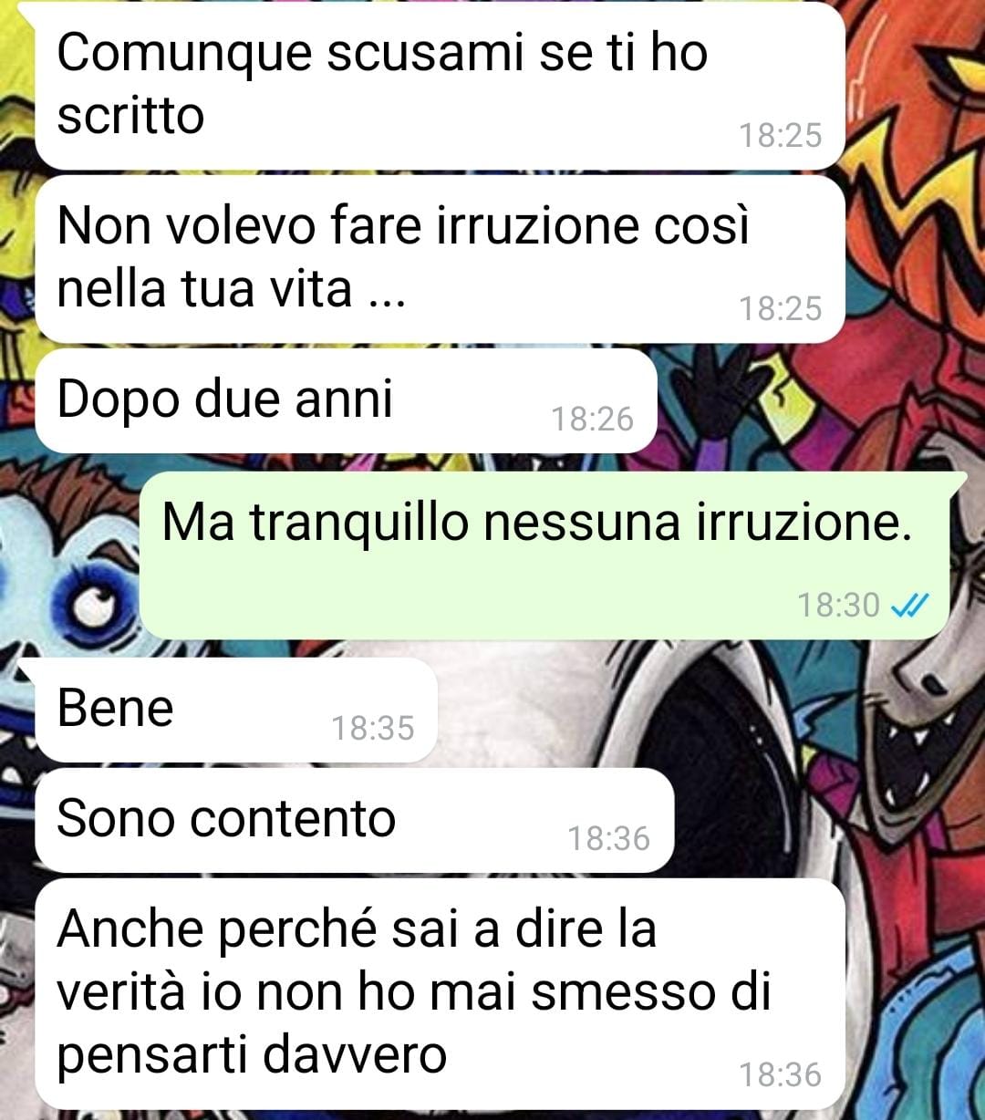 Non sapevo se scrivervi oppure no, ma poi mi son detta: perché no? Perché non dovrei farlo? E quindi mi trovo a scrivere questa cosa, e inviarvi questi screen, perché tutti devono sapere come sono andate le cose. Dopo due anni da che ci eravamo lasciati, mi ha scritto il mio ex, Alessandro, e non potete sapere che faccia ho fatto nel vedere questi messaggi. Ora, dovete capire che quando ho conosciuto Ale ero molto più ingenua che adesso. Mi facevo trattare un po’ maluccio a dire la verità, per carità niente di serio, ma lui non mi regalava mai nulla, ero sempre io ad offrire pranzo e cena, e flirtava tranquillamente con le altre ragazze, anche davanti a me, e altre galanterie simili. Insomma non era decisamente l’amore della mia vita. Così quando mi ha lasciata all’improvviso, me ne sono fatta una ragione. Soprattutto dopo aver scoperto che senza di lui stavo meglio! Non l’ho mai odiato infatti per avermi lasciata, mi ha fatto un favore ed è andata benissimo così. Poi con il tempo me ne sono dimenticata, adesso ho una nuova relazione in cui sto molto bene, e di lui ho pochi ricordi su cui di solito non mi soffermo. Però Ale ha pensato bene di ricontattarmi, improvvisamente si è reso conto di quello che io contavo per lui. Voi ci credete?