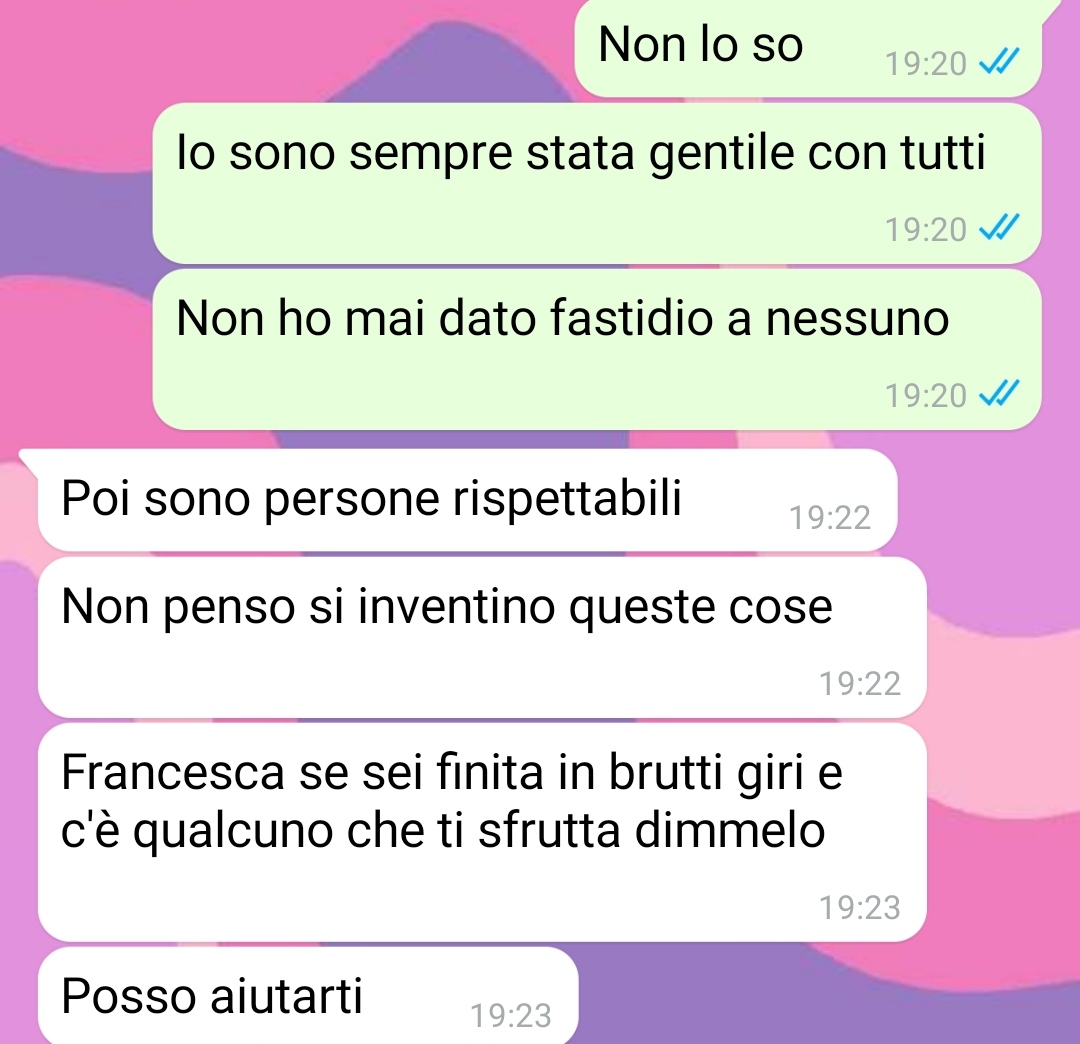 La nostra follower non nasconde lo stupore e la frustrazione che sta provando: dice di sentirsi come se fosse finita in un incubo, senza capire perché stia accadendo tutto questo. Nonostante abbia cercato di giustificarsi e di chiarire la propria posizione, la situazione sembra non risolversi, anzi, peggiorare con il passare dei giorni.
