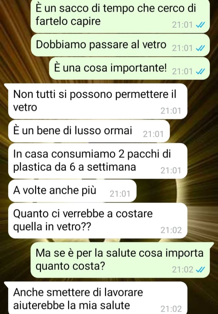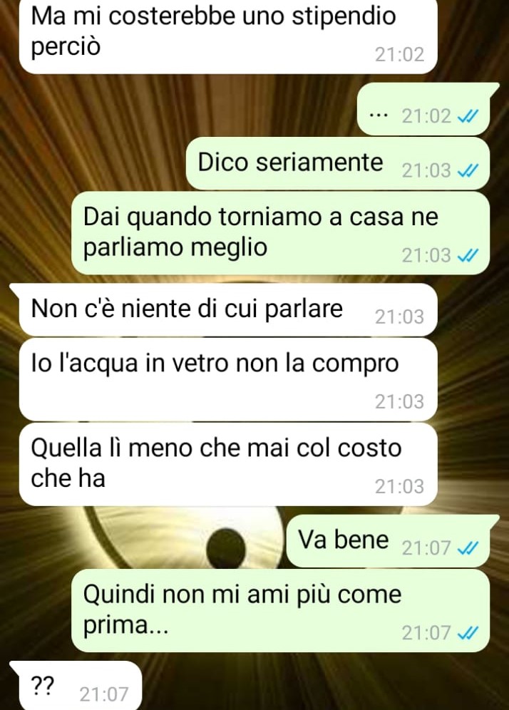 Una nostra fanha condiviso la sua frustrazione riguardo a una serie di discussioni con il suo compagno, Luigi, concernenti la loro scelta di consumo dell’acqua. Il nucleo del disaccordo si concentra sulla transizione dal consumo di acqua in bottiglie di plastica all’utilizzo di bottiglie di vetro, una mossa che lei considera cruciale per la salute e l’ambiente.