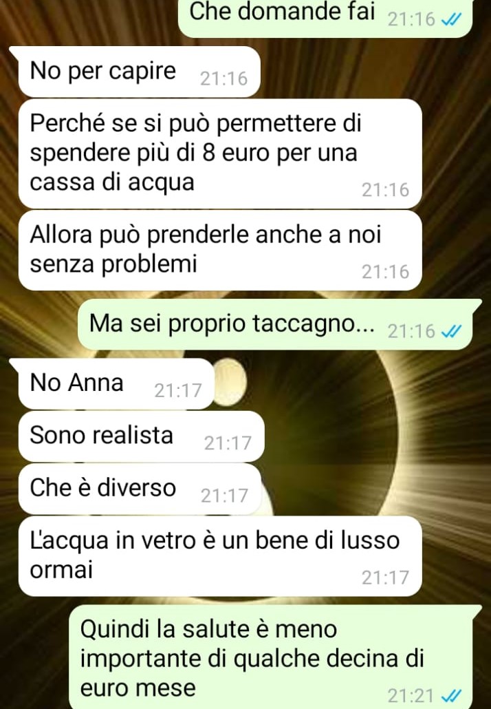 Il punto culminante della loro discussione, che ha provocato particolare disappunto nella donna, è stata la rivelazione che la principale obiezione di Luigi al passaggio all’acqua in bottiglie di vetro era di natura finanziaria. Lui ha espresso preoccupazioni per i costi aggiuntivi che tale cambiamento comporterebbe, una priorità che ha profondamente frustrato la sua compagna.