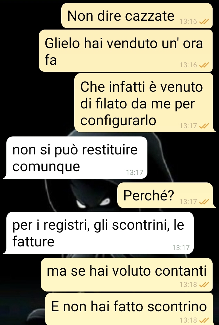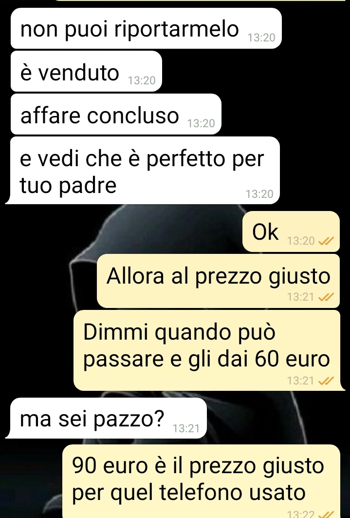 Il genitore del nostro amico ha creduto di aver concluso un ottimo affare, fidandosi delle parole del negoziante. Tuttavia, quando Ivan ha potuto esaminare personalmente la situazione e verificare lo stato effettivo del dispositivo acquistato dal padre, si è reso conto che le cose stavano diversamente da come erano state presentate. Il dirigente ha compreso che l’affare vantaggioso era stato in realtà realizzato da Lillo ai danni del suo genitore.