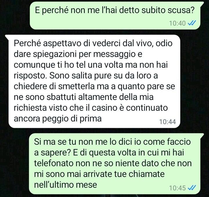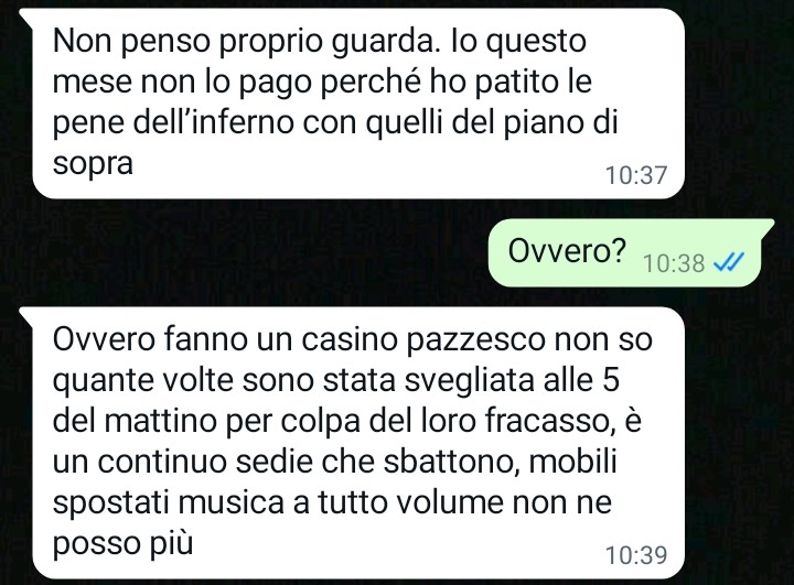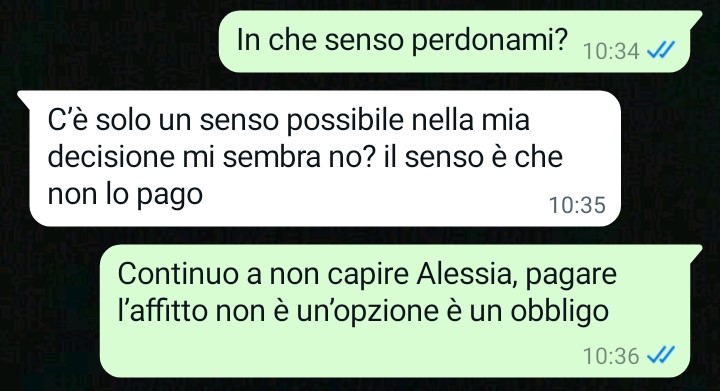 Il mio nome è Alberto e nella mia vita si può dire che ne ho viste di tutti i colori e il perché è molto semplice: ho un paio di appartamenti in centro a Roma che ho sempre affittato negli anni, quindi potete facilmente capire con quanta gente io abbia avuto a che fare in ben oltre 14 anni di affitti; ma nonostante questo c’è sempre qualcuno ancora capace di sorprendermi, lasciandomi scioccato e senza parole.. come Alessia, l’affittuaria attuale di uno dei due appartamenti in questione, una tizia che a quanto pare studia e lavora insieme (anche se non ho ancora capito che studia a 40 anni suonati). Leggete cosa mi ha scritto stamattina su WhatsApp e fatemi sapere se è corretto da parte sua. E io che pensavo di avere a che fare con una persona onesta e rispettosa. È proprio vero che non si finisce mai di imparare e di prendere brutte cantonate purtroppo.