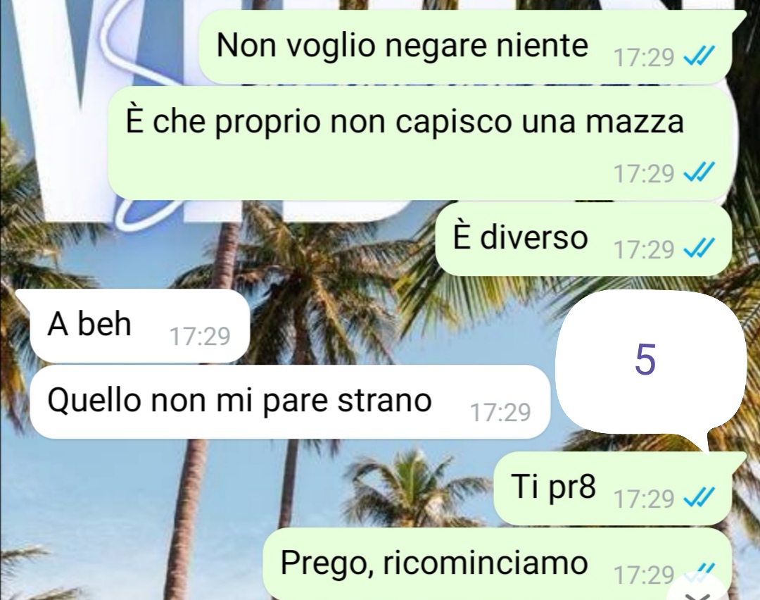 Il nostro fan racconta di aver deciso di condividere una chat che definisce surreale, convinto che possa rappresentare un esempio di dinamiche sempre più frequenti. Spiega di essere fidanzato da due anni con la nostra fan – così la definisce nel racconto – e di ritenere che, dopo tutto questo tempo, lei dovrebbe conoscerlo abbastanza bene.
