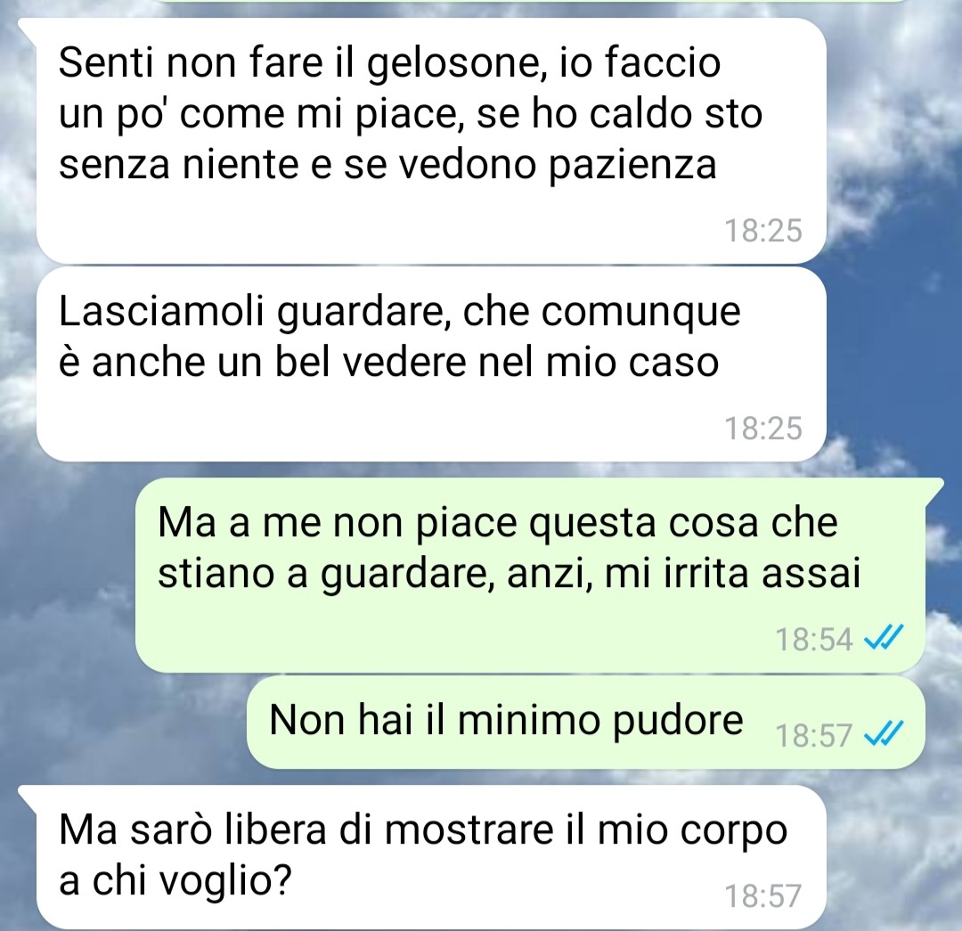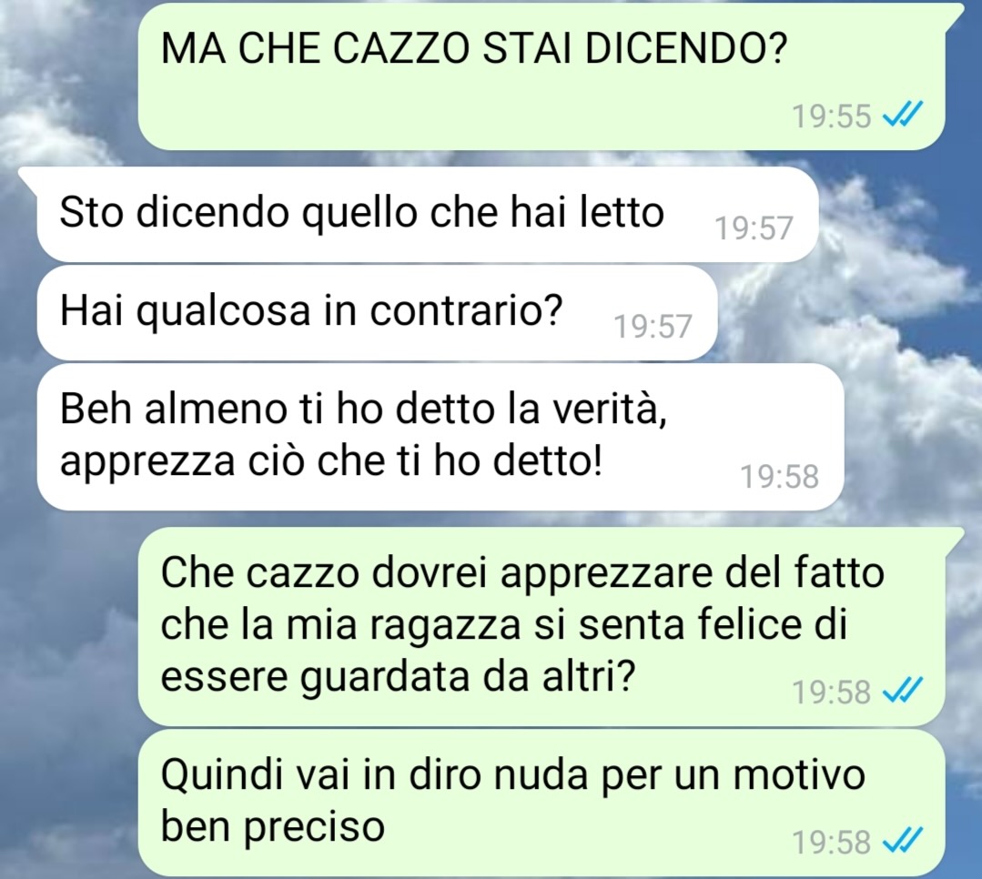 “Ciao, vi scrivo per avere un parere e per raccontarvi la mia storia, nella speranza di trovare soluzioni utili alla mia situazione. Mi rivolgo a voi donne: vi piace essere guardate e ammirate? Se sì, vi piace anche se siete fidanzate? Ecco la mia situazione è un po’ particolare. La mia ragazza vuole a tutti i costi farsi vedere dagli altri, o meglio sta a casa nuda anche con le finestre aperte e a me questa cosa manda su tutte le furie. Cosa dovrei fare? Perché a me sembra un comportamento irrispettoso nei miei confronti ma sinceramente non capisco se sono io quello strano o cosa. Ho paura di confrontarmi con i miei amici perché mi vergogno follemente.. non ho altre alternative…”