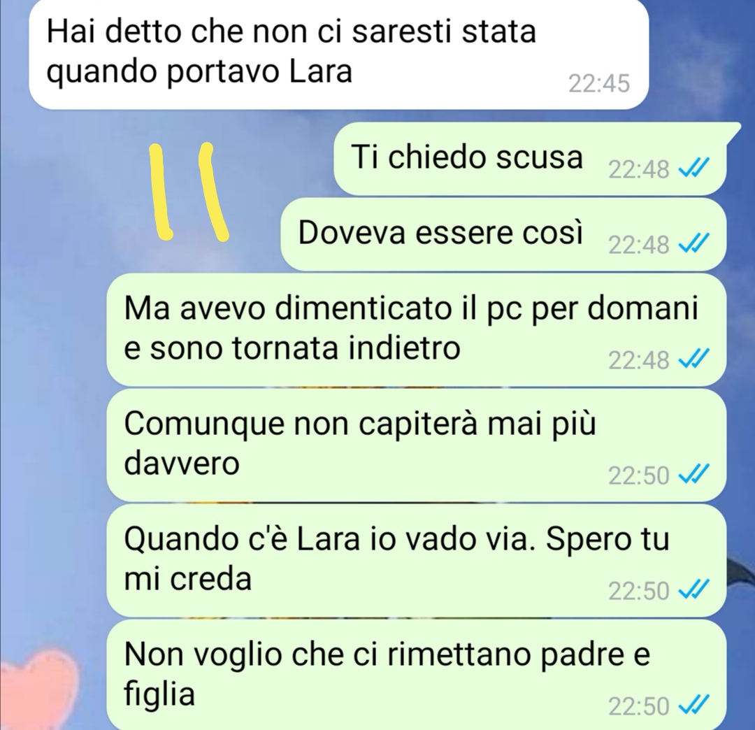 Nel frattempo Lara è cresciuta: oggi ha sette anni e trascorre molto tempo con il padre e con Serena. Fortunatamente, Luigi e Carla hanno scelto una gestione piuttosto libera dell’accudimento della bambina. Lara può andare dal padre ogni volta che lo desidera, senza rigidità particolari. Spesso, dopo la scuola, passa il pomeriggio con loro, mangia a casa e poi viene riaccompagnata dalla madre per la notte.