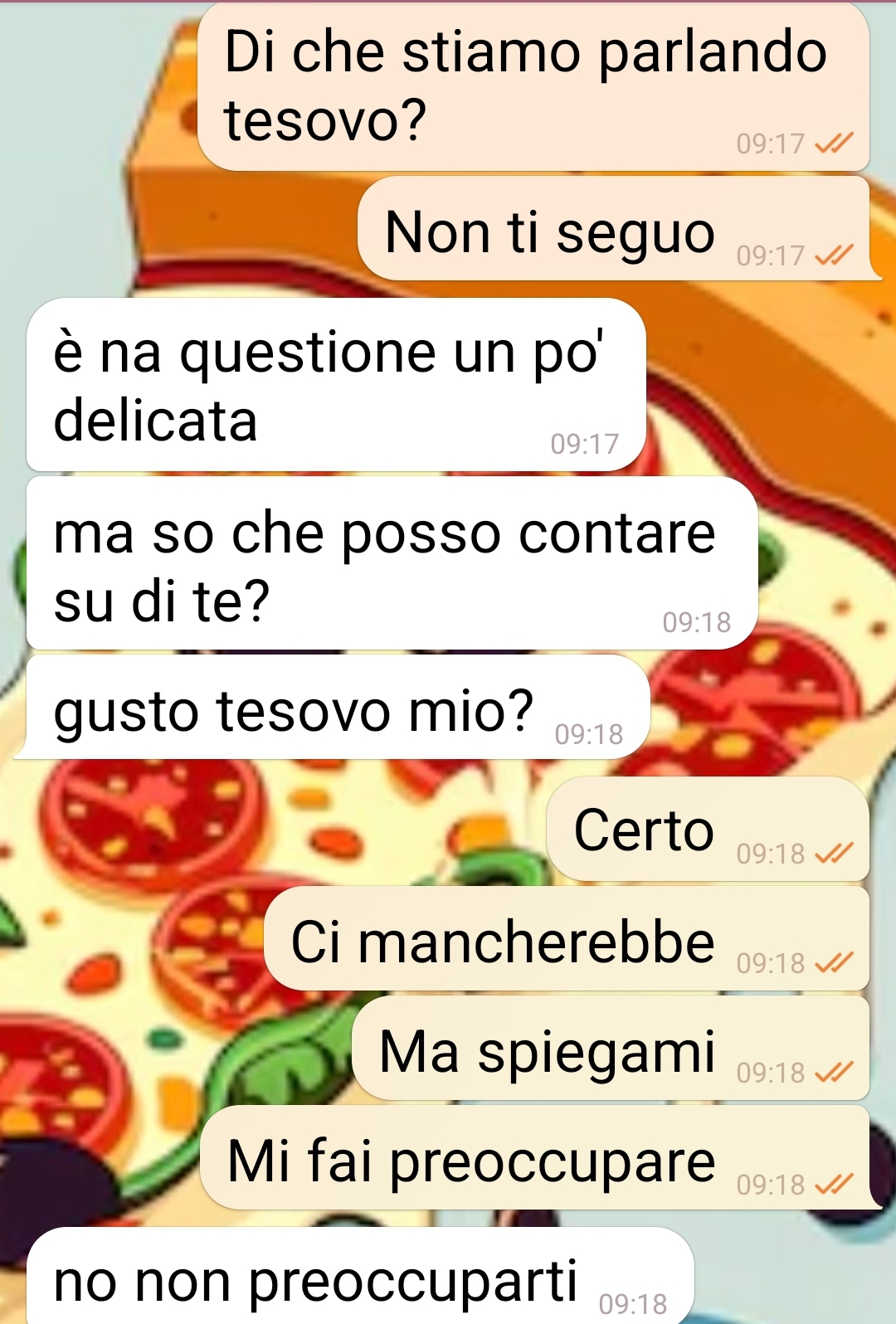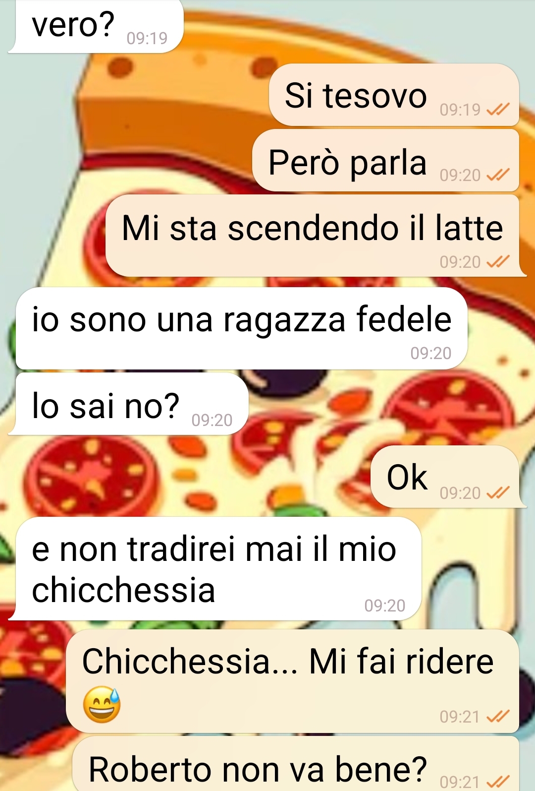 La mia amica mi ha chiesto che scusa usare per…evitare effusioni con il suo fidanzato. Il giorno del loro anniversario! E per quale mo=vo poi… Pagina di spunte blu io sono troppo curiosa di vedere se anche voi e tu@ i leAori, dopo aver leAo questa chat, pensate quello che ho pensato io. Se anche voi vi siete blocca= per qualche minuto con lo sguardo perso e la bocca aperta come un ebete. Siamo io e la mia amica che parliamo di un argomento delicato. Lei mi ha scriAo perché voleva delle scuse da me. Scuse da u=lizzare con il suo fidanzato. Scuse per evitare che lui potesse avanzare pretese in serata… dopo una bella cena roman=ca…il giorno del loro anniversario…ci siamo capi=. Ma la scusa doveva essere “originale e credibile”, non una di quelle che ha già usato… per i due mesi preceden=! Questo non capivo. Perché scuse per non farlo da 2 mesi? Poi finalmente ha parlato. La mo=vazione è venuta fuori. E io sono ancora qua con la bocca aperta e lo sguardo perso nel vuoto…