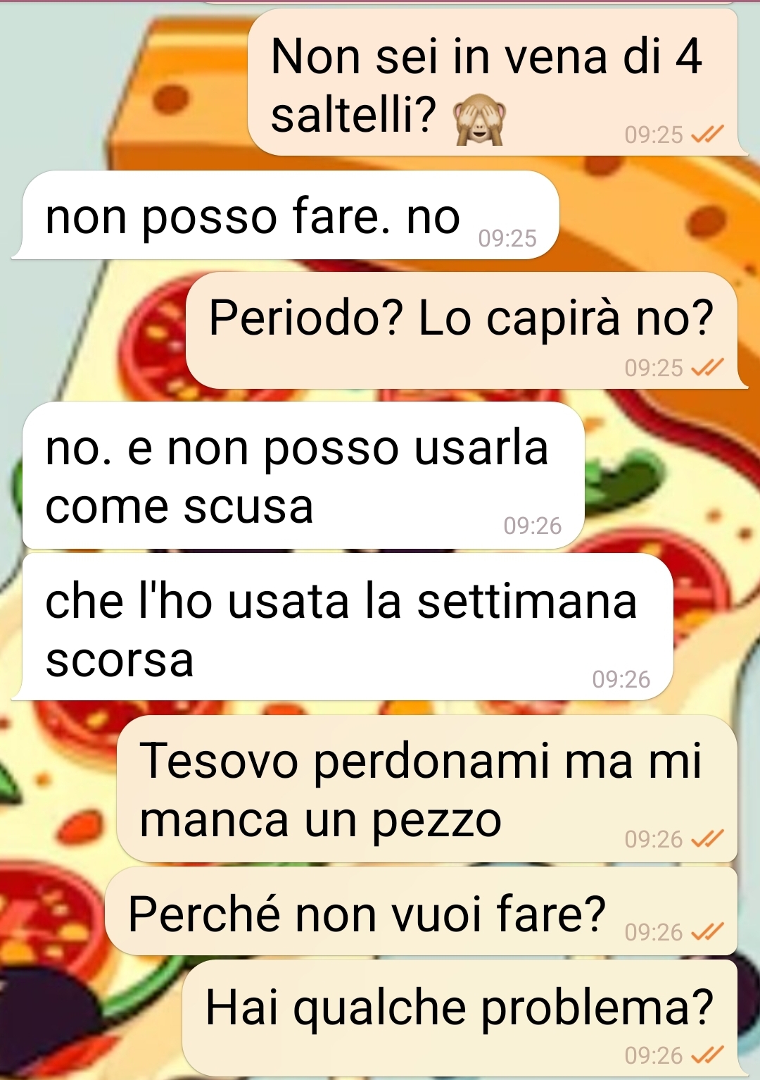 La nostra fan racconta una conversazione avvenuta tra lei e un’amica, una chiacchierata che all’inizio sembrava leggera ma che, col passare dei messaggi, ha assunto contorni sempre più insoliti. Tutto è iniziato quando la sua amica l’ha contattata con una richiesta precisa: aveva bisogno di una scusa da usare con il proprio fidanzato. Non una qualunque, ma una che fosse “originale e credibile”.