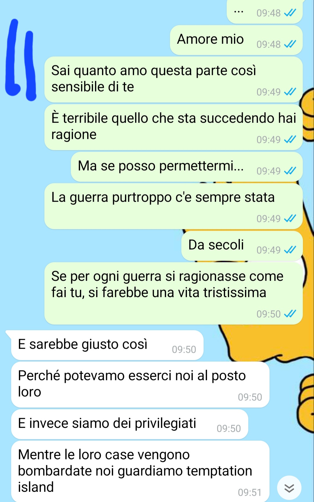Nonostante ciò, il nostro amico ammette che ci sono lati del carattere di Amelia che ancora oggi fatica a comprendere. In alcune situazioni, lei tende a fissarsi su determinati pensieri o argomenti e, nei momenti di contrasto, il dialogo diventa quasi impossibile. Teo si descrive come una persona paziente, che ama il confronto e il dialogo, ma sottolinea come la testardaggine della sua compagna renda difficile una comunicazione efficace: nei momenti di tensione, lei sembra smettere di ascoltarlo, parlando da sola e dando valore solo alla propria opinione.