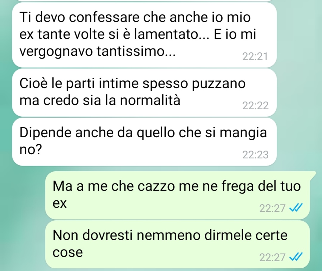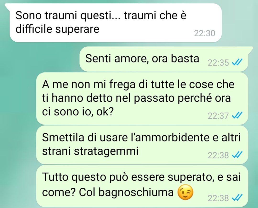 Tuttavia, l’episodio dell’ammorbidente ha acceso in lui qualcosa di diverso: un misto di confusione, imbarazzo e forse anche un pizzico di smarrimento. Si domanda se non sarebbe il caso che lei parlasse con qualcuno di competente, oppure – con altrettanta onestà – se non sia lui a dover cominciare a guardarsi intorno e valutare se questa relazione sia davvero quella giusta.