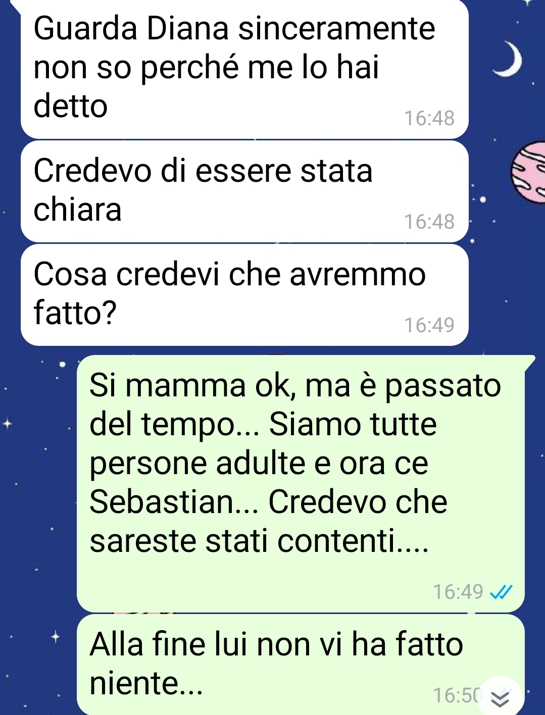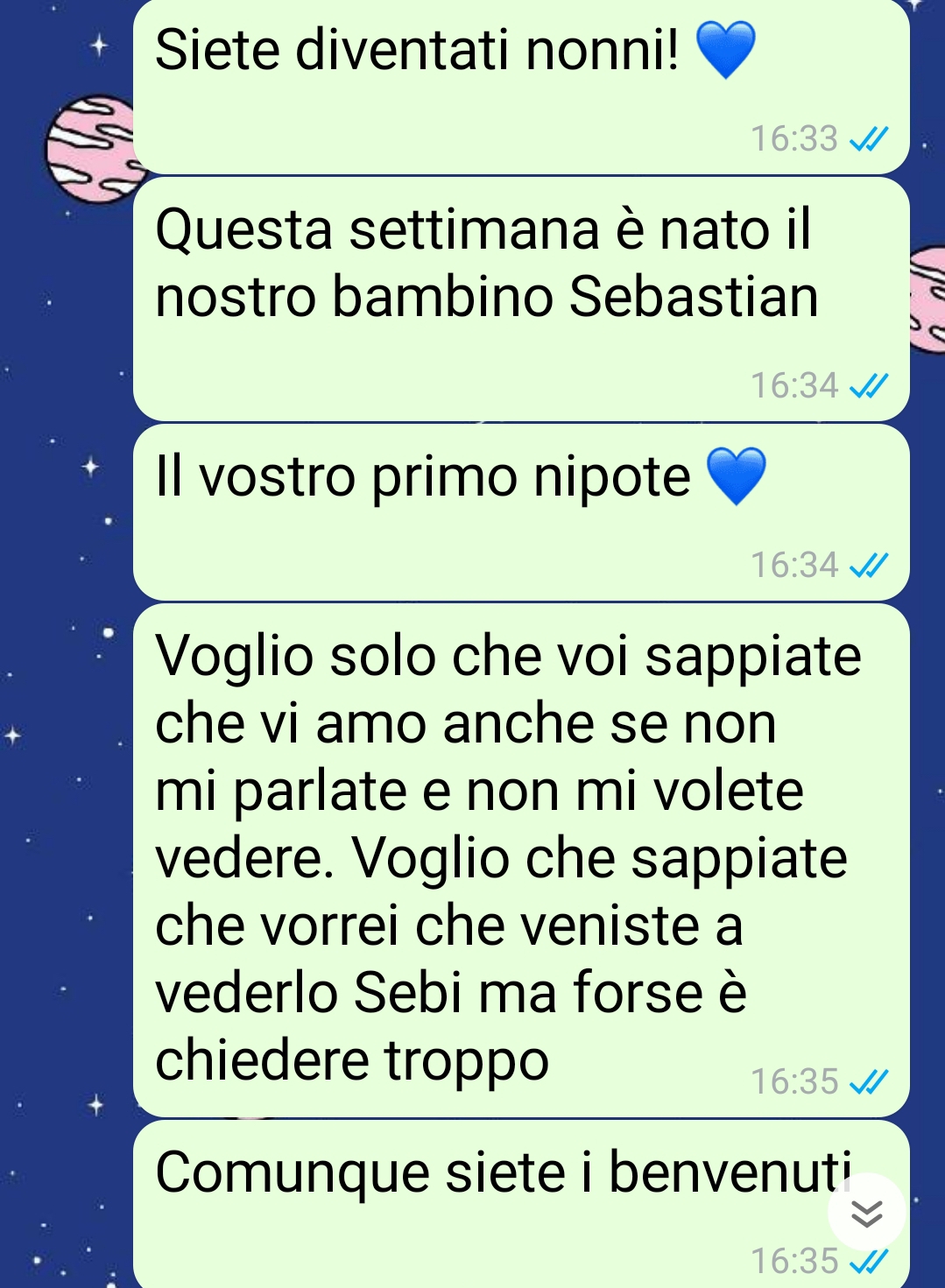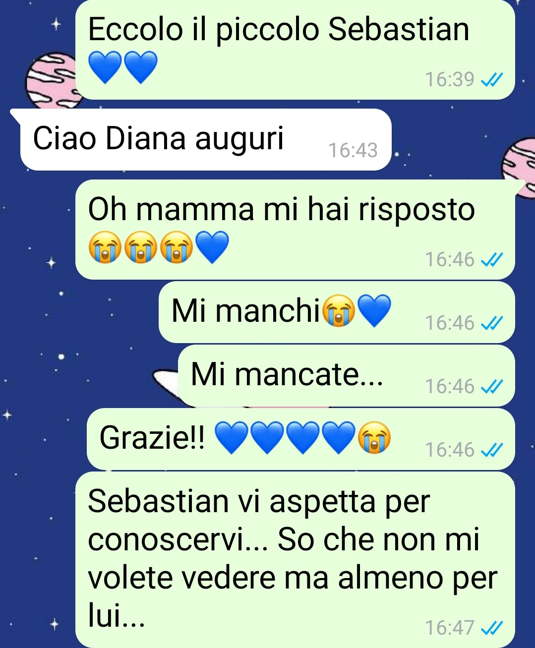 Provo un mix di emozioni al momento ed è per questo che ho deciso di scrivervi e di condividere con voi, ma principalmente con il vostro pubblico, il momento che sto vivendo. Forse scrivere mi aiuta e magari riesco a trovare conforto… Giustamente mi devo presentare .. Mi chiamo Diana e da poco è nato il mio primo bimbo, Sebastian. Io e Nicola, il suo papà, il mio compagno, siamo felicissimi ma anche un po’ tristi e angosciati perché vorremmo condividere questo momento con i miei cari. Q uesta che vi mando è la conversazione con mia mamma (la prima parte) di quando le ho scritto per comunicarle che… era diventata nonna! Leggendo questi messaggi so che vi arrabbierete o che sarete tristi, esattamente come lo sono stata io… Ditemi, come è possibile comportarsi così???? Vi pare normale?? Comunque, scusate il disturbo, io, Sebastian e Nicola vi mandiamo un saluto.