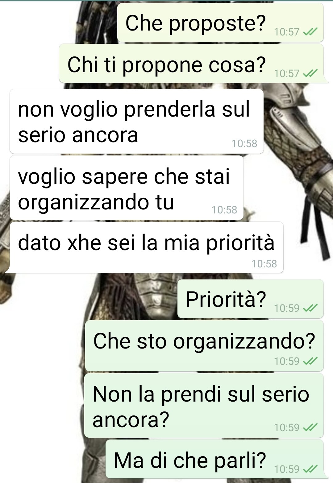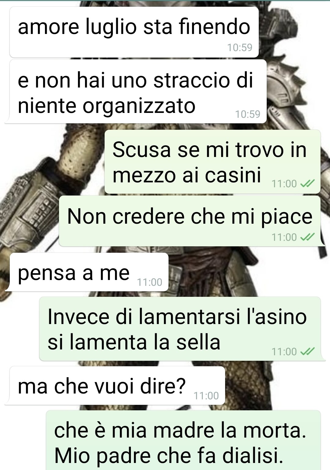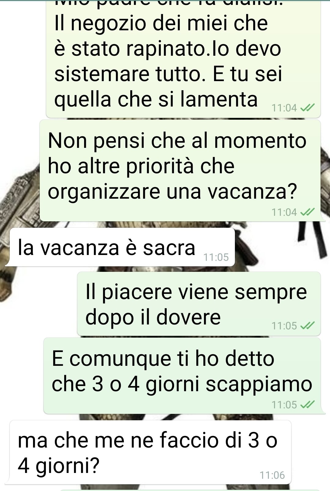 Le vacanze estive, o meglio le vacanze d’agosto, sembrano essere l’unica ragion d’essere della mia fidanzata. Che per una settimana in crociera è disposta a tutto. Letteralmente a tutto! Questa è la discussione tra me e Maria Grazia, la mia fidanzata. 4 anni a farmi spolpare da questo angelo demoniaco. Forse ci faccio la figura del cretino ma non mi importa. Mi pare giusto diffondere questo scempio. Negli ultimi 2 mesi mi sono successe un bel po’ di disgrazie, non voglio piangere miseria o essere compatito (e poi nella chat qualcosa c’è). Ma è importante per comprendere che le famose vacanze d’agosto quest’anno saranno per forza di cose diverse. Niente Messico, niente Bali. Forse non ci sarà niente proprio. E amaramente ho scoperto invece che sono forse l’unica cosa che conta per Maria Grazia. Che non solo si è fatta gli affari suoi in questi 2 mesi, altro che supporto, ma che adesso si è pure trovata la soluzione per farsi la vacanza da sola. Anzi no…