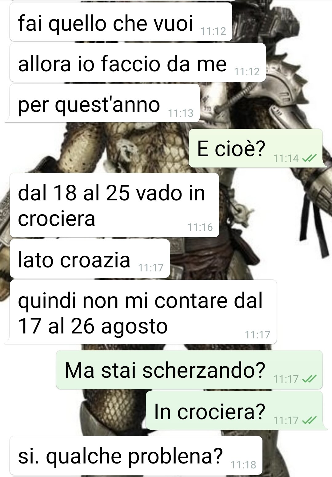 Un nostro fan ha deciso di condividere una conversazione avvenuta con la sua fidanzata Maria Grazia, con cui ha una relazione da quattro anni. Racconta che per lei le vacanze estive, in particolare quelle di agosto, rappresentano un elemento centrale e imprescindibile. Descrive come, pur di fare una settimana in crociera, sia disposta a qualsiasi cosa.