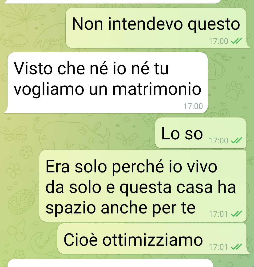 Il nostro fan racconta di aver chiesto alla fidanzata di andare a convivere e di essersi trovato davanti a una reazione che lo ha profondamente spiazzato. La nostra fan spiega che, fino a quel momento, l’ha sempre considerata una ragazza normale, ma che durante la conversazione sulla convivenza avrebbe mostrato un lato che non si aspettava.