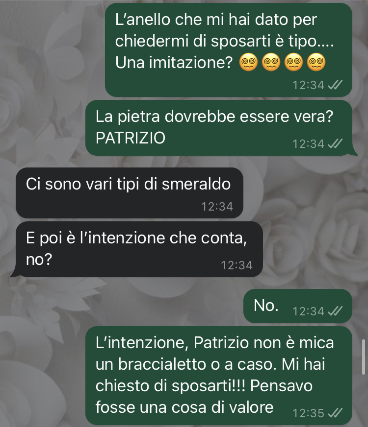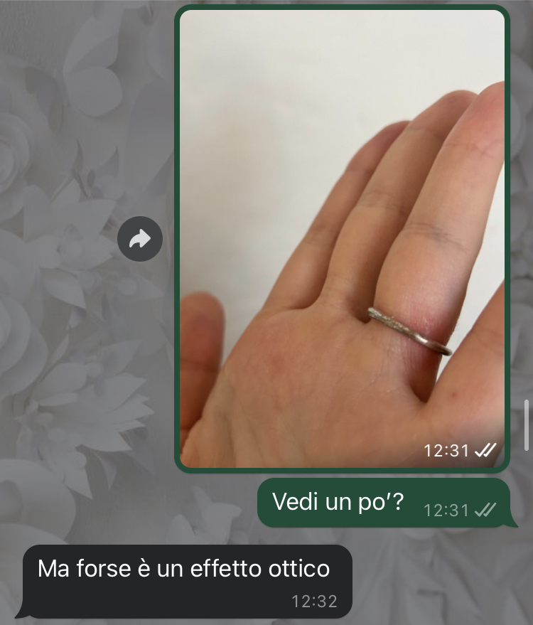 Una delle nostre fan ha voluto condividere con Commenti Memorabili un’esperienza che l’ha lasciata completamente sconvolta. La ragazza racconta che circa due settimane fa il suo fidanzato le ha fatto la proposta di matrimonio in quello che lei definisce un modo perfetto. Il momento è stato organizzato nei minimi dettagli: il posto scelto, il timing e persino le parole pronunciate hanno reso tutto assolutamente da sogno. L’emozione è stata così intensa che tra pianti, baci e abbracci, la nostra amica ha accettato senza esitazione, sentendosi finalmente realizzata in quello che era sempre stato il suo desiderio più grande.