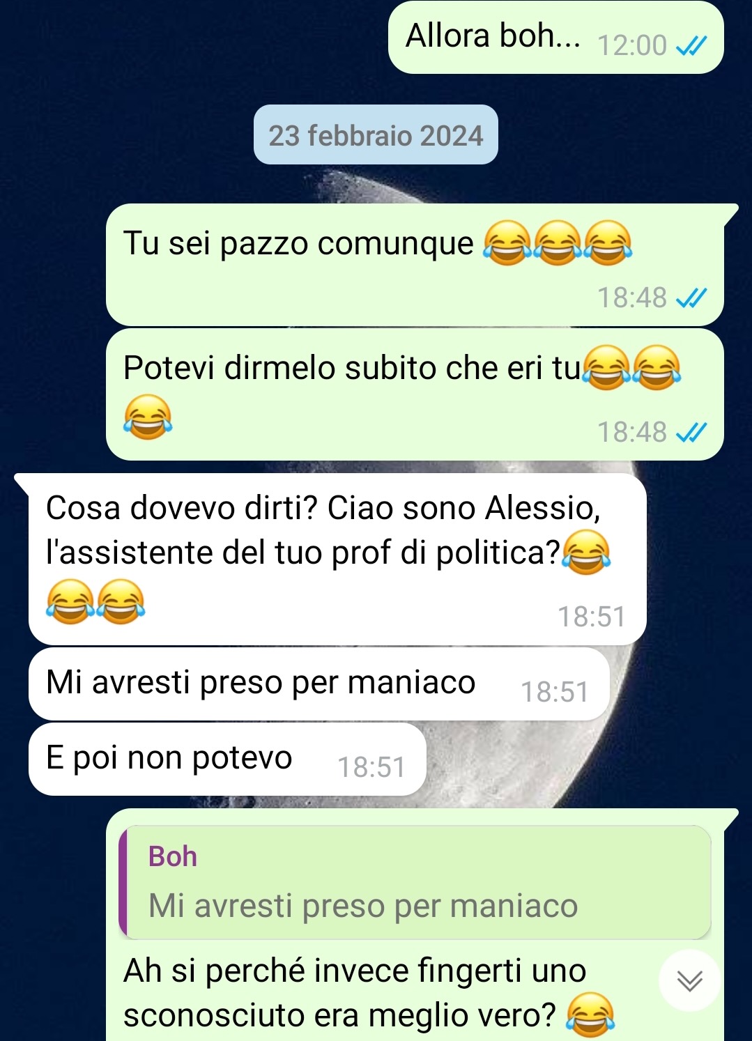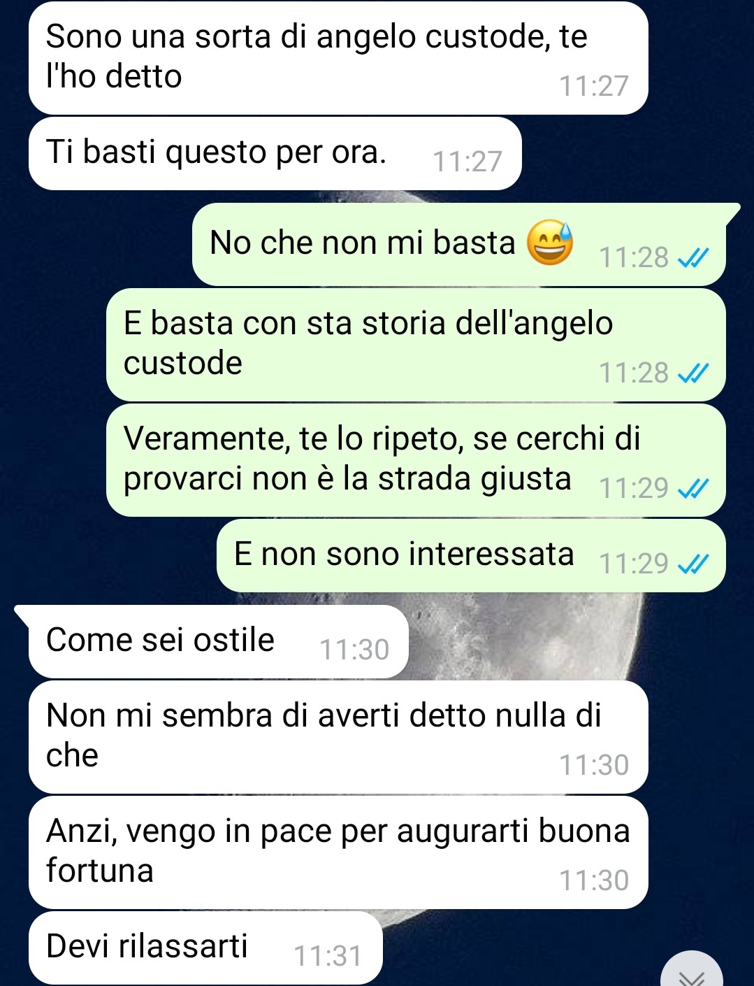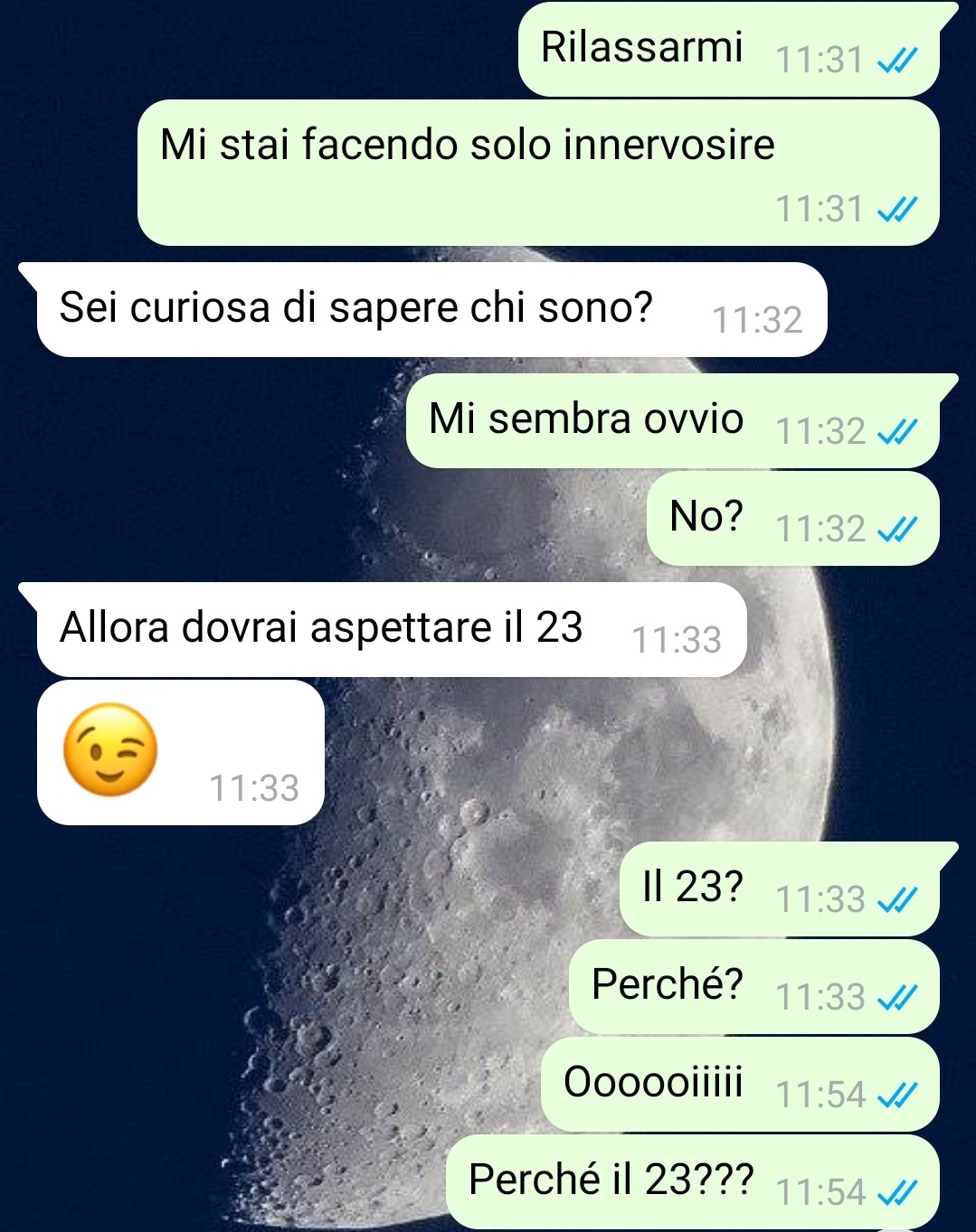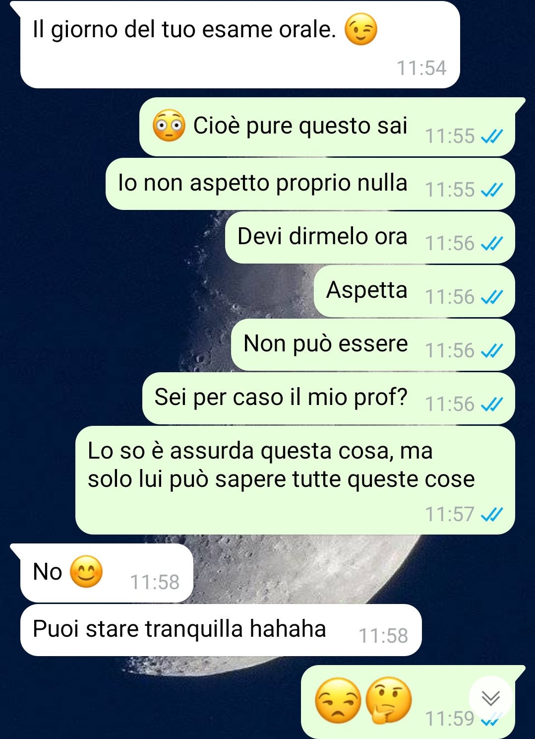 La comunicazione è proseguita anche nei giorni successivi, con messaggi puntuali prima di ogni parte dell’esame: la relazione da discutere, la prova scritta e infine l’orale. Se da un lato questa presenza misteriosa ha suscitato la sua curiosità, dall’altro l’ha anche messa sotto pressione, generando un certo nervosismo per l’insistenza e la mancanza di chiarezza.