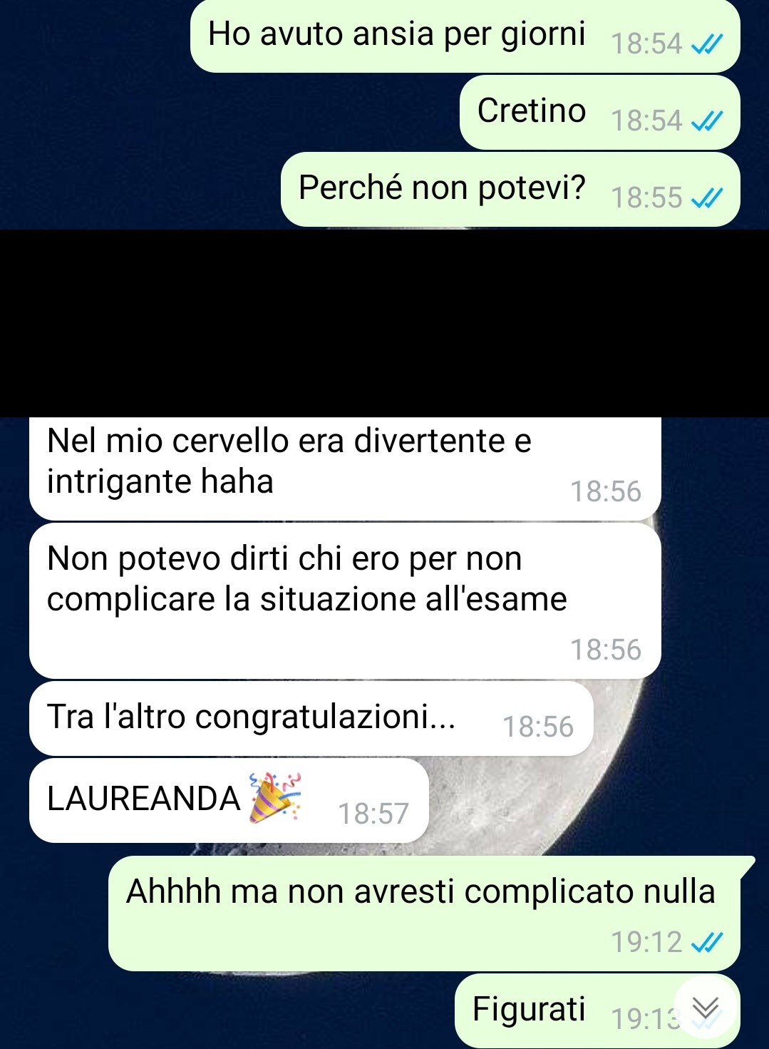 Il giorno dell’orale, però, è arrivata la rivelazione: il misterioso “angelo custode” ha finalmente svelato la propria identità. Da quel momento, tutto è cambiato. Quella che era partita come una vicenda strana e ambigua si è trasformata in qualcosa di completamente diverso.