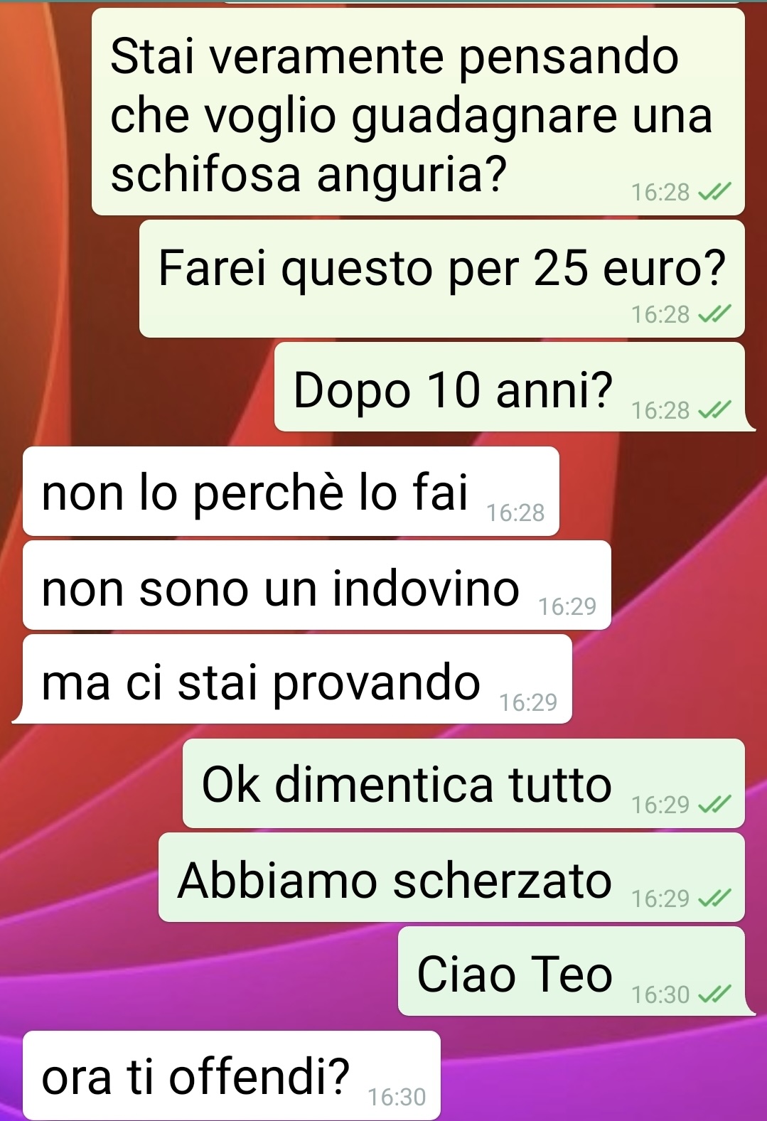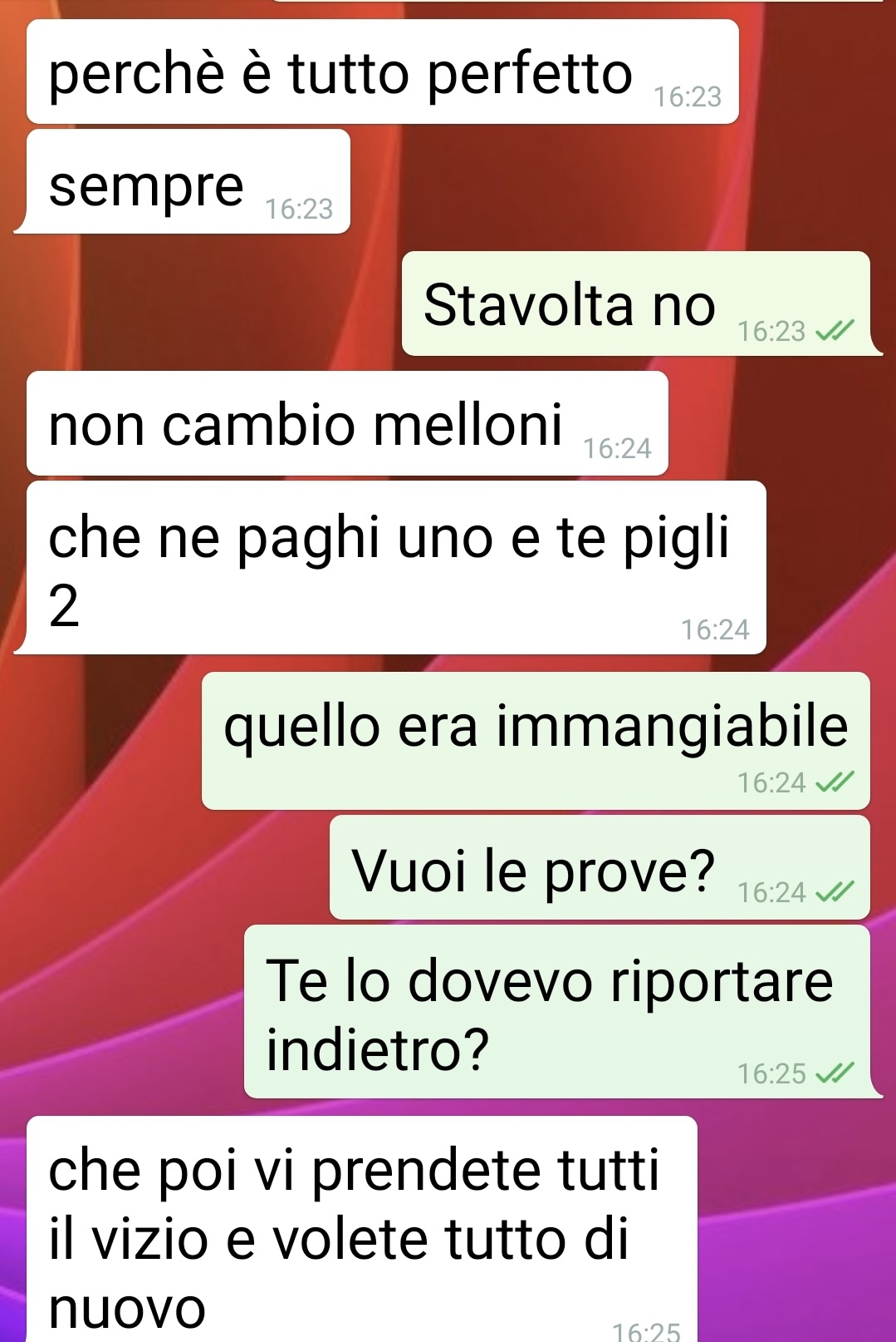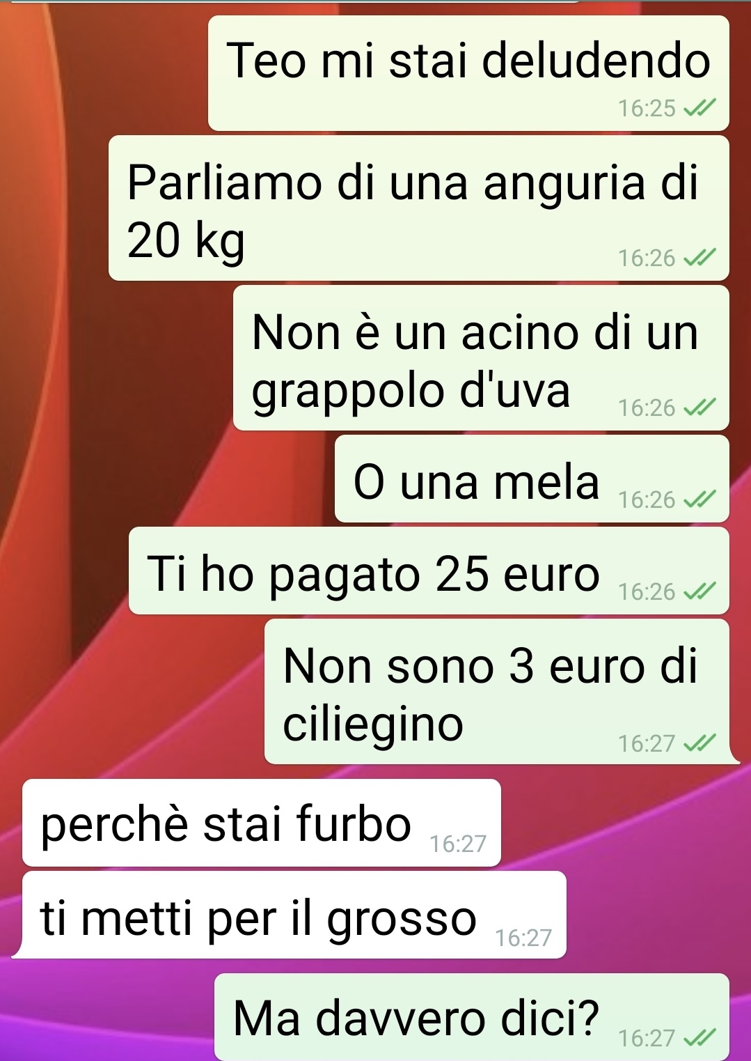 In quel momento, però, il titolare non era presente: c’era soltanto il garzone, che si è limitato a dire che avrebbe riferito tutto al principale. Nel pomeriggio, infatti, il fruttivendolo gli ha scritto personalmente per affrontare la questione.