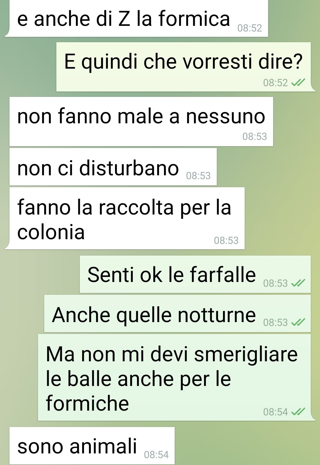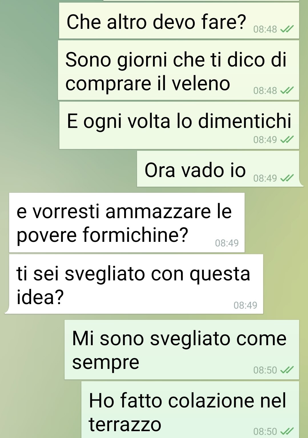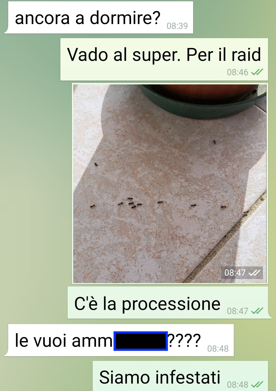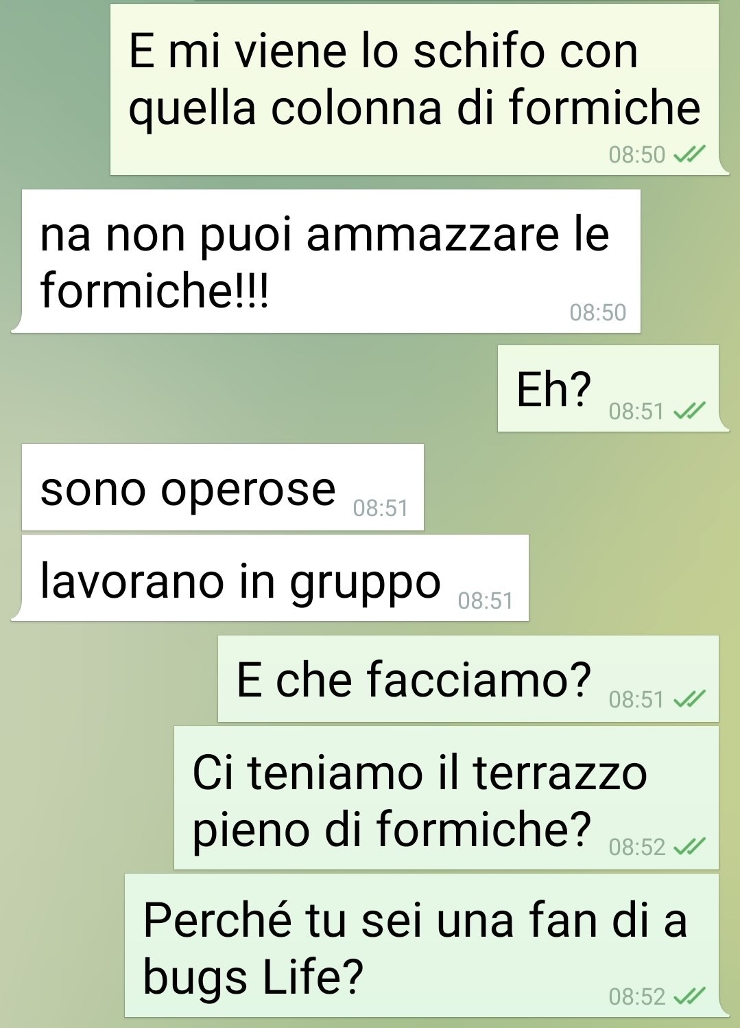 La mia fidanzata non vuole che metta l’insetticida per le formiche. Ancora non credo al perché di questo. Mi sento preso per i fondelli. Ma come devo fare con la mia fidanzata? È un amore di persona, ma da quando siamo andati a convivere spuntano ogni volta nuove e assurde fisime. Quest’ultima ha dell’incredibile. Sono spuntate ad un certo punto le formiche sul terrazzo. Volevo mettere l’insetticida ma lei, tra “meglio non usare veleni che inaliamo pure noi – sono carine come Z la formica – probabilmente sono attirate dalla spazzatura” mi ha convinto a non andare di DDT e simili. Ma ho pulito tutto, ogni minimo anfratto. Disinfettato tutto e cambiato posto alla pattumiera. Il giorno dopo di nuovo formiche ovunque! Ieri allora decido di comprare l’insetticida e inondarci il terrazzo. Lei non vuole ma stavolta arriva la confessione. È lei la responsabile! E il motivo è…boh. Non mi viene nemmeno come esprimermi. Ditemi voi come dovrei comportarmi. Mai sentito qualcosa di simile?