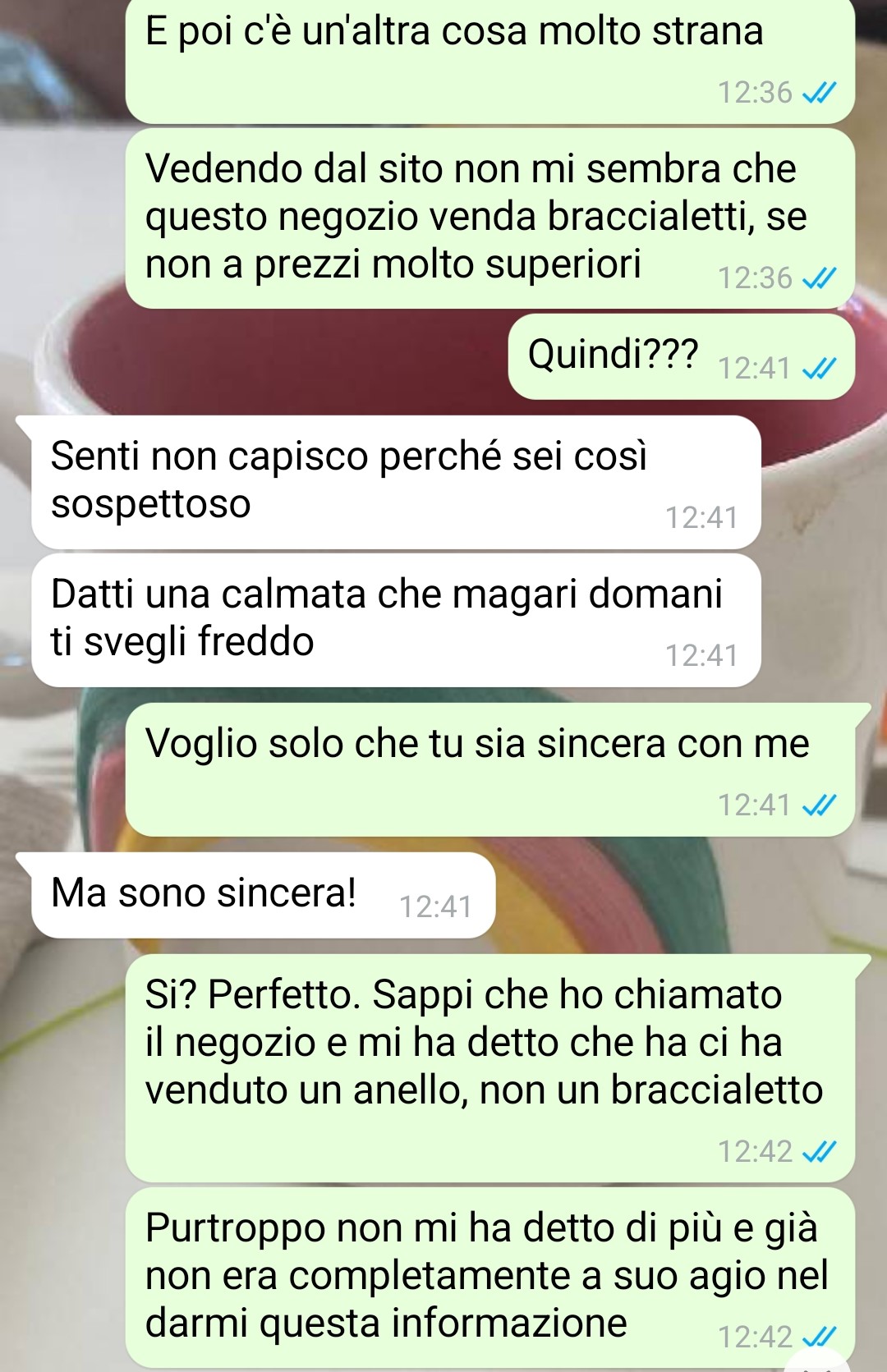 C’è una cosa che mi è successa recentemente e che ancora fatico a credere. Anna e io stavamo insieme da tre anni. La nostra relazione sembrava perfetta, o almeno così pensavo. Ma poi ho iniziato a notare delle piccole cose, dettagli che non tornavano. Un messaggio cancellato di fretta, una risposta evasiva, e soprattutto una transazione sospetta sul nostro conto comune. All’inizio non ci ho dato troppo peso, cercavo di convincermi che fosse solo la mia mente che giocava brutti scherzi. Ma un giorno, non riuscendo a togliermi quella sensazione di dosso, ho deciso di indagare. Ho guardato più a fondo, cercando risposte che lei non era disposta a darmi. Non voglio entrare nei dettagli perché la chat parla da sé, ma alla fine ho scoperto una verità che mi ha fatto crollare il mondo addosso. Non era solo la bugia in sé, ma il fatto che mi stava nascondendo qualcosa di così importante. La fiducia si è spezzata in un attimo, e da quel momento tutto è cambiato. Pensavo di conoscere la persona con cui stavo costruendo una vita, ma evidentemente mi sbagliavo.