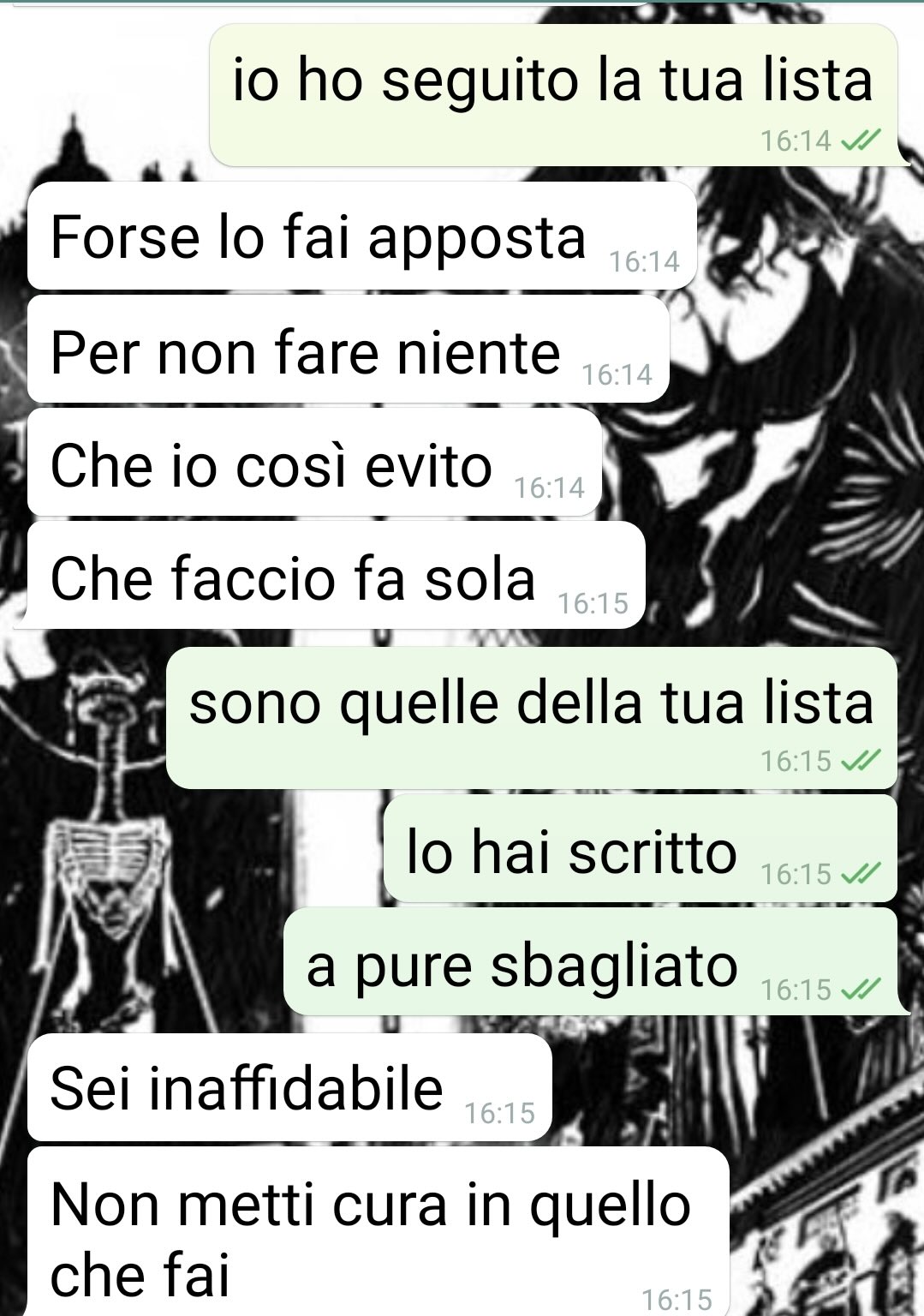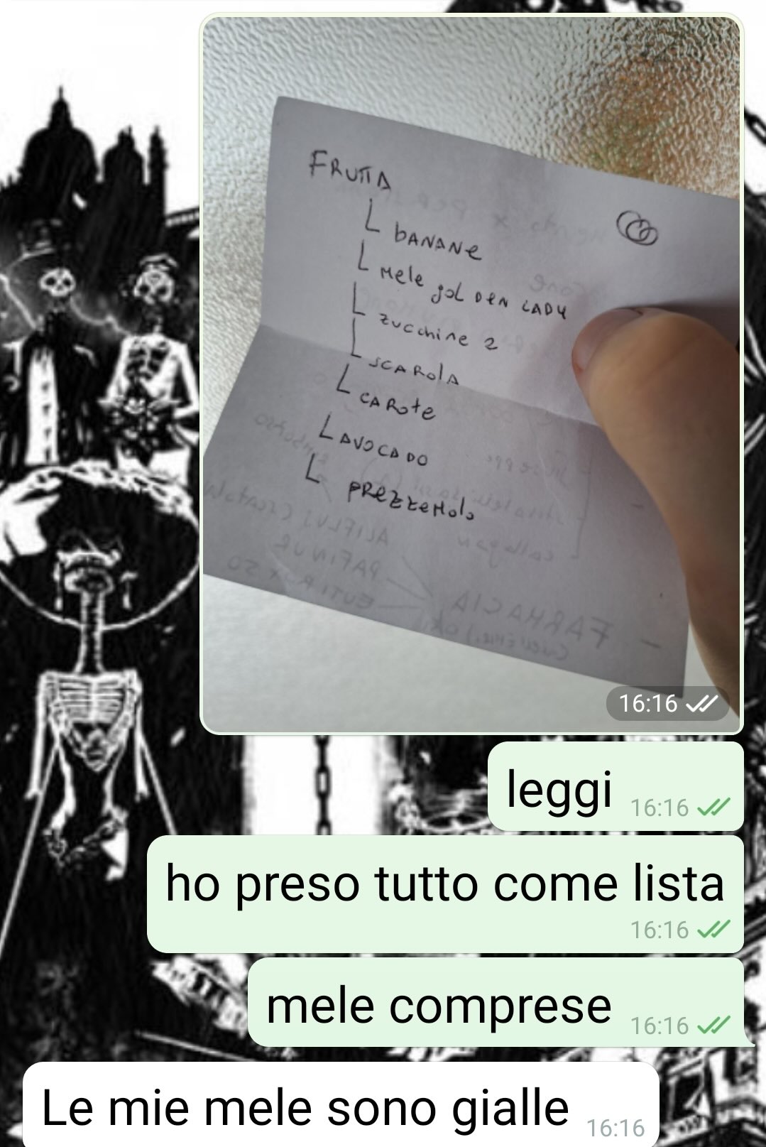 Quando una lista della spesa innesca il li/gio. E qualcuno nega l’evidenza… Pagina di spunte baci abbracci e screen per tu; voi. Io qua vi mando una discussione infinita, senza mo/vo valido, e che è stato solo l’inizio di una serata d’inferno. Perché è con/nuata pure dopo, di presenza, quando sono tornato a casa. Sono andato a leEo con le mele che mi perseguitavano. Altro che biancaneve… ma la mia compagna sì che è una strega. Vi pare possibile fare e dire tuEo quello che ha scriEo in questa chat (e non vi dico di presenza poi) per qualche mela? Che poi vi renderete benissimo conto leggendo che l’errore è suo. TuEo suo. Solo suo. Ma niente, aEacca a testa bassa, che comunque sono io in torto. Io e ben 2 adde; al banco fruEa se proprio mi deve dare un’aEenuante. Ma lo capite che mi ha pure minacciato di lasciarmi? Per il colore di qualche mela. Ditemi voi! Se deve esserci qualcuno esausto ed esasperato non è certo lei. A voi buona leEura e a me tanta, tan/ssima pazienza.