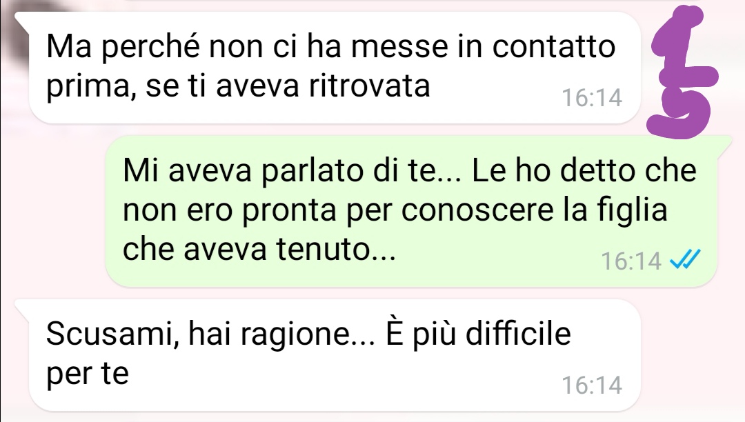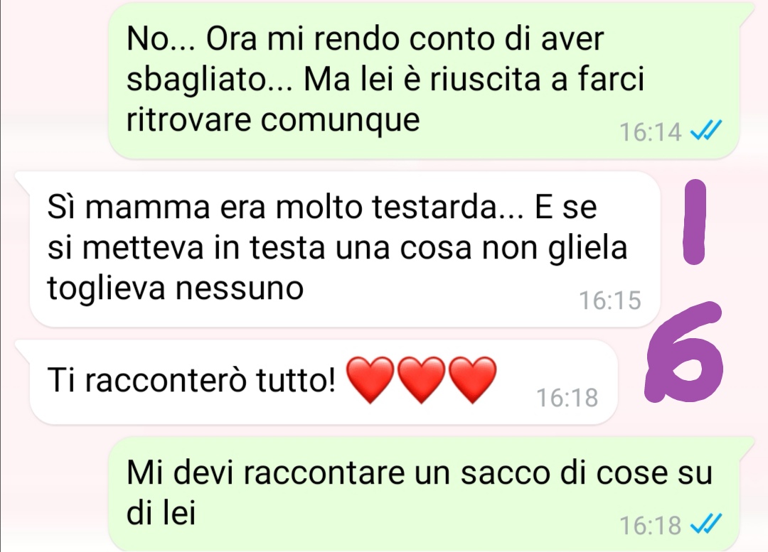 Non entra nei particolari, ma lascia intendere che quella rivelazione ha toccato un aspetto molto personale, forse legato proprio al tema che entrambe stavano affrontando. Scrive che da quel momento ha guardato la situazione con occhi diversi, rendendosi conto di quanto dietro un gesto apparentemente scortese possa nascondersi una storia dolorosa e complessa.