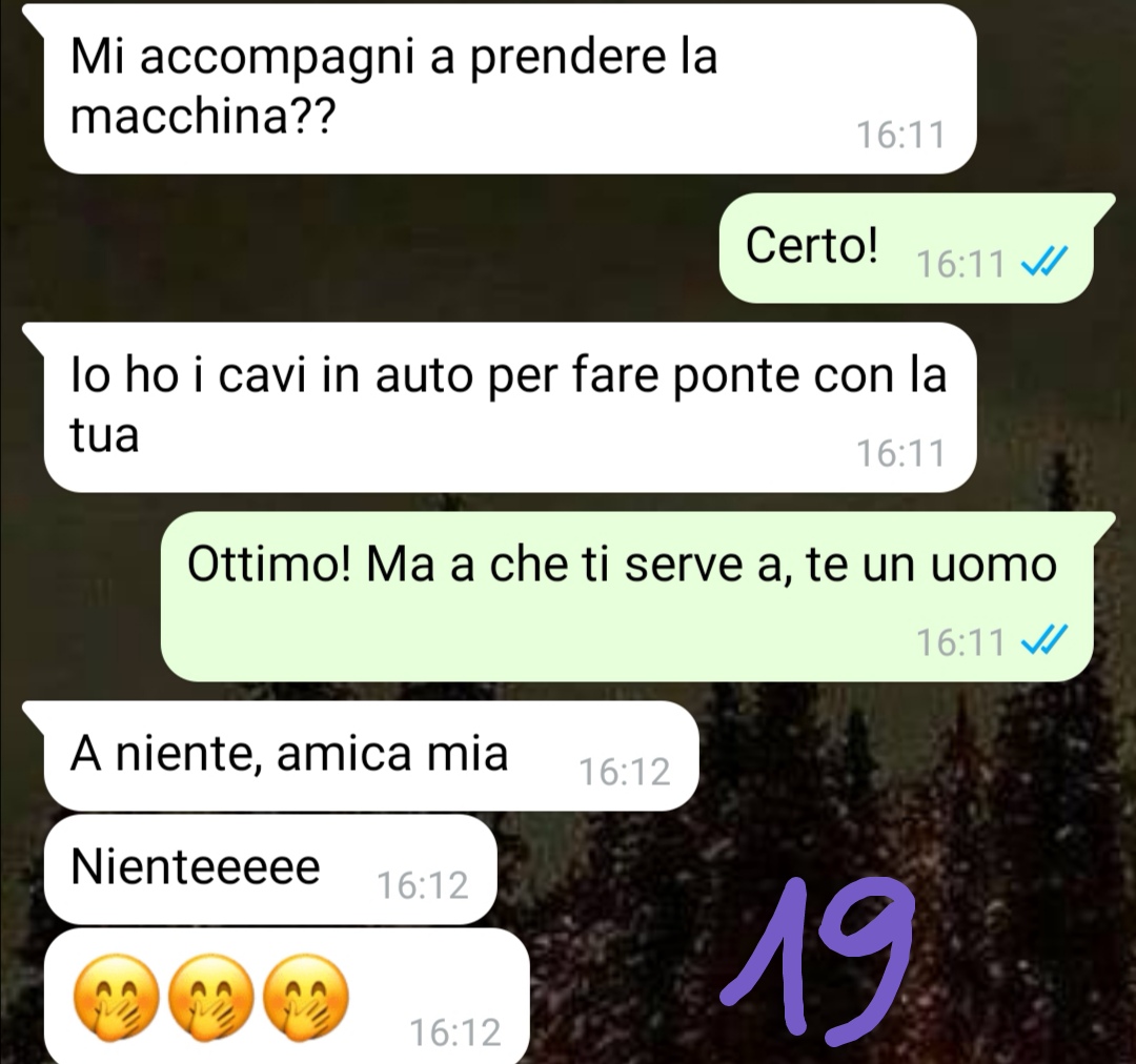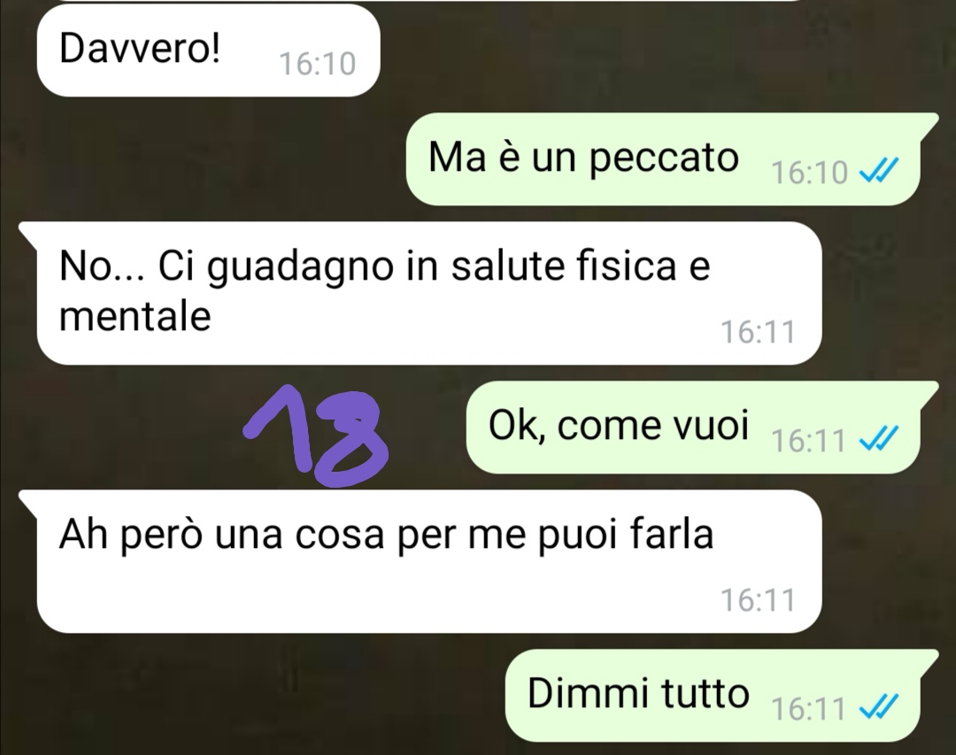 Il giorno successivo la follower si era decisa a scrivere all’amica per sapere come fosse andato l’incontro. Quello che si era ritrovata a leggere nella risposta aveva superato ogni sua immaginazione, tanto da sentire il bisogno assoluto di condividerlo con Commenti Memorabili. Naturalmente aveva ottenuto il benestare dell’amica prima di inviare la conversazione, invitando tutti a leggere questo scambio di messaggi che prometteva di essere davvero imperdibile.