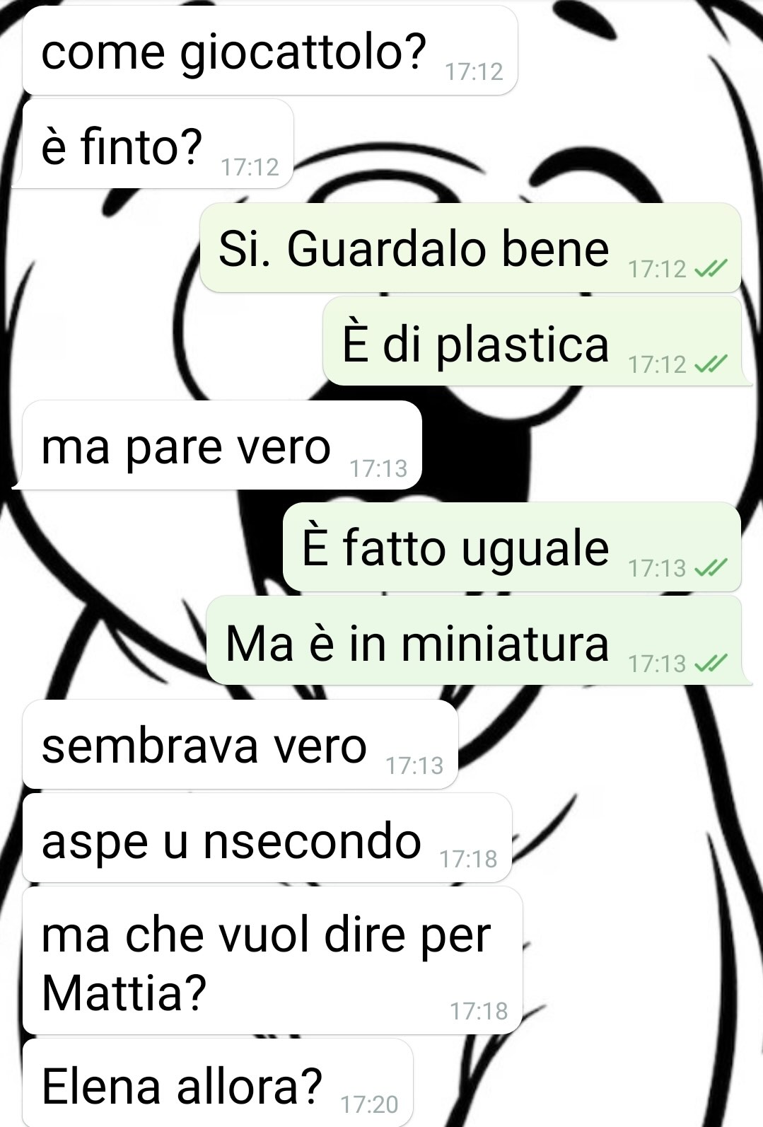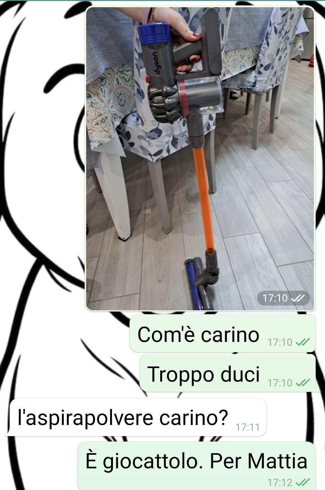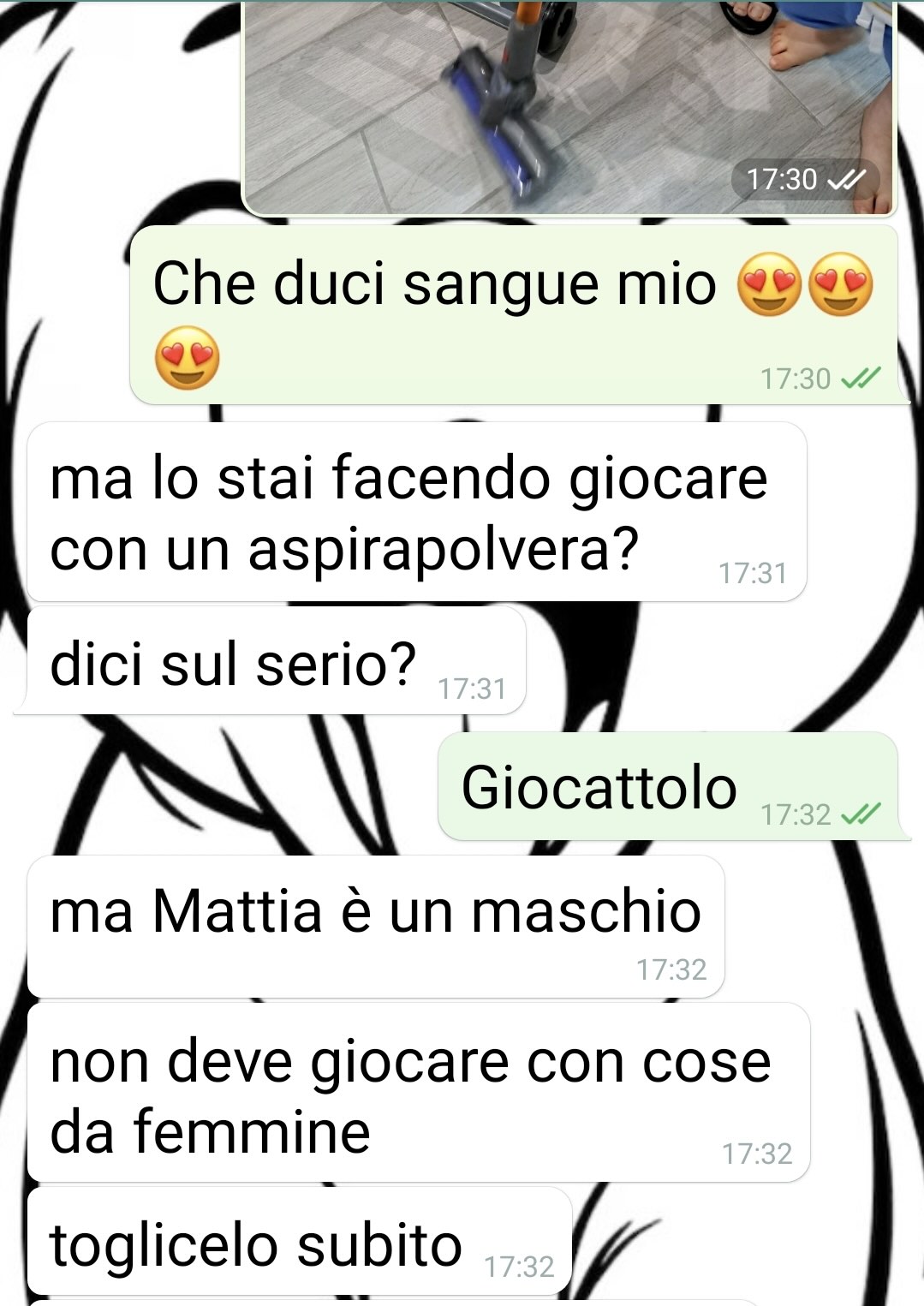 Mio marito si è praticamente umiliato da solo lamentandosi di un giocattolo di nostro figlio. Non sarebbe adatto alla sua mascolinità. Prima che approcciate questa storia è importante che sappiate quanto sia una persona brava, onesta e generosa mio marito. Io non sono qua per sfotterlo o parlarne male, vorrei solo che riuscisse a capire che su questo punto, su questa questione, è un po’ arretrato. Ha i paraocchi quando si parla di uomini e donne e degli stereotipi connessi al genere. E quello che dice in questa chat è per me incomprensibile. Io non riesco veramente a capire come possa una persona come lui, che nei fatti è veramente speciale (ha aiutato mio fratello in svariate situazioni come neanche i miei genitori hanno fatto) a poter dire certe cose. Anche solo a pensarle. Ha letteralmente perso le staffe per un aspirapolvere giocattolo. Come se fosse qualcosa che può minare lo sviluppo del nostro Mattia. Conosco questo suo fare ma ogni volta è sempre sconvolgente