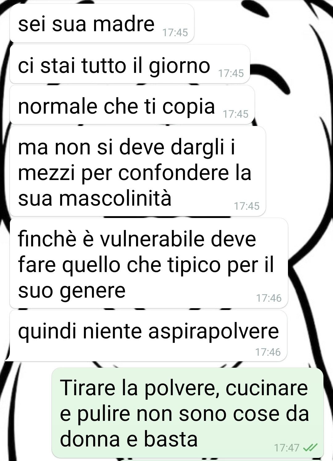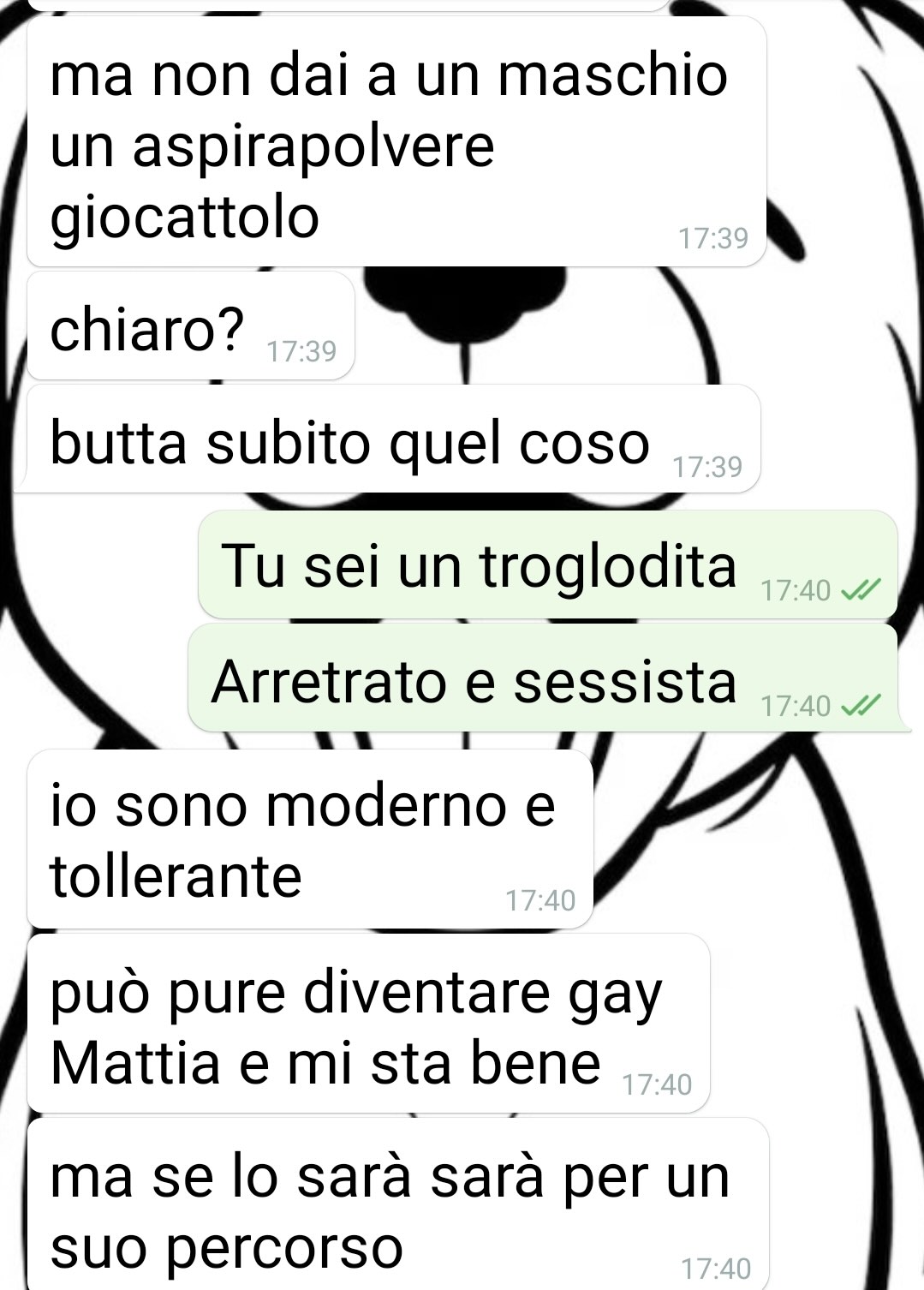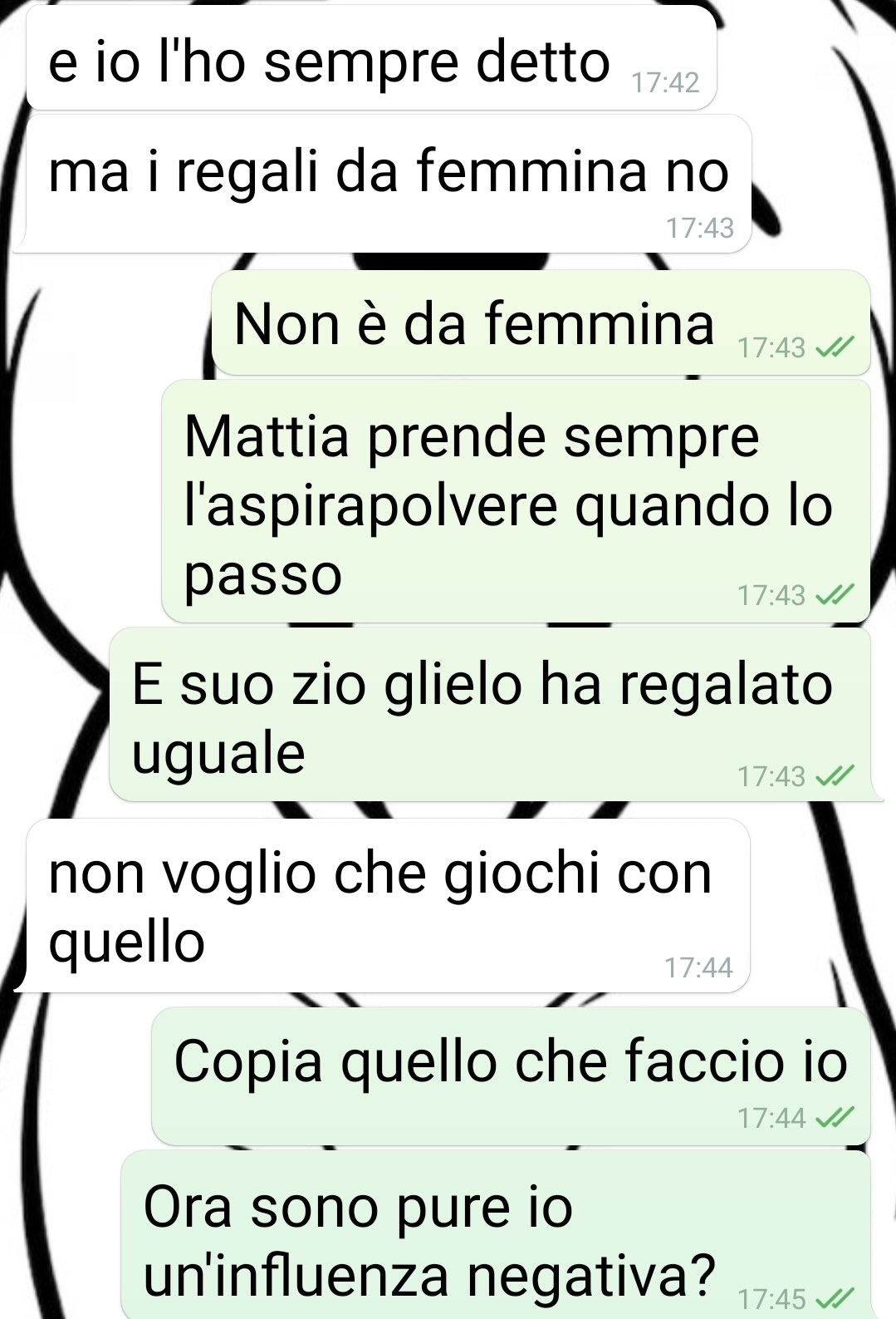 Tutto è nato da un giocattolo ricevuto dal piccolo Mattia, il loro figlio. Un oggetto innocuo, divertente, che dovrebbe appartenere al mondo della fantasia e del gioco: un aspirapolvere giocattolo. Ma per il marito, quel semplice regalo è diventato un problema, qualcosa di “non adatto” alla mascolinità del bambino.