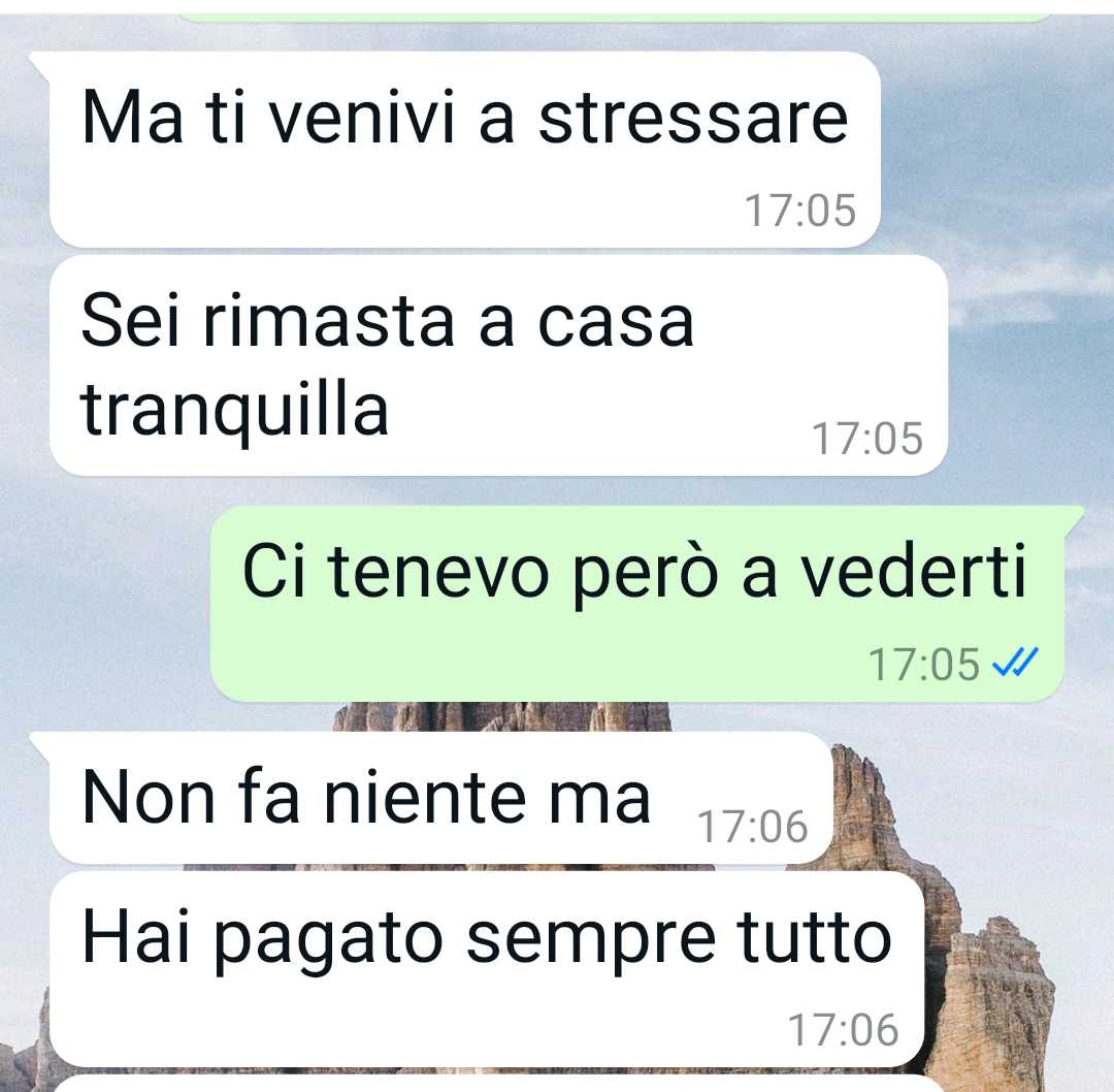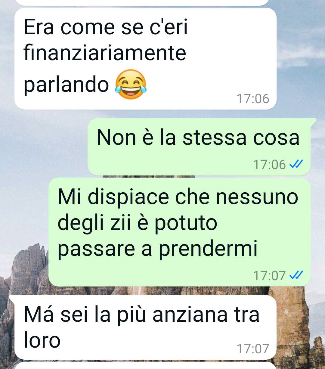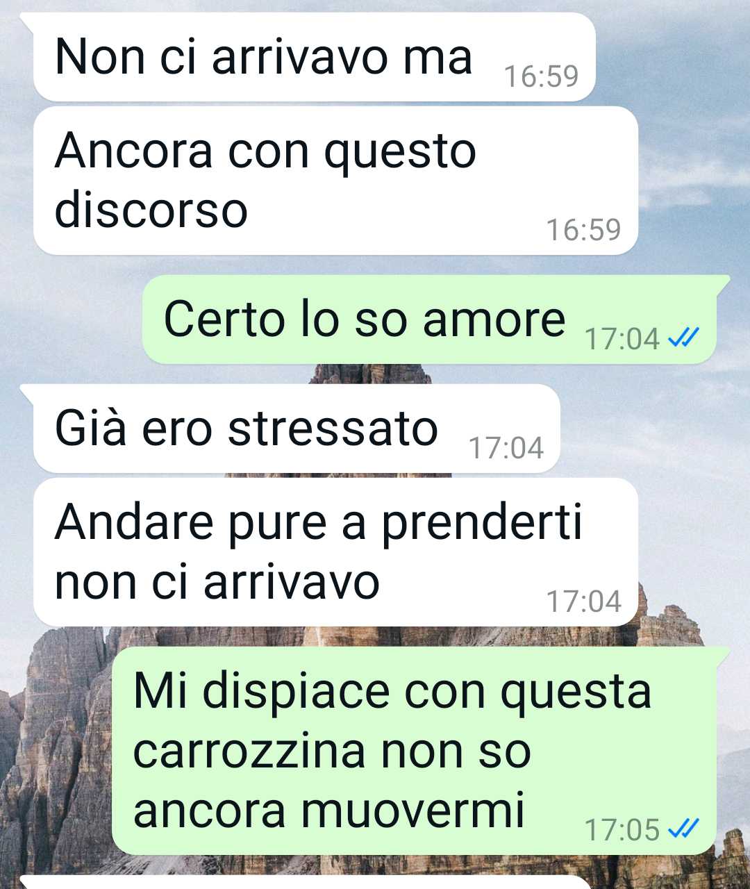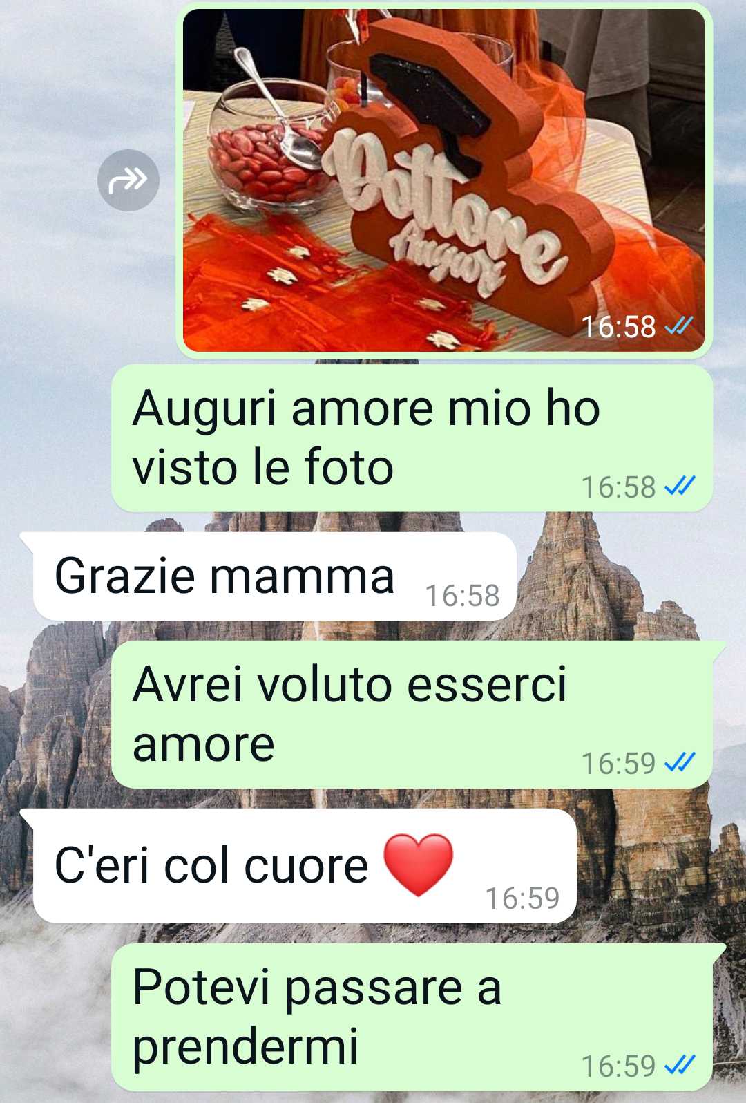Non sono stata alla laurea di mio figlio. Non gli interessava. Il mio unico figlio si è laureato. A lui non è interessato che fossi presente o meno. Gli veniva difficile venirmi a prendere. Io per ora sono in carrozzina e mi muovo male. Quindi era stressato, ed era tu?o un po’ più complicato, ma non impossibile. Ci sono rimasta abbastanza male , ma ho reagito. Mi sono sempre comportata da brava madre. Ho dato a mio figlio tu?o quello di cui aveva bisogno non soltanto economicamente. Non credo di meritare questo tra?amento. Quindi bando a tu?e le psico comprensioni, io ho seguito il mio isGnto. Gli ho de?o una cosa di cui non so se mi penGrò per il resto della mia vita. Gli ho de?o ciò che senGvo davvero, ciò che mi porto dentro da tanto. Il fa?o che a nessuno sia importato che io fossi presente alla laurea di mio figlio è solo la punta dell iceberg di una famiglia che è tale solo sulla carta. non so cosa fare. Ma tra perdere e straperdere, io preferisco solo perdere.