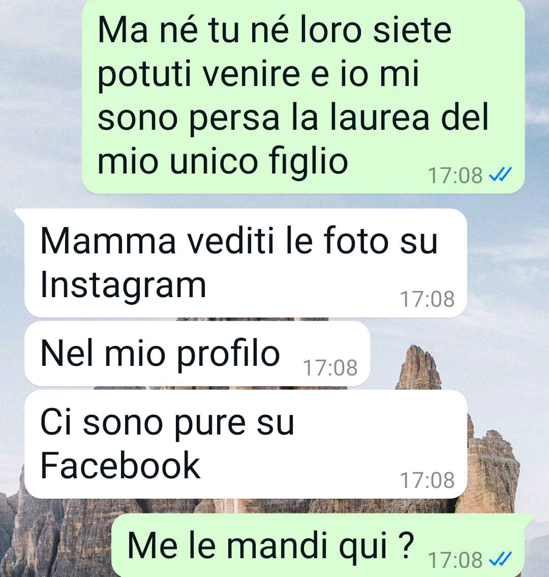 La nostra fan racconta di non essere stata presente alla laurea del suo unico figlio. Il nostro amico, spiega, non ha ritenuto fondamentale la sua presenza quel giorno. La nostra amica precisa di trovarsi attualmente in carrozzina e di avere difficoltà negli spostamenti. Per partecipare alla cerimonia avrebbe avuto bisogno di essere accompagnata, ma al figlio l’idea di andarla a prendere risultava complicata e fonte di stress.