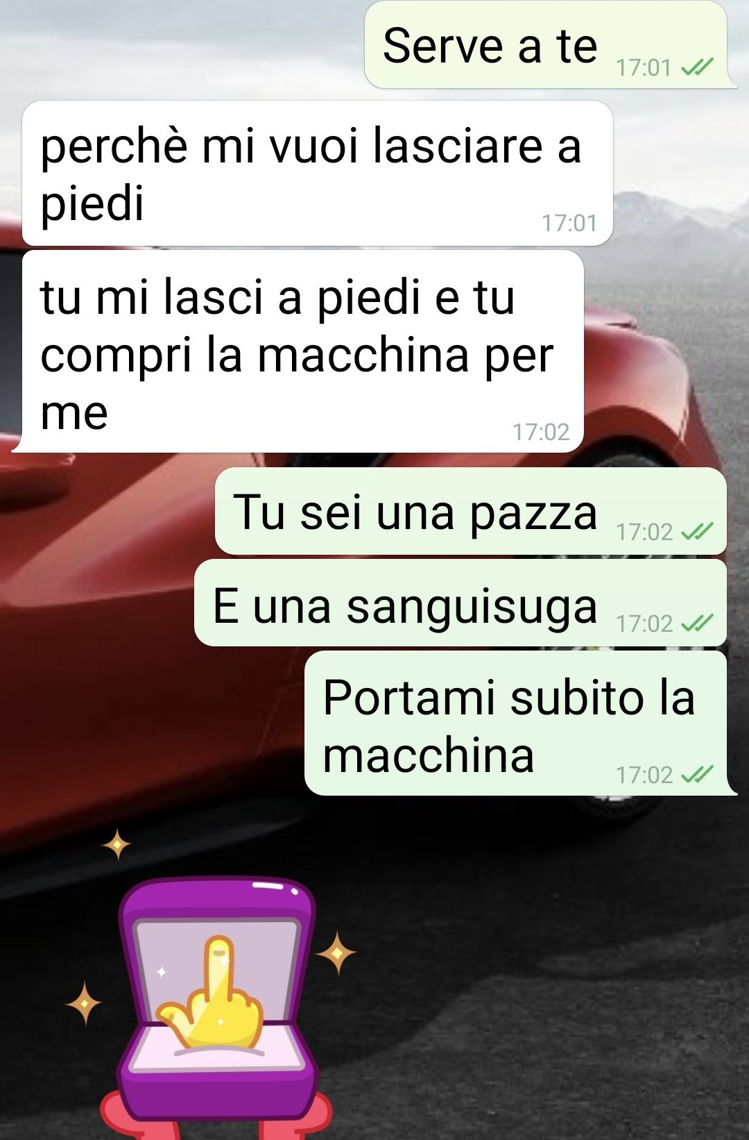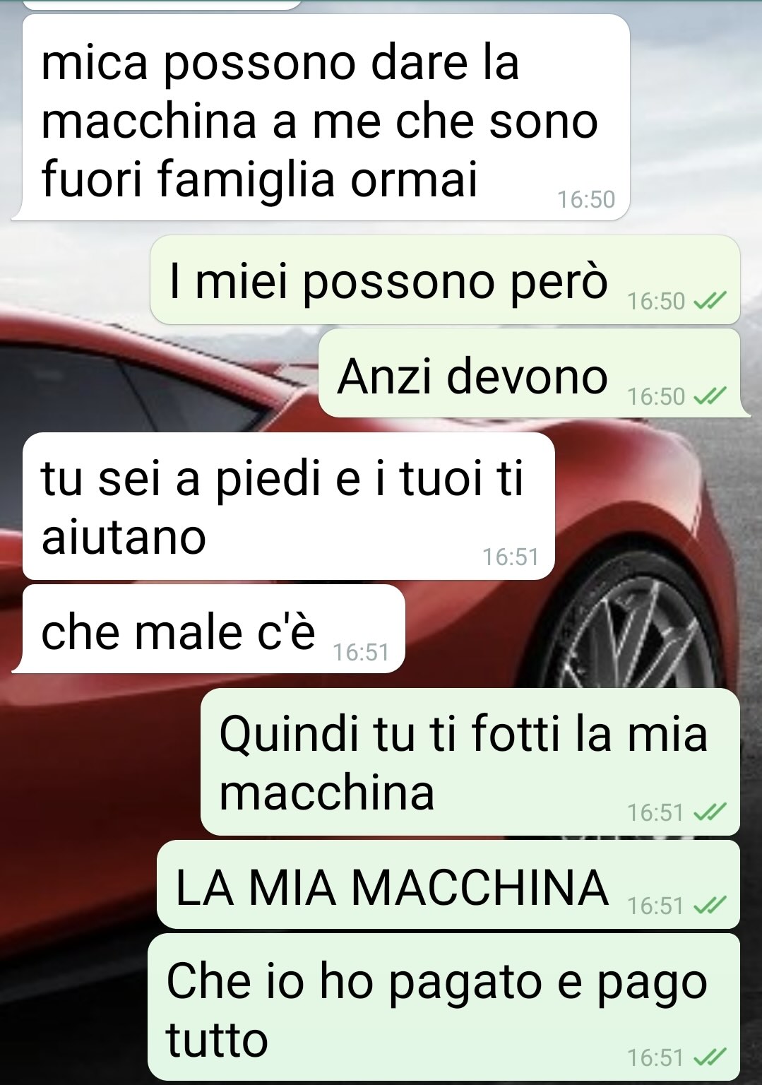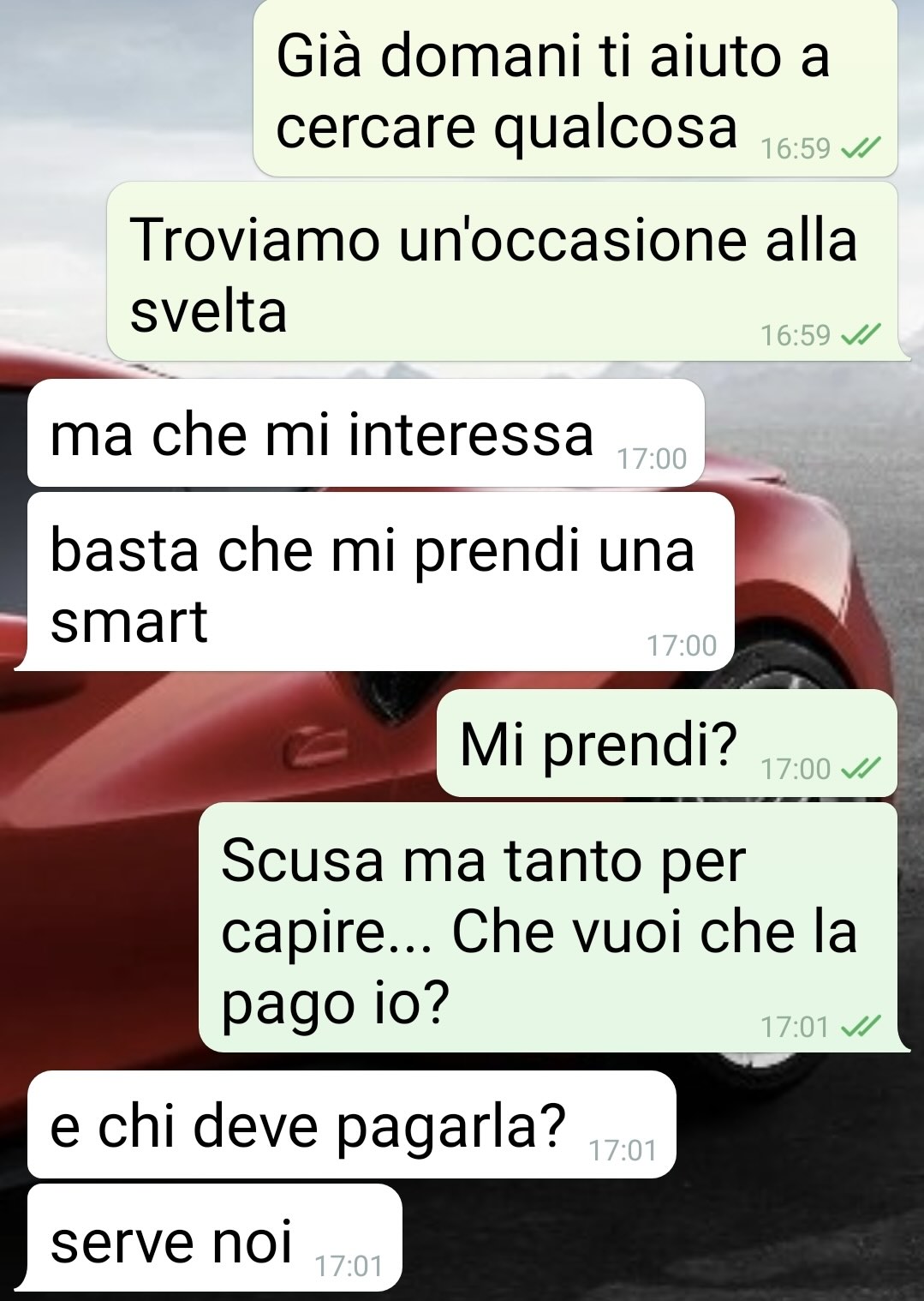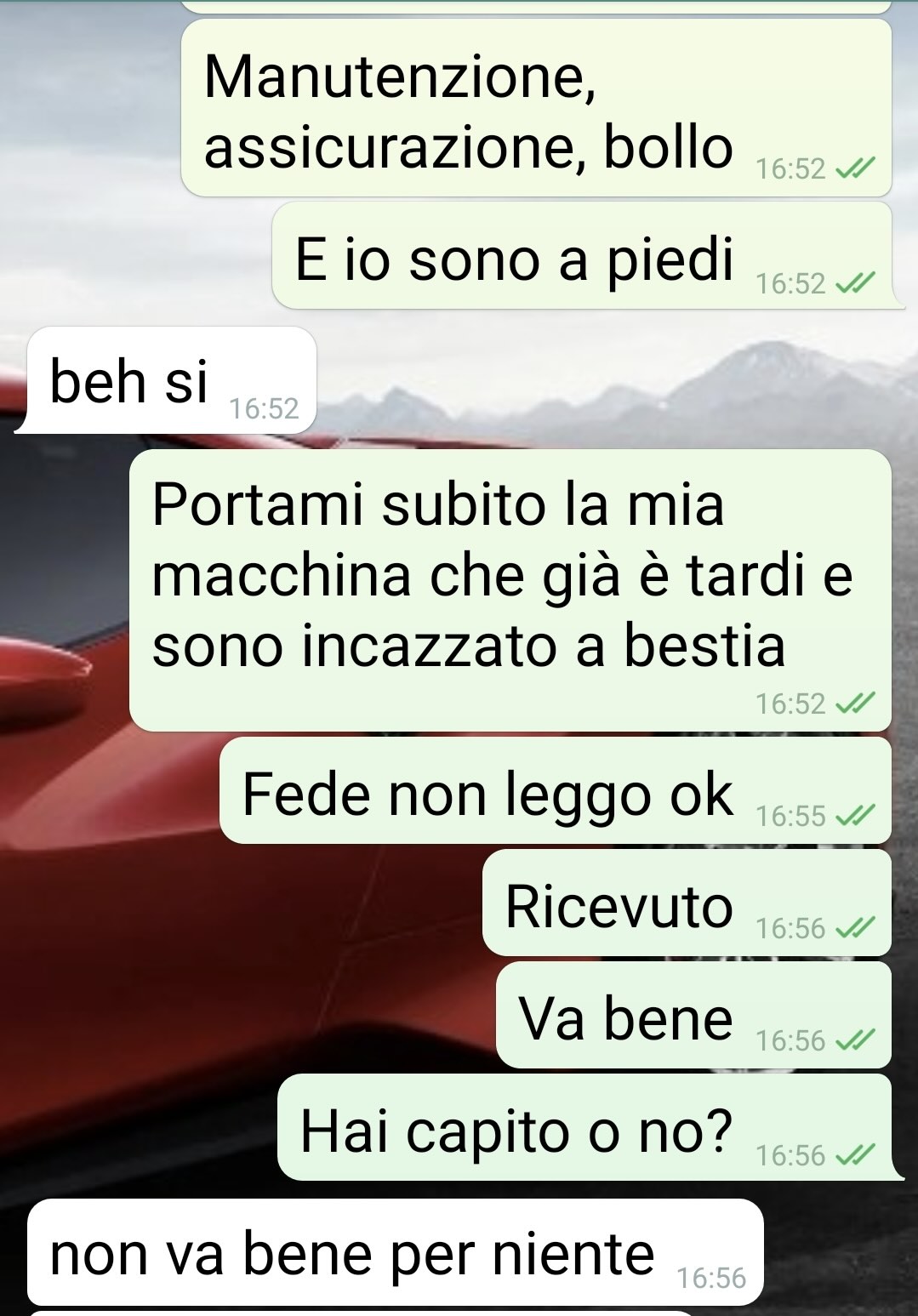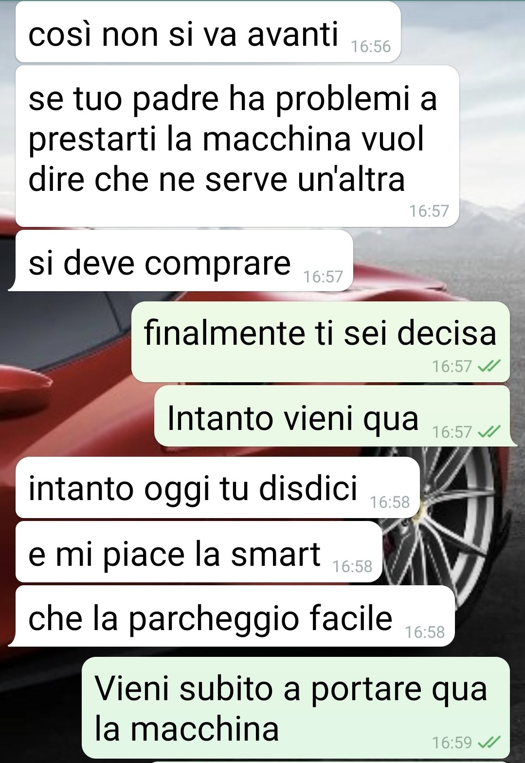 La discussione, avvenuta qualche ora prima dell’invio della chat, è ancora calda nel racconto del nostro fan, che specifica come siano ormai le 19 e lui stia ancora aspettando il rientro della fidanzata con l’auto.