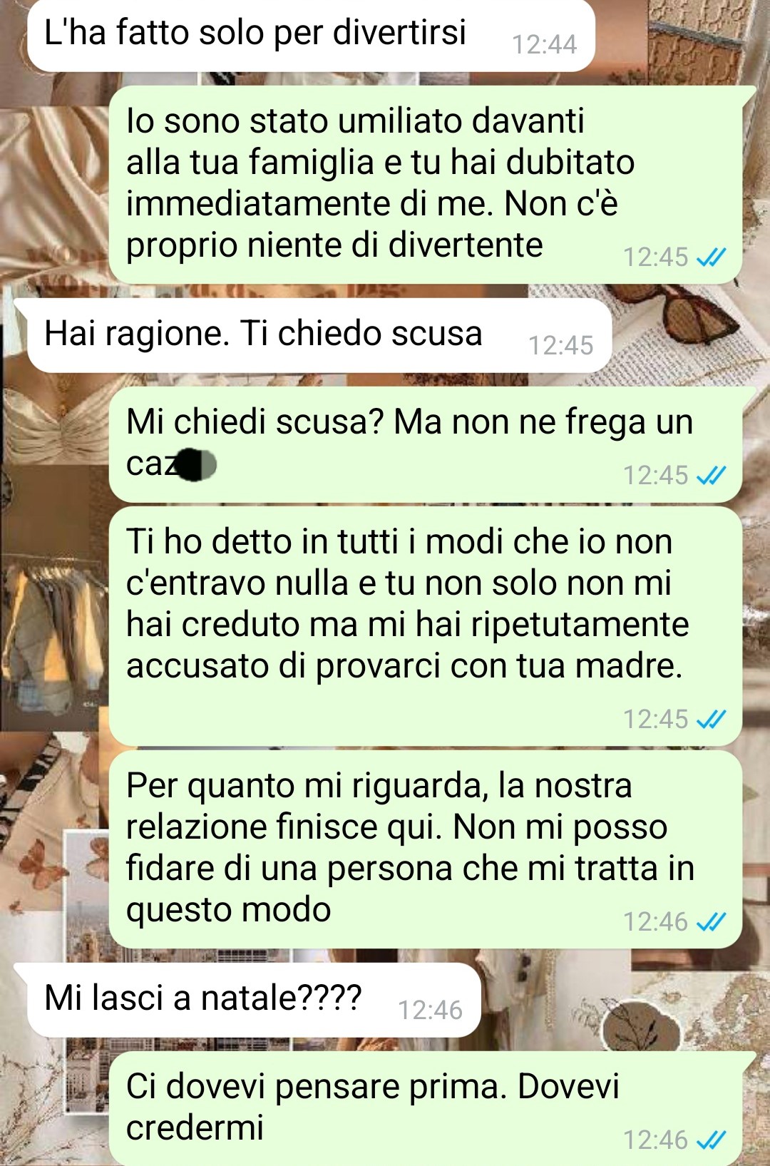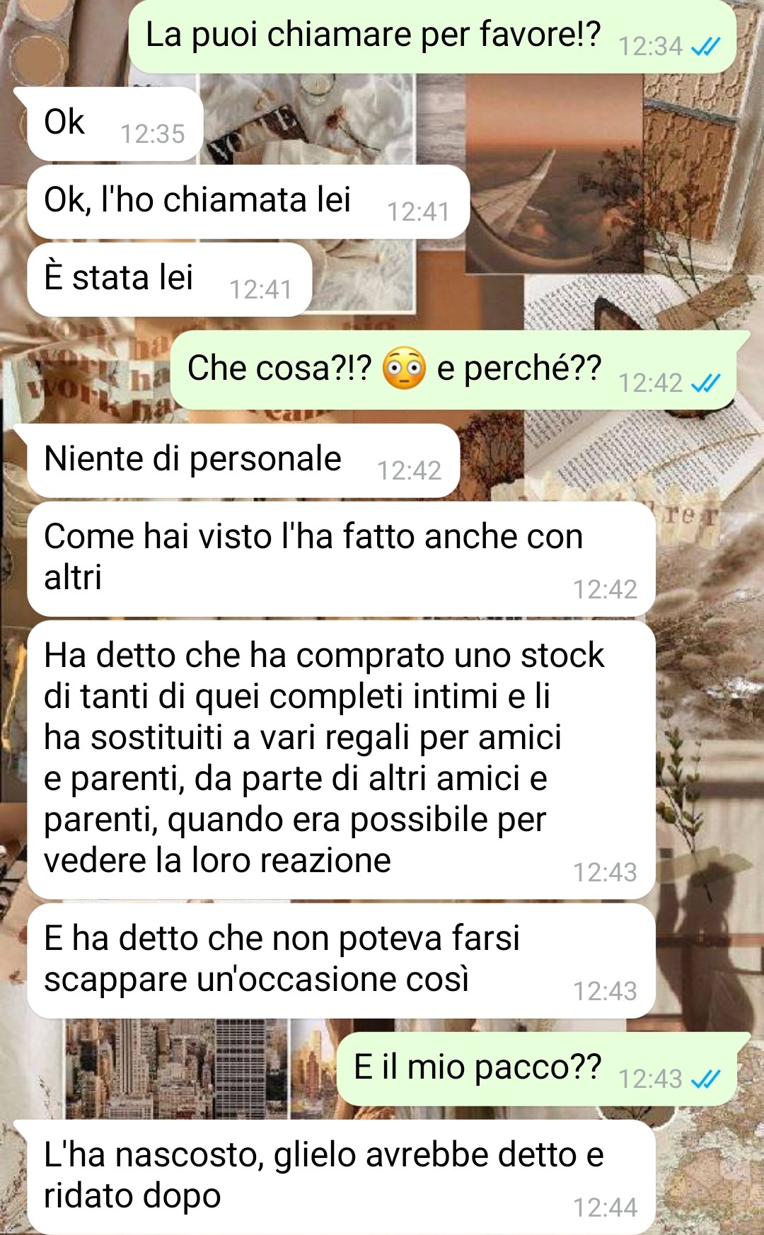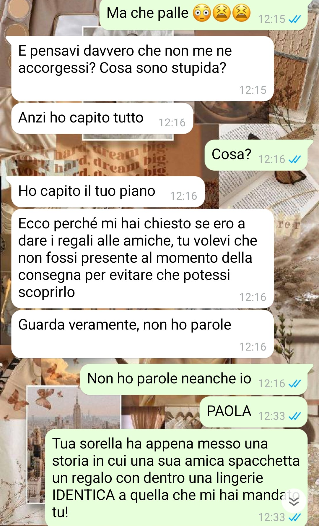 Durante l’estrazione casuale, il follower ha scoperto che doveva fare il regalo alla madre di Paola, la ragazza con cui ha una relazione da alcuni mesi. Ha informato la fidanzata della situazione e ha proceduto tranquillamente all’acquisto del dono, aspettando il giorno stabilito per l’apertura dei regali. Tuttavia, le cose non sono andate come sperava e subito dopo l’evento ha ricevuto un messaggio da Paola che si mostrava piuttosto arrabbiata per quanto accaduto, lasciando intendere che qualcosa nel regalo o nella situazione non aveva soddisfatto le aspettative.