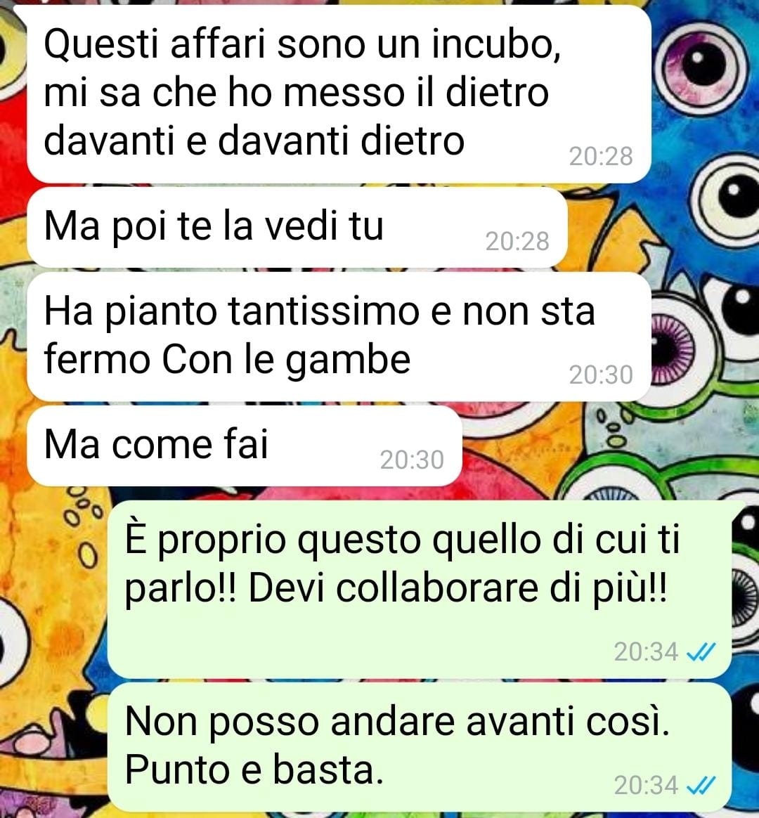 Nonostante abbia desiderato il bambino tanto quanto la moglie, Aldo si è convinto di non essere capace di occuparsene, limitandosi ai momenti di gioco e coccole. Tutto il resto – cambio pannolini, levatacce notturne, gestione dei momenti difficili – è ricaduto interamente su di lei.