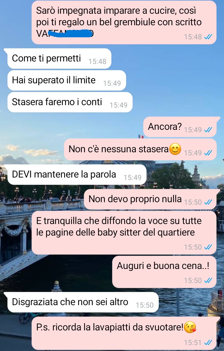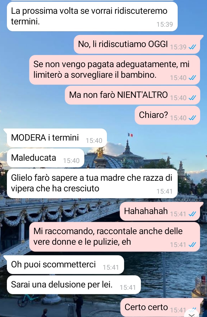 Tuttavia, con una particolare signora la situazione ha preso una piega inaspettata: quello che doveva essere un normale lavoro di baby-sitting si è gradualmente trasformato in un servizio domestico completo. L’amica si è ritrovata a dover gestire bucato, sistemare camerette, svuotare la lavastoviglie e stirare camicie, tutto senza ricevere alcun compenso aggiuntivo e spesso senza il rispetto degli orari concordati. Nonostante la sua naturale timidezza, la follower ha finalmente deciso di reagire e confrontarsi con la datrice di lavoro, spinta dalla convinzione che il lavoro debba essere sempre retribuito adeguatamente e che l’essere giovani non debba mai essere un pretesto per permettere ad altri di approfittarsene.