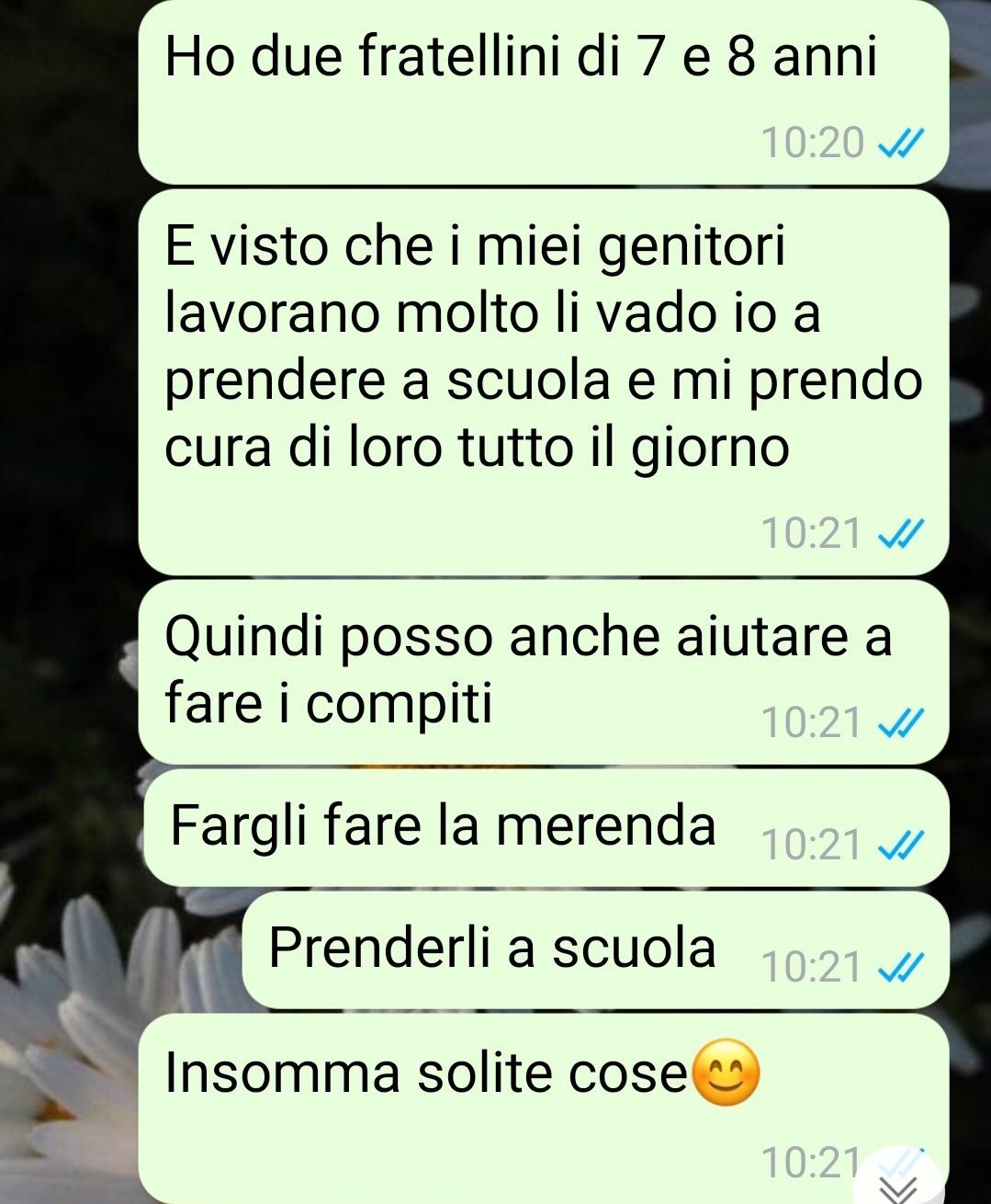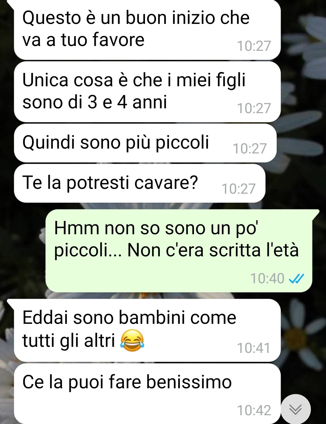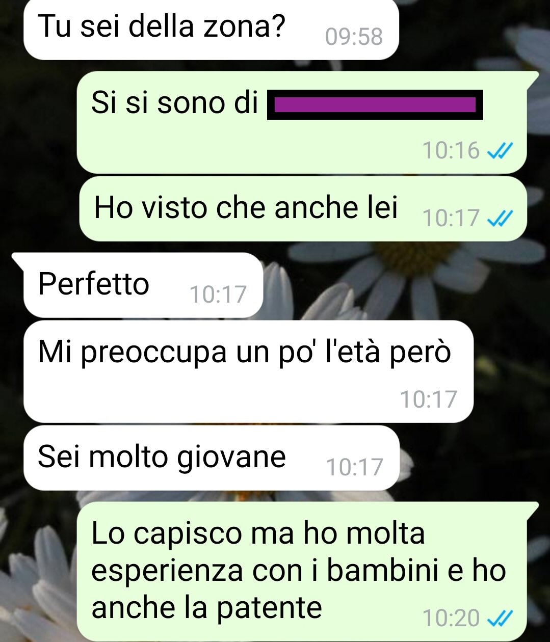 Mi chiamo Mara e ho 19 anni. Quest’anno faccio la maturità e ho deciso che invece di andare in vacanza, come tutti i miei coetanei, voglio lavorare per poi iniziare l’università con qualche soldino. Quindi ho deciso di cercare qualche annuncio su internet/facebook ecc, come babysitter, aiuto compiti, dog sitter e cose così. Su un gruppo di Facebook ho trovato l’annuncio di una signora della mia città che cercava una babysitter per il mese di luglio, ma aveva scritto solo “ Cerco babysitter per il mese di luglio, no perditempo, solo gente per bene e seria”. Quindi visto che er a della mia città ho pensato di scriverle per avere più info e farle sapere che ero interessata. E niente, da qui in poi vi mando gli screen perché sono rimasta senza parole. Ho deciso di condividerli perché è stata proprio una conversazione assurda e anche se ho 19 anni credo di avere la maturità per dire che io non mi sarei mai comportata come la signora… Però magari sono io che sbaglio e ho una mentalità strana… Non so, ditemi voi che ne pensate.