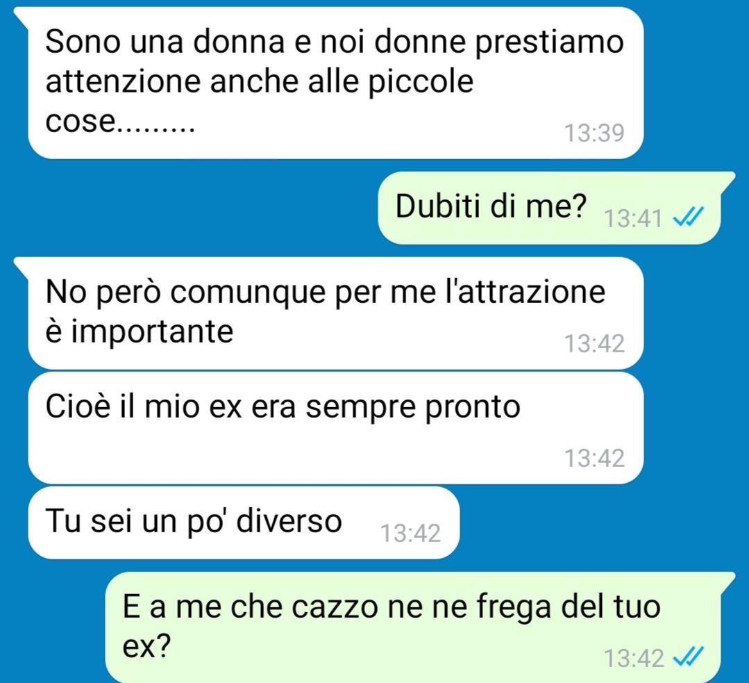 Proprio a seguito di questo confronto, Filippo ha deciso di condividere la conversazione con Commenti Memorabili, spinto dal desiderio di comprendere meglio le dinamiche psicologiche e comportamentali che possono emergere in un rapporto sentimentale. Le sue parole lasciano intendere un certo grado di confusione e riflessione personale: inizialmente convinto delle proprie ragioni, ammette di aver iniziato a rivedere alcune posizioni, riconoscendo che forse la ragazza non aveva tutti i torti.