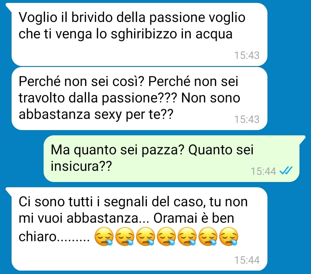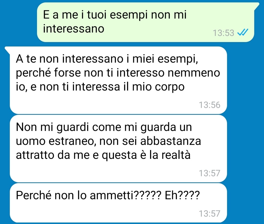 Secondo Filippo, arrivare a questa consapevolezza è un passo importante, anche se non semplice. La sua esperienza mostra quanto possa essere complesso mantenere una relazione stabile quando uno dei due partner non si sente pienamente appagato o compreso. L’invio della conversazione nasce quindi dal bisogno di confrontarsi, di capire meglio se stessi e anche di misurarsi con i pensieri e i giudizi altrui, per trovare magari un po’ di chiarezza.