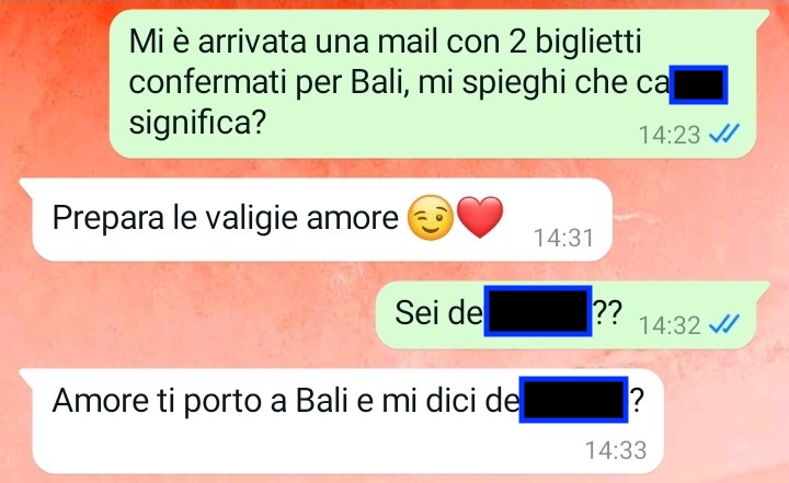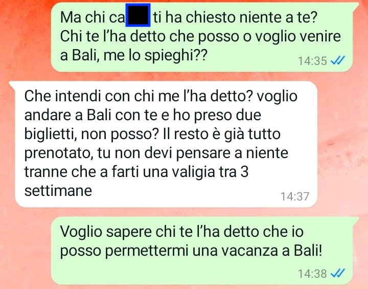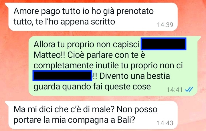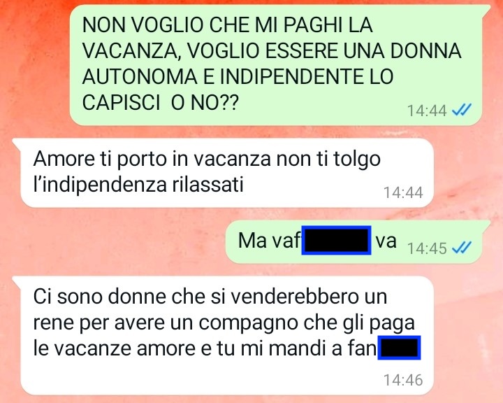 Sono Tiziana e oggi ho avuto una prova del nove davvero importante e fondamentale per me, una prova del nove che mi ha dato la conferma che tanto temevo: sto con una persona che non ha la minima idea di cosa significhi avere rispetto per il lavoro, i sacrifici e l’indipendenza della propria compagna. In pratica mi sono resa conto di condividere il mio tempo con una persona totalmente insensibile e priva di empatia o comprensione, una persona che crede di poter fare la spavalda a suo piacimento, predisponendo della mia vita, delle mie scelte personali e del mio tempo libero senza nemmeno chiedere il permesso o consultarmi. Leggete la conversazione che vi ho inviato per comprendere di cosa sto parlando e sono certa che condividerete quello che penso. Mi scuso in anticipo se vi troverete di fronte ad un linguaggio sboccato che vi assicuro non mi appartiene per niente, ma oggi non ci ho visto proprio più dalla rabbia.