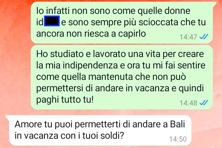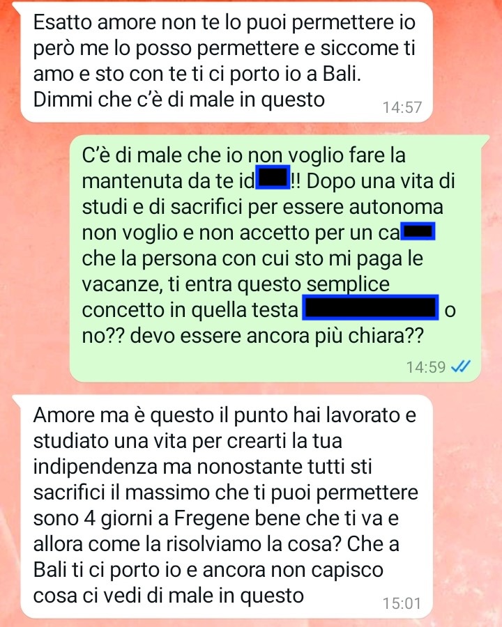 Tiziana ci racconta di essersi ritrovata, suo malgrado, a dover fare i conti con l’atteggiamento del compagno, che ha preso decisioni importanti che riguardano la sua vita personale senza nemmeno interpellarla. Secondo il suo racconto, lui si è permesso di organizzare, decidere e pianificare il suo tempo libero in totale autonomia, come se le sue giornate, i suoi impegni e i suoi sacrifici fossero dettagli trascurabili.