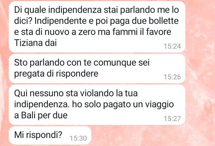 Il punto di rottura è arrivato proprio in occasione di questo episodio, che Tiziana ha deciso di raccontare attraverso una conversazione che ha voluto allegare. In essa si evidenzia tutto il suo disappunto, ma anche la sua determinazione nel difendere il proprio spazio, il proprio lavoro e la propria autonomia.