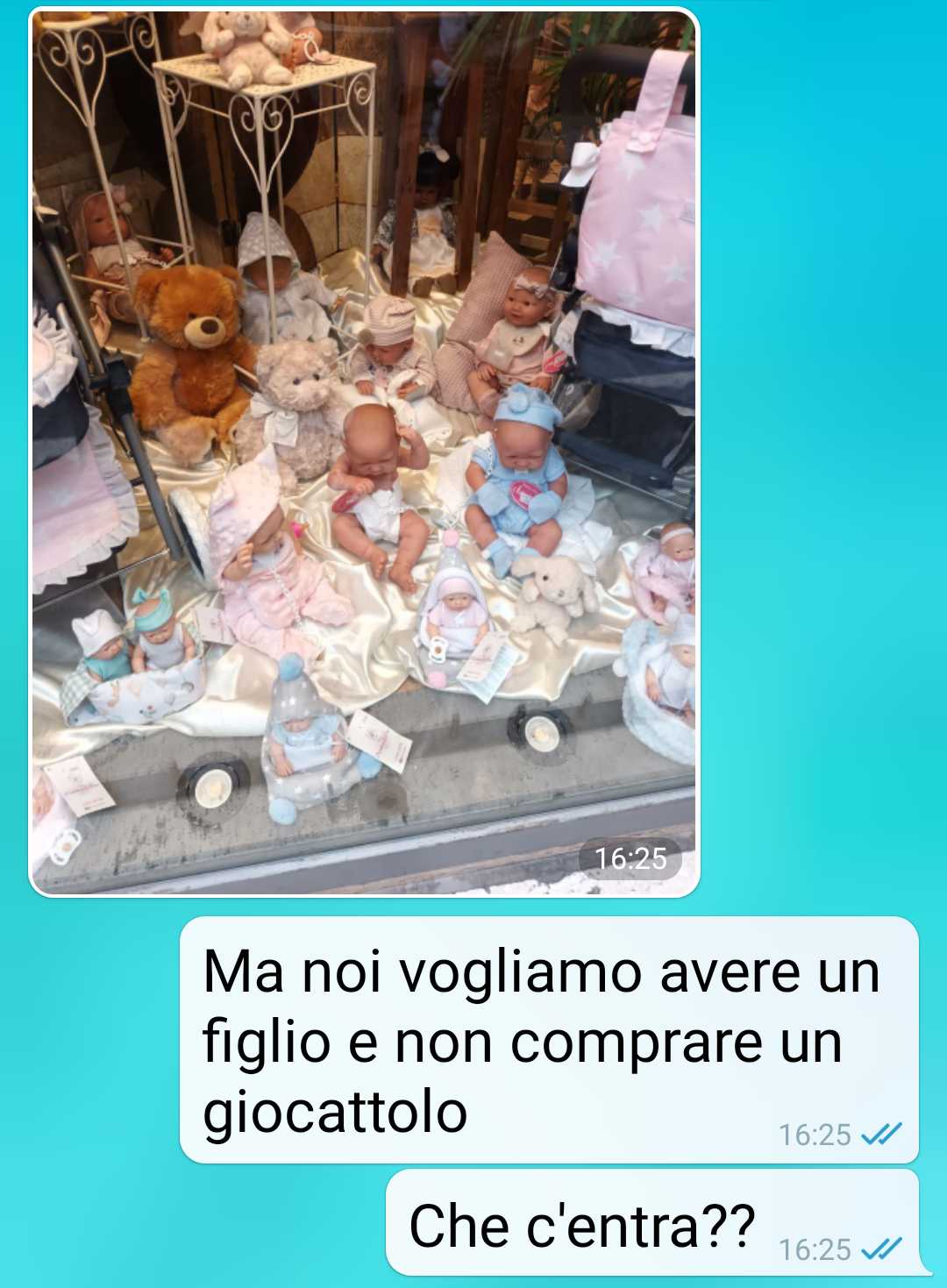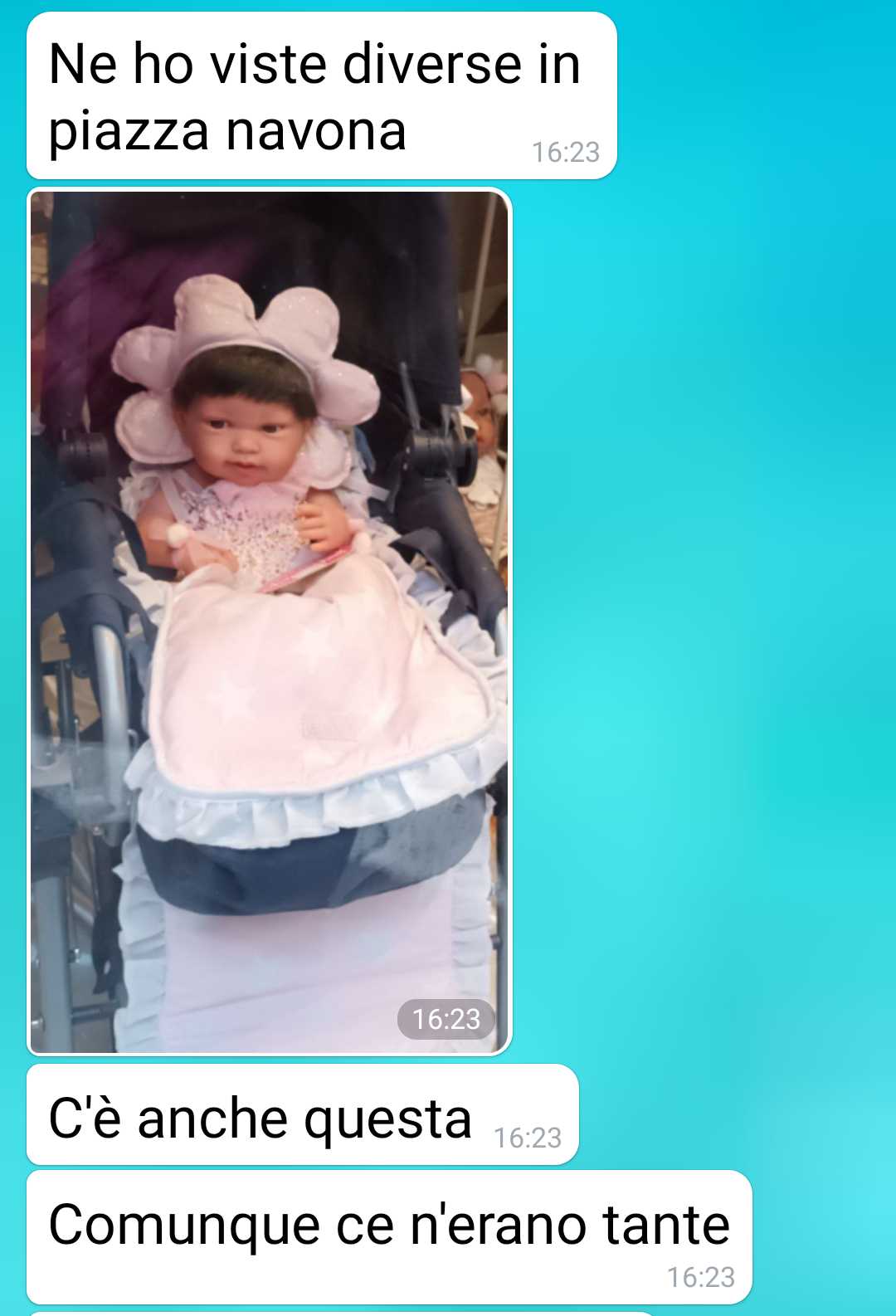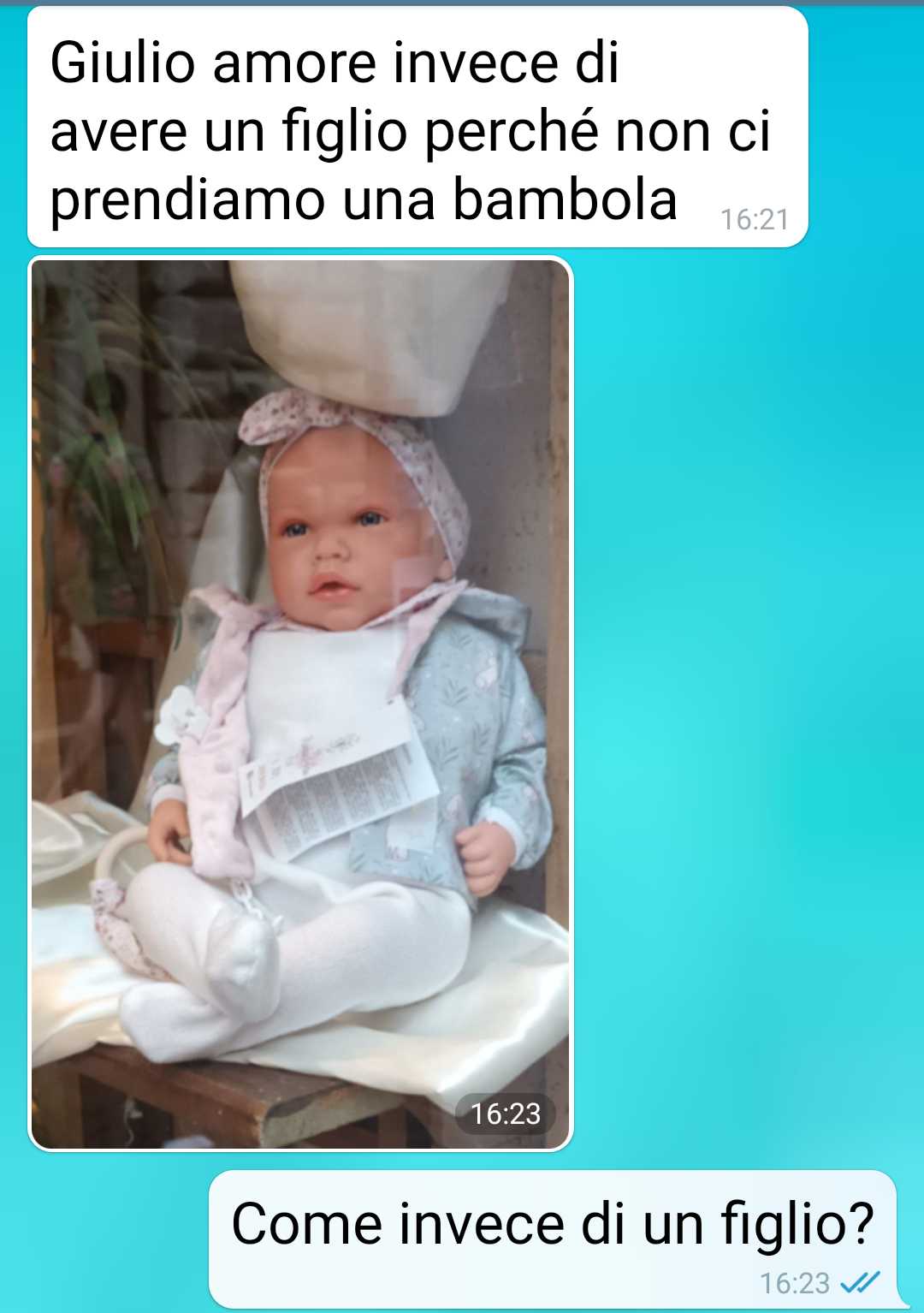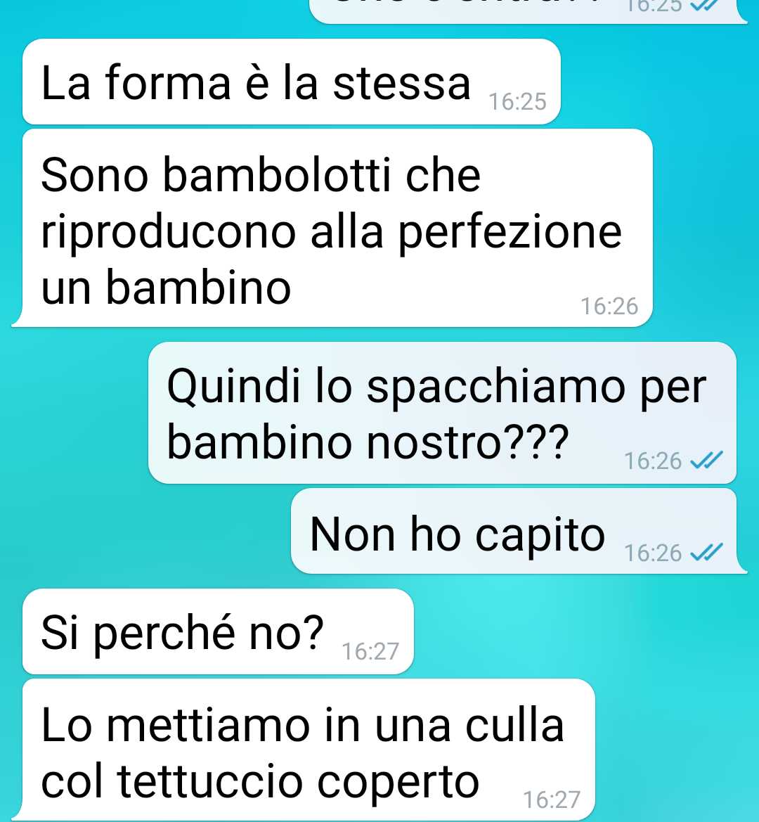 La mia compagna Donatella e io vorremo avere un figlio. Lei però pensa ad avere una bambola. La mia compagna è una biologa, per lei tutto quello che succede ha una dimensione molecolare. È sempre che cerca di ottimizzare, di fare le cose nella maniera più veloce e pratica. Col minimo spreco di risorse. Ha proprio una mente razionale. Io sono una persona un po’ più romantica di lei. E voglio davvero un bambino. Lo so, sembra strano detto da un uomo. Ma sento la voglia di paternità. Ho l’età per averlo, ho le risorse, sono pronto. Ma la mia compagna nell’ottica di ottimizzare pensa alle bambole reborn. Leggetevi la chat per sapere cosa mi ha scritto e perche le vuole. Scriverei un papello lunghissimo altrimenti. Non mi sono mai piaciute ste bambole che sembrano bambini veri. Mi fanno un’impressione pazzesca. Certo so che sono terapeutiche e quindi ci sta. Ma la mia compagna non ha ben capito il senso di terapeutico o forse lo ha capito troppo bene. L’ossitocina è l’ormone dell’amore. Il nostro corpo comincia a produrlo dopo 5 secondi di un abbraccio sincero. La serotonina è il neurotrasmettitore del buon umore. Si sviluppa quando facciamo una cosa che ci soddisfa e ci fa stare bene. A me della biochimica non frega nulla. So solo che vorrei un figlio…