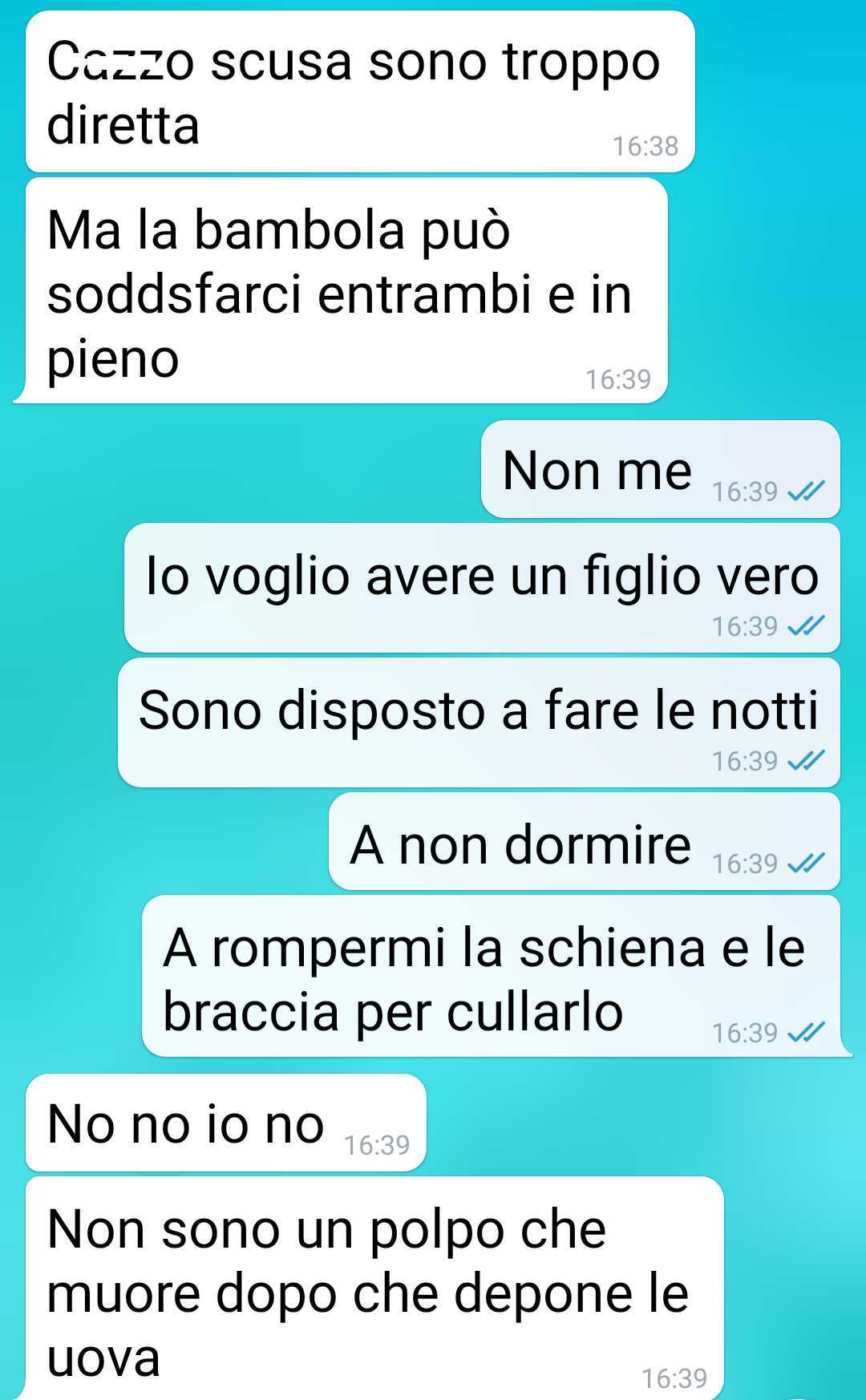 Secondo quanto racconta, lei vede in queste bambole una possibile soluzione temporanea, forse una forma di simulazione della maternità, forse una risposta alla necessità di stimolare emozioni e sensazioni che, nella sua visione biochimica, sono legate agli ormoni come ossitocina e serotonina. Il nostro fan, invece, percepisce questa proposta come un segnale di chiusura nei confronti di un desiderio che per lui è reale, concreto e umano.