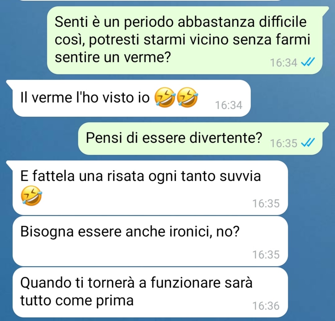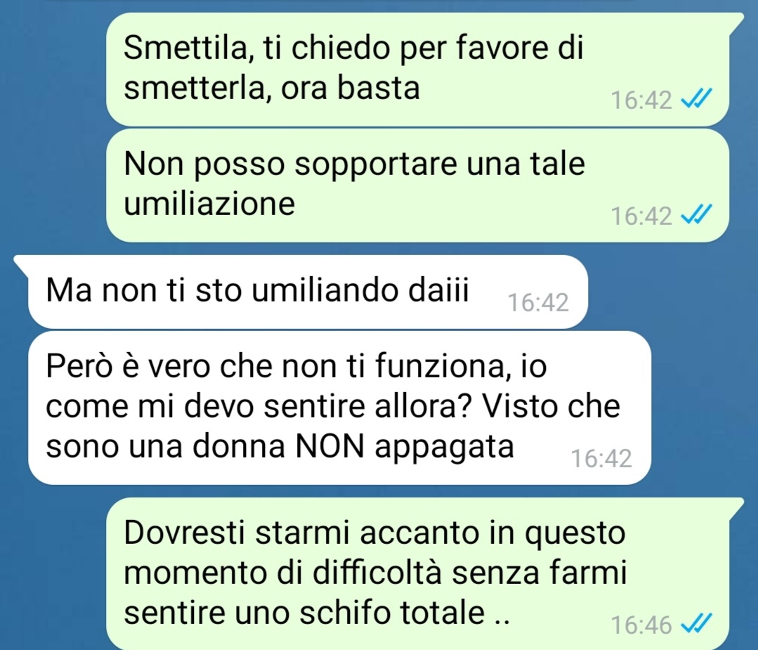 Voglio restare anonimo perché questa condizione mi sta facendo tanto soffrire. Ormai non ne posso più, è qualche settimana che combatto contro un male che rovina la vita di un uomo. Non posso più avere la mia intimità, ma sto curando e spero di risolvere il prima possibile. Il problema è che la mia compagna non vuole aspettarmi, anzi, mi tratta come se fossi un malato e una persona da bandire. Si può essere tanto insensibili? Mi sento con l’umore a terra, mi sento solo, non amato e tanto depresso per la mia condizione. Sì mi sento un uomo a metà, perché, fino a quando durerà questa tortura?