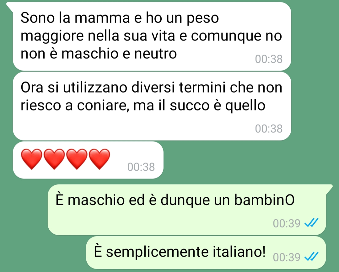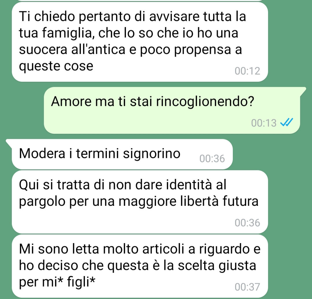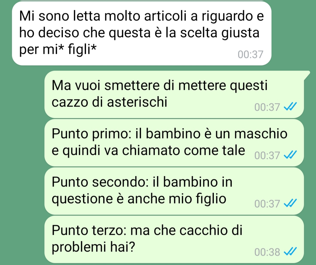 “Sono una guardia e il mio lavoro notturno è davvero stancante. Ma questo diventa ancora più stancante quando hai una moglie che ti tartassa per messaggi come del idee del tutto fuori dal comune. Stiamo per avere un figlio maschio, un bambino a cui io non vedo l’ora di insegnare il calcio e tutte le altre cose da maschietto!! Fantastico no? Sì, finché mia moglie non mi ha detto che vuole fare in modo che nostro figlio cresca neutro, ovvero senza attribuirgli un genere specifico. Ma davvero da di moda questa cosa? Cioè, io dovrei attenermi al suo volere? Certo che no, per questo sto cercando un modo per portarla con i piedi per terra!!”