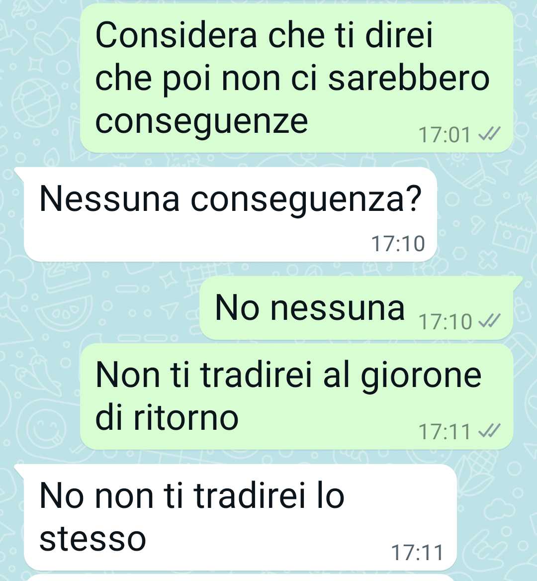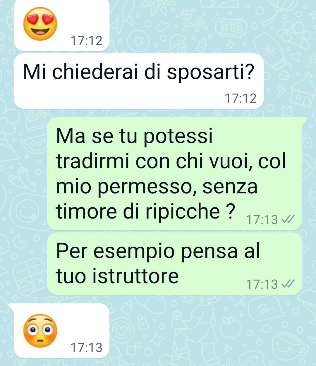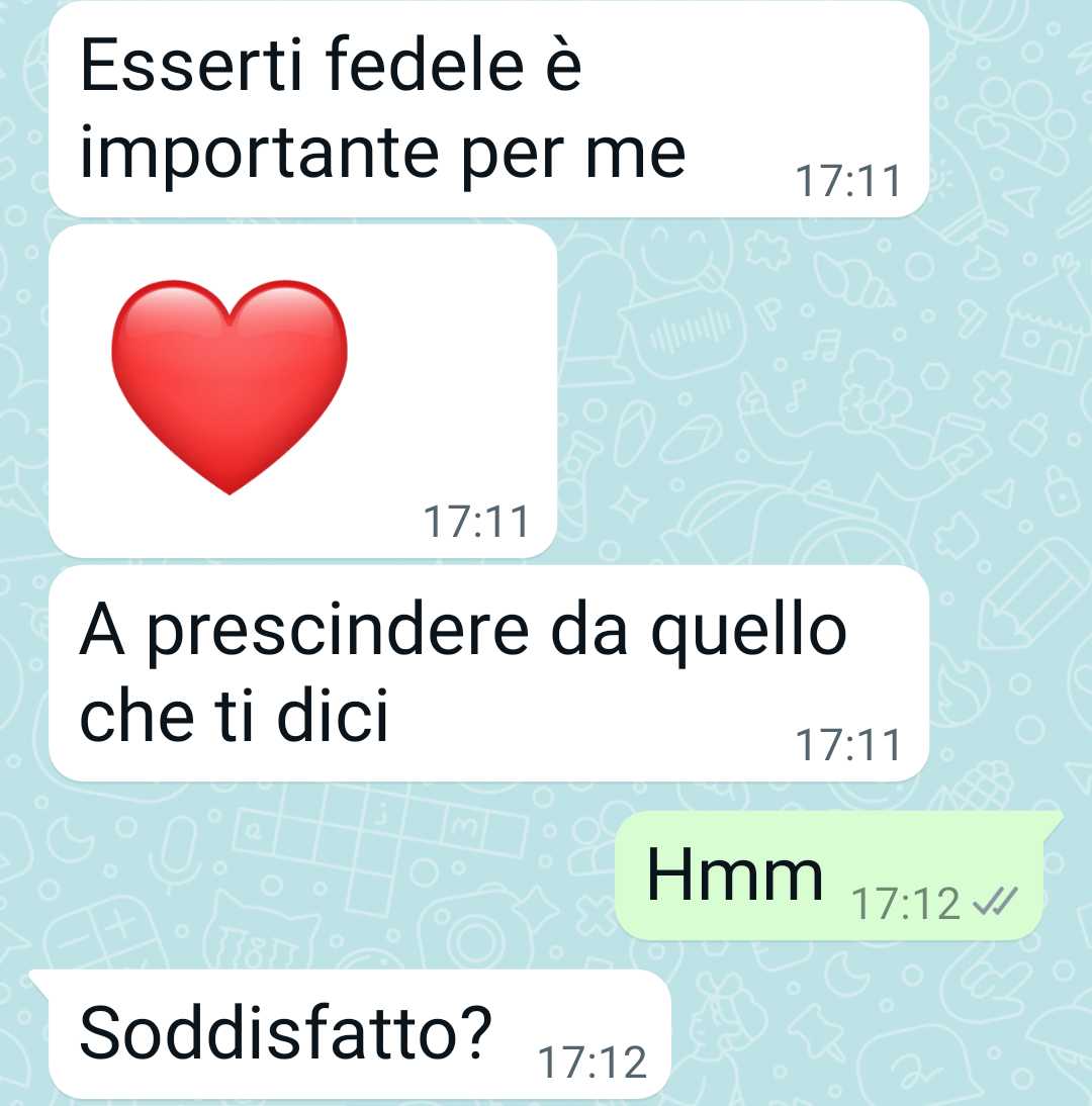 Un nostro fan di nome Alberto ha raccontato la sua esperienza personale riguardante una relazione importante. L’amico spiega di aver avuto l’intenzione di sposare la sua compagna Betta, ma prima di compiere questo passo decisivo ha voluto metterla alla prova con quello che lui definisce un “piccolo test”. Secondo quanto scrive, Betta non ha superato questa prova, lasciandolo deluso e spingendolo a riflettere sul loro rapporto.