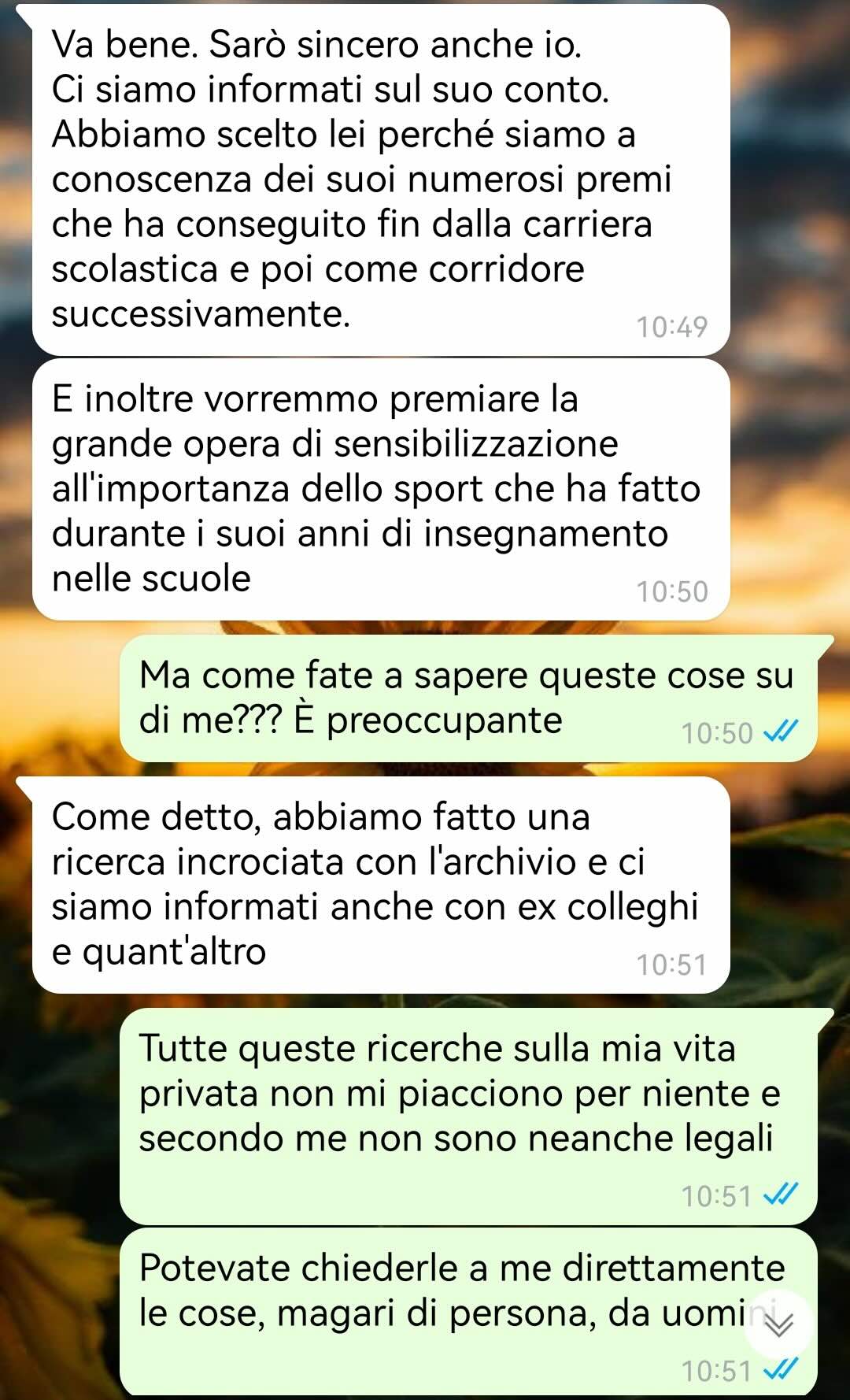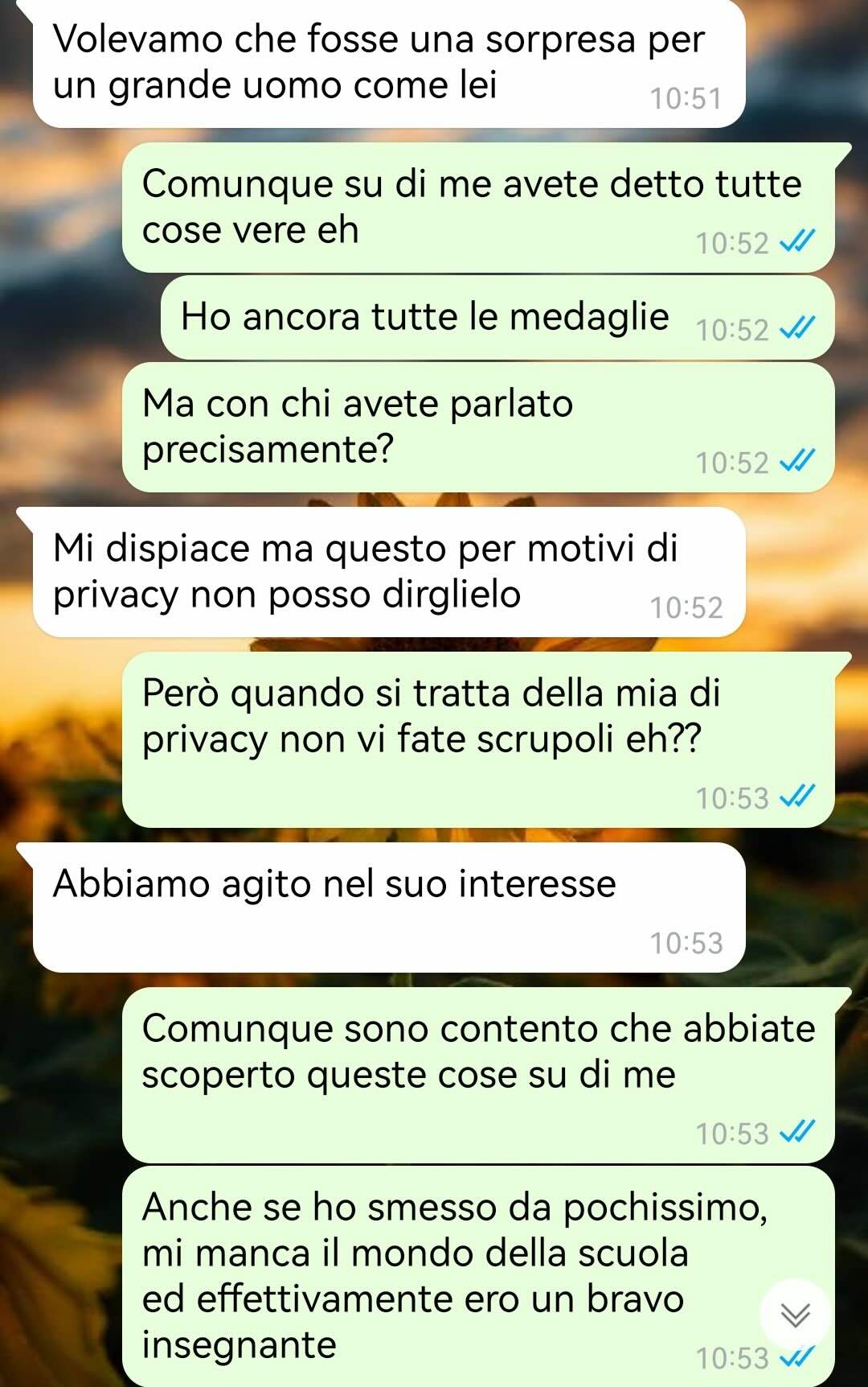 Il nostro fan ha deciso di raccontare un episodio profondamente ingiusto che lo ha colpito, pur mantenendo l’anonimato. A sessantacinque anni, ripercorre con fierezza una vita dedicata allo sport e all’insegnamento. Fin da giovane si è distinto come corridore, vincendo numerosi premi e riconoscimenti già ai tempi della scuola. Dopo aver lasciato l’agonismo per motivi di studio, si è laureato e ha iniziato a insegnare educazione fisica nelle scuole superiori.